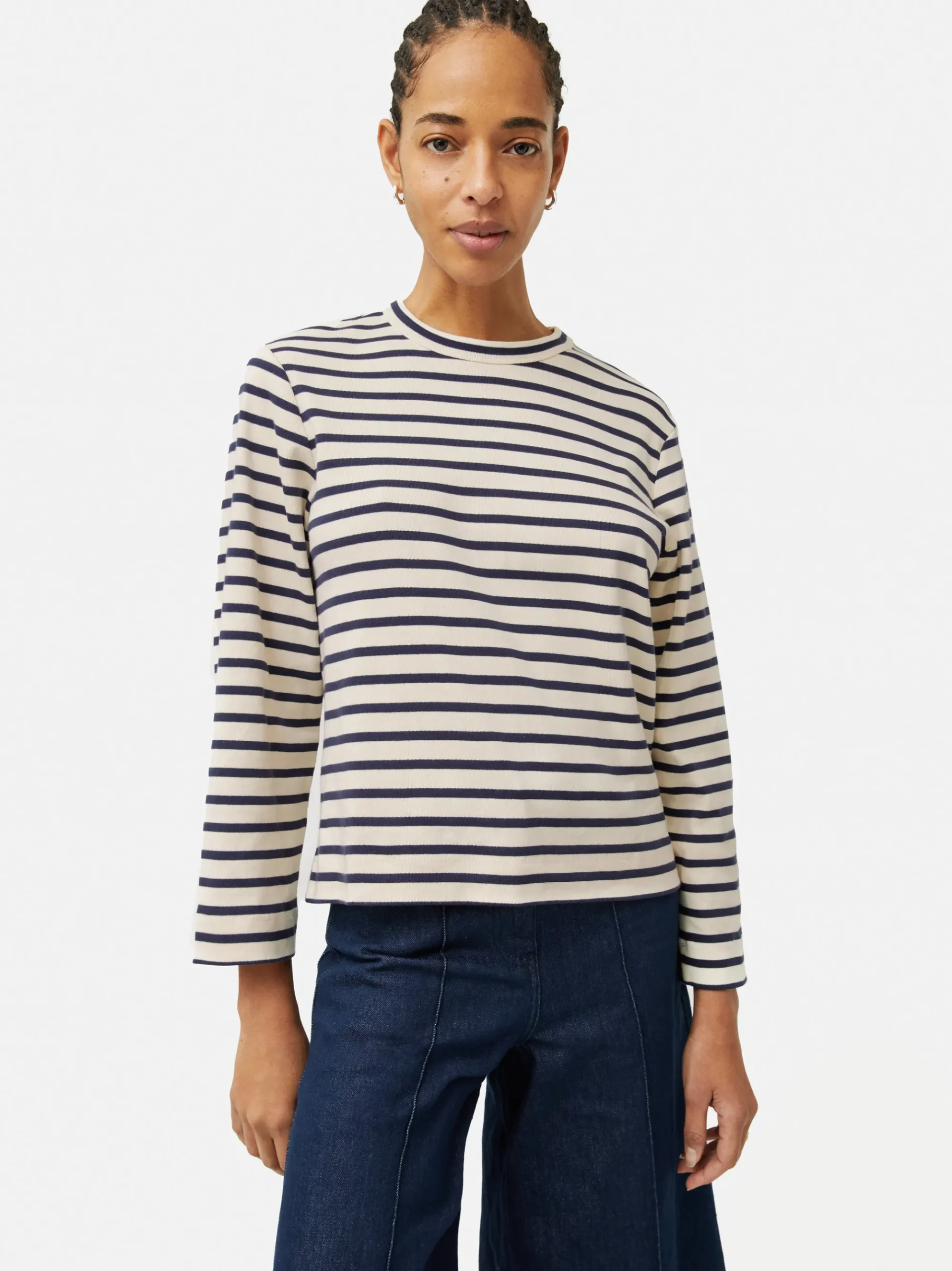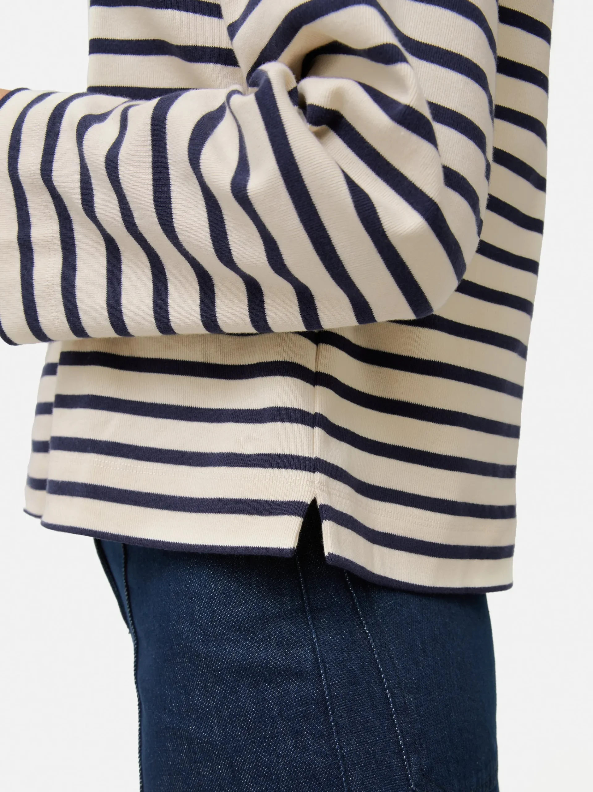 Welcome back the timeless nautical trend with this Breton striped sweatshirt in classic navy and ecru hues. Designed with a heavy cotton fabric for a relaxed, boxy silhouette, it embodies the essence of mariniere classics that is only complemented by indigo denim separates and tan suede accessories.