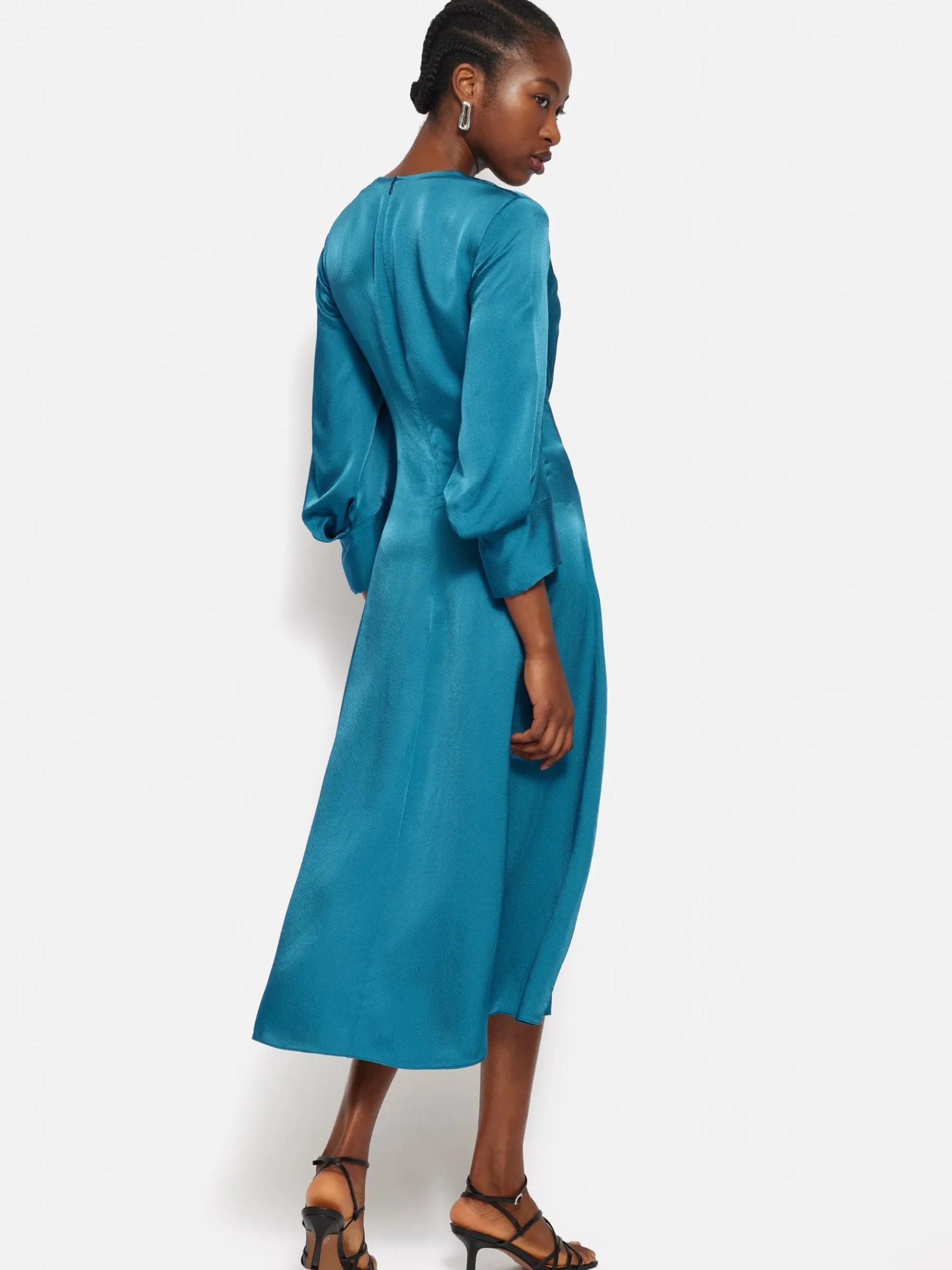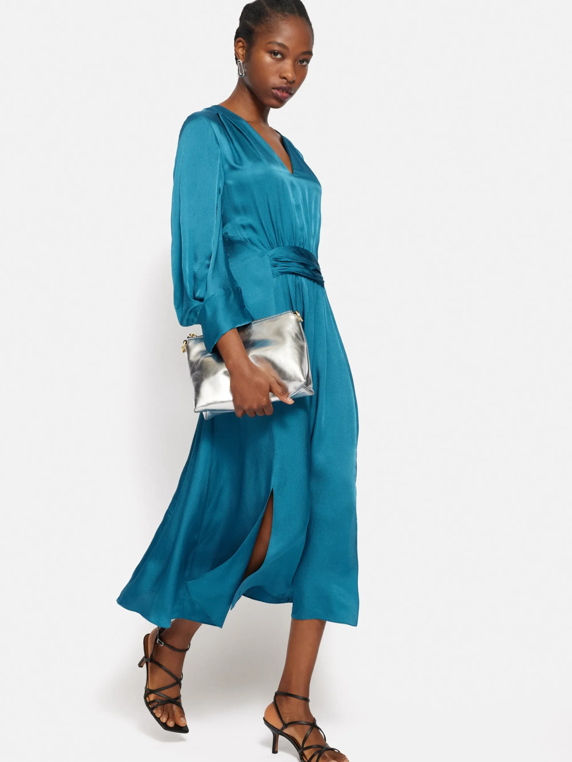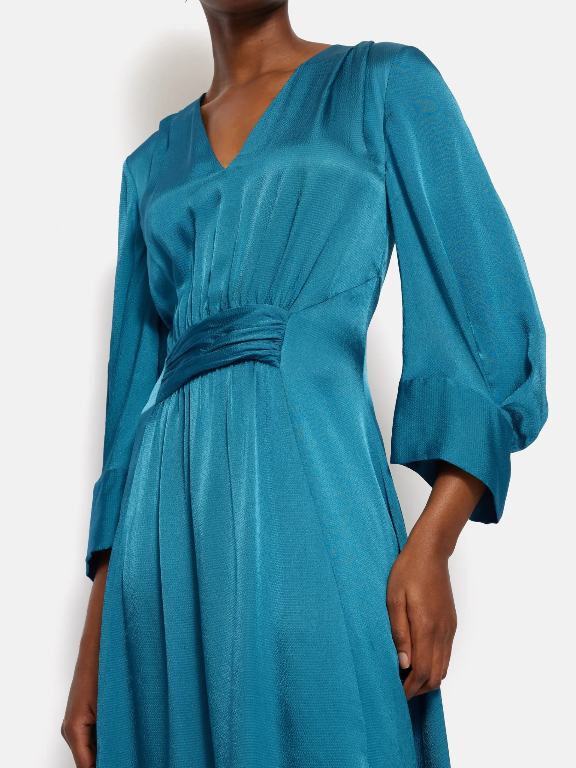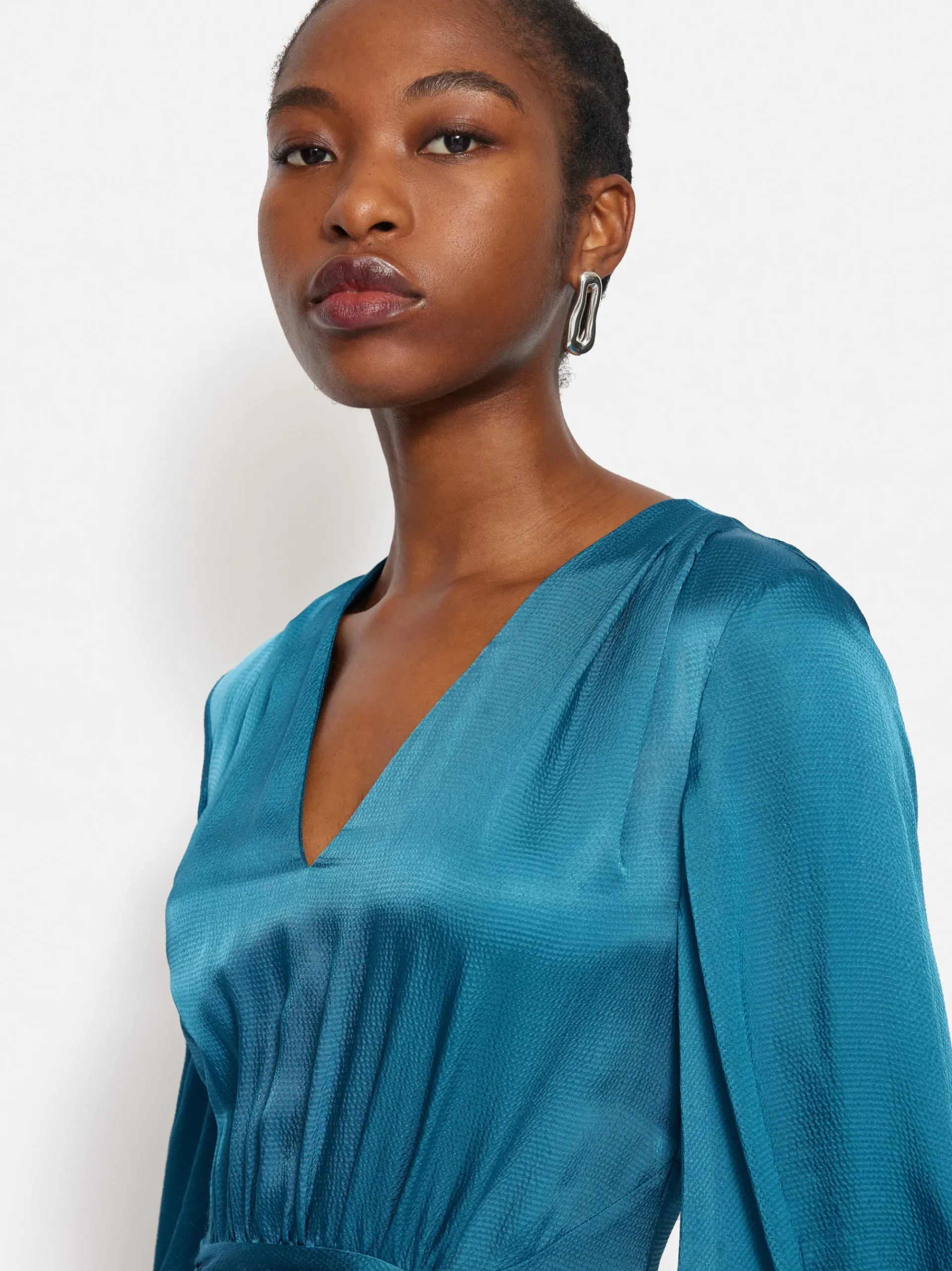 Step-up your occasionwear this summertime. Discover one-tone perfection with our Hammered Satin Midi dress, featuring elegant three-quarter length sleeves, a V-neck and side splits – imagined in an exquisite jewelled Parisian blue hue. A feminine ruched panel at the waist sculpts the silhouette, creating a flattering shape.