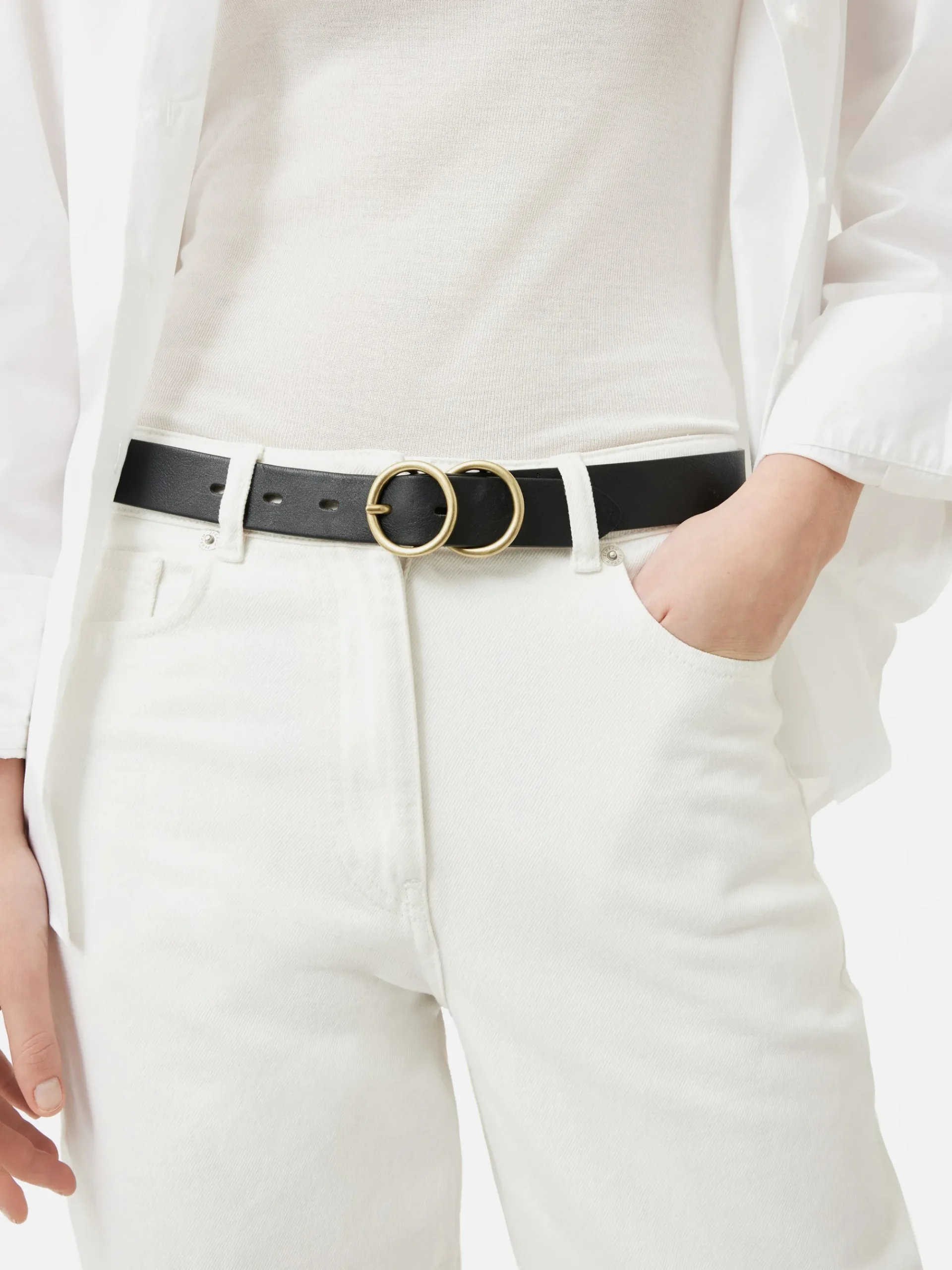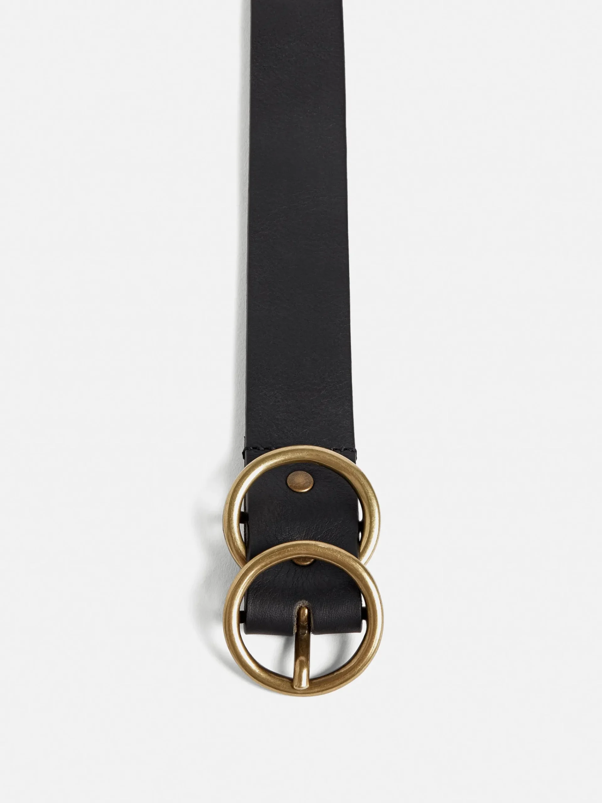 Our Carlos leather belt has been crafted from 100% Italian leather. The dual buckle detail is a modern take on classic shapes in gold metal hardware, for a sleek polish to a pair of jeans or a dress.
