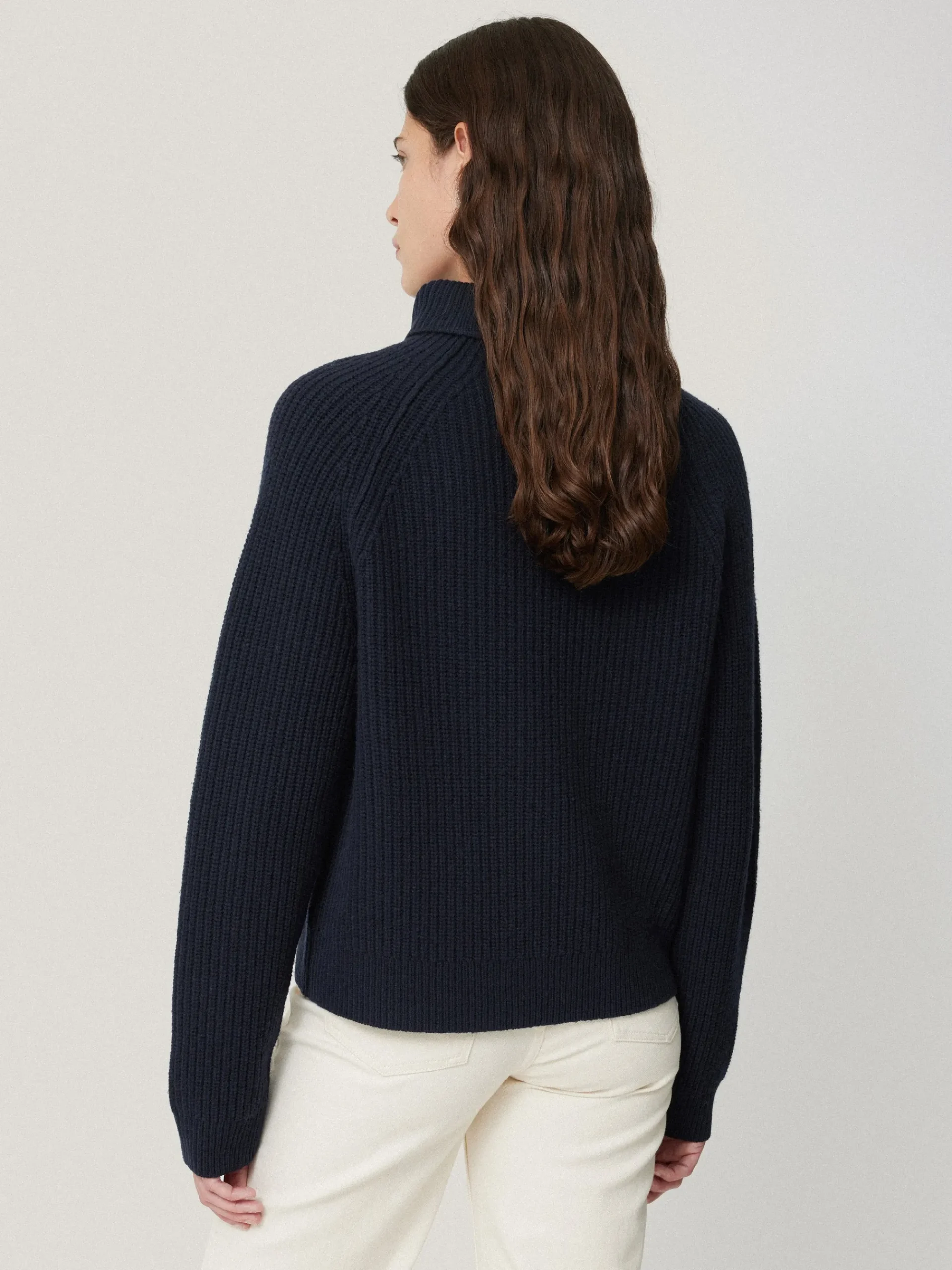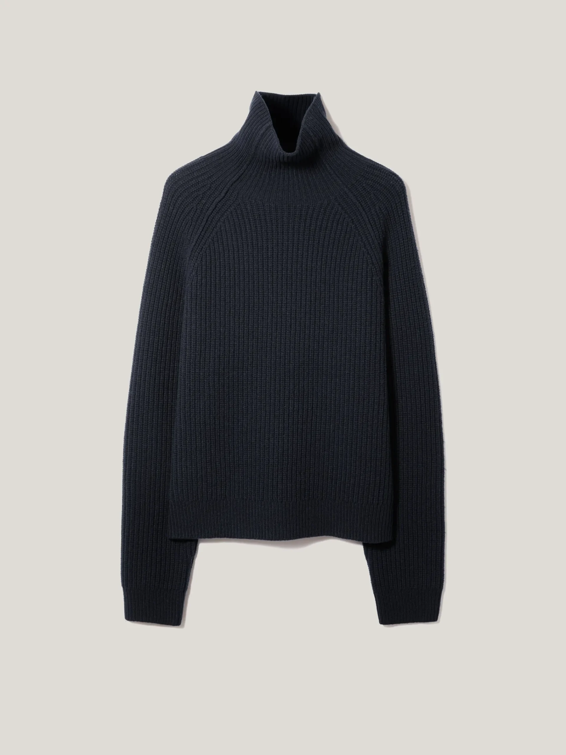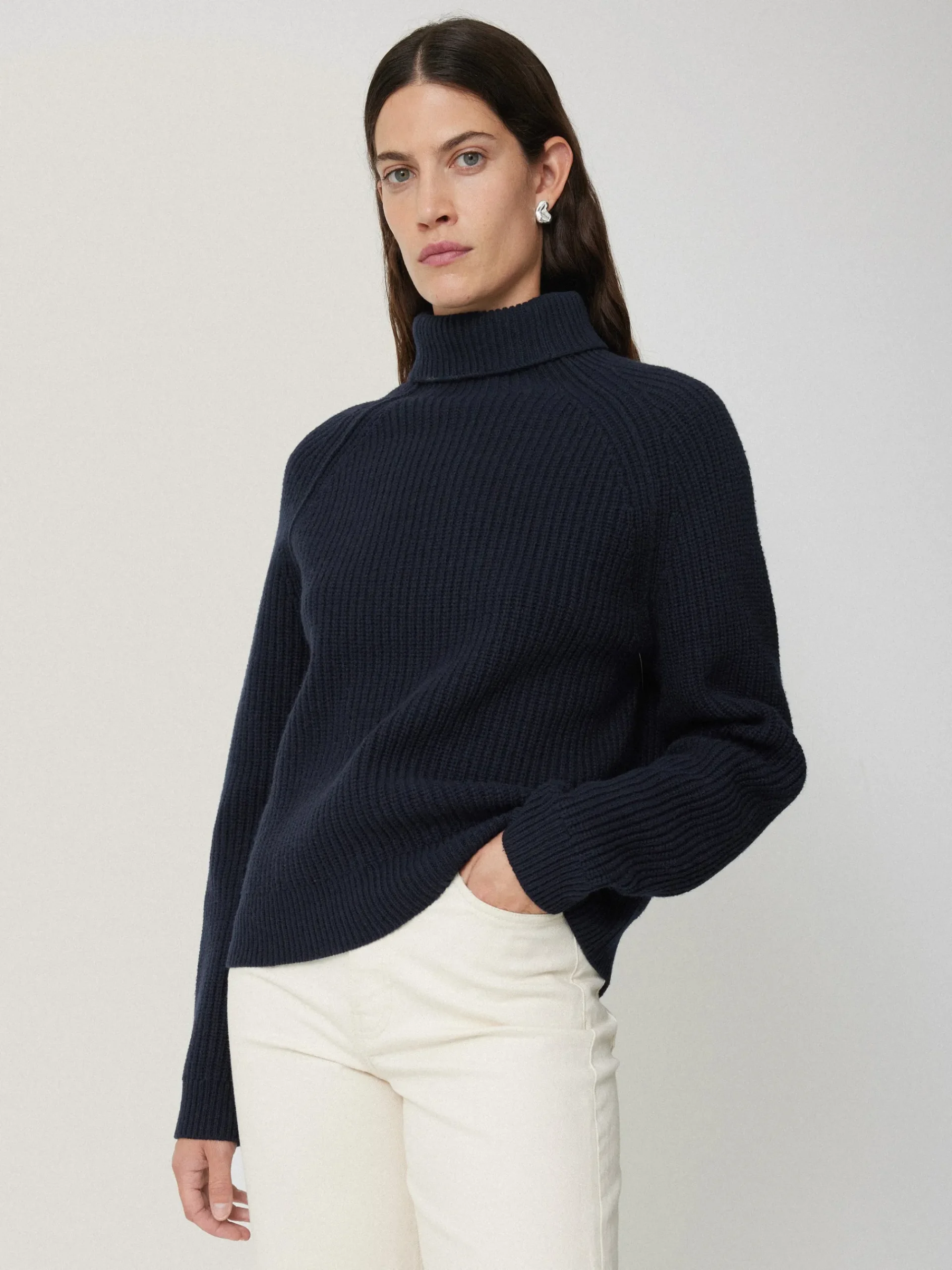 Crafted from responsibly sourced merino wool in a traditional fishermans rib stitch, this jumper will be a constant companion in the new season. Merino wool is softer than other types of wool because of its extra fine fibres that feel comfortable against the skin. Slouchy silhouette with stylish external seams on the raglan armholes, wear the ribbed turtleneck pulled up under your chin to keep out the cold, or folded down.