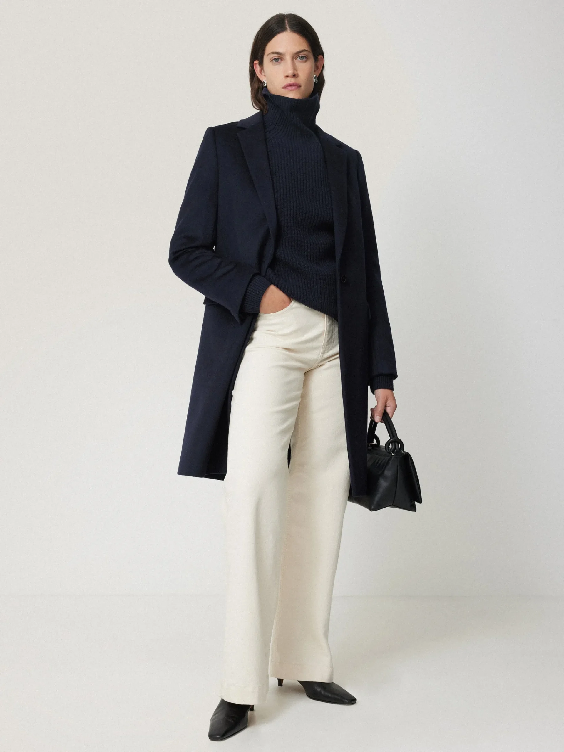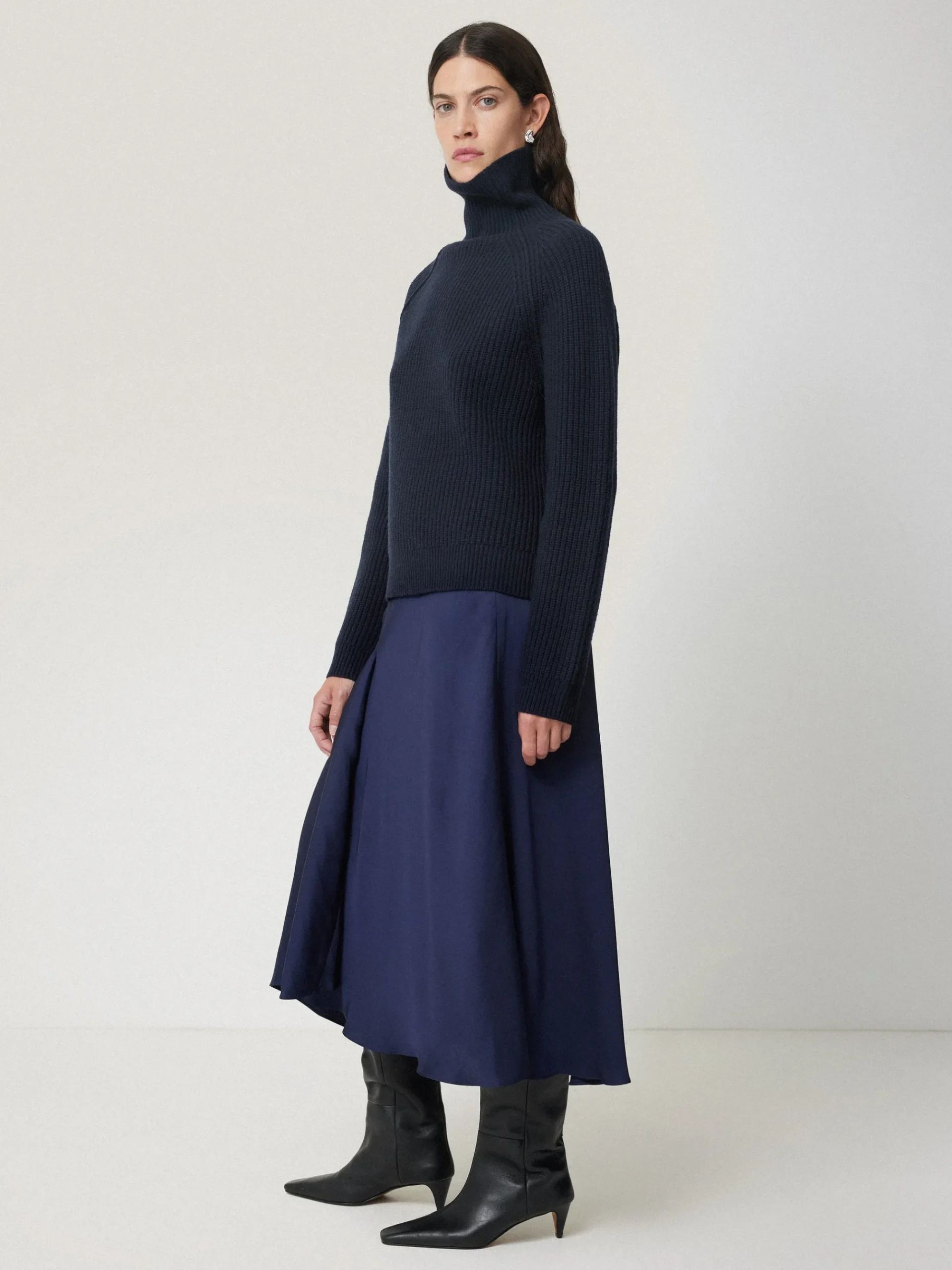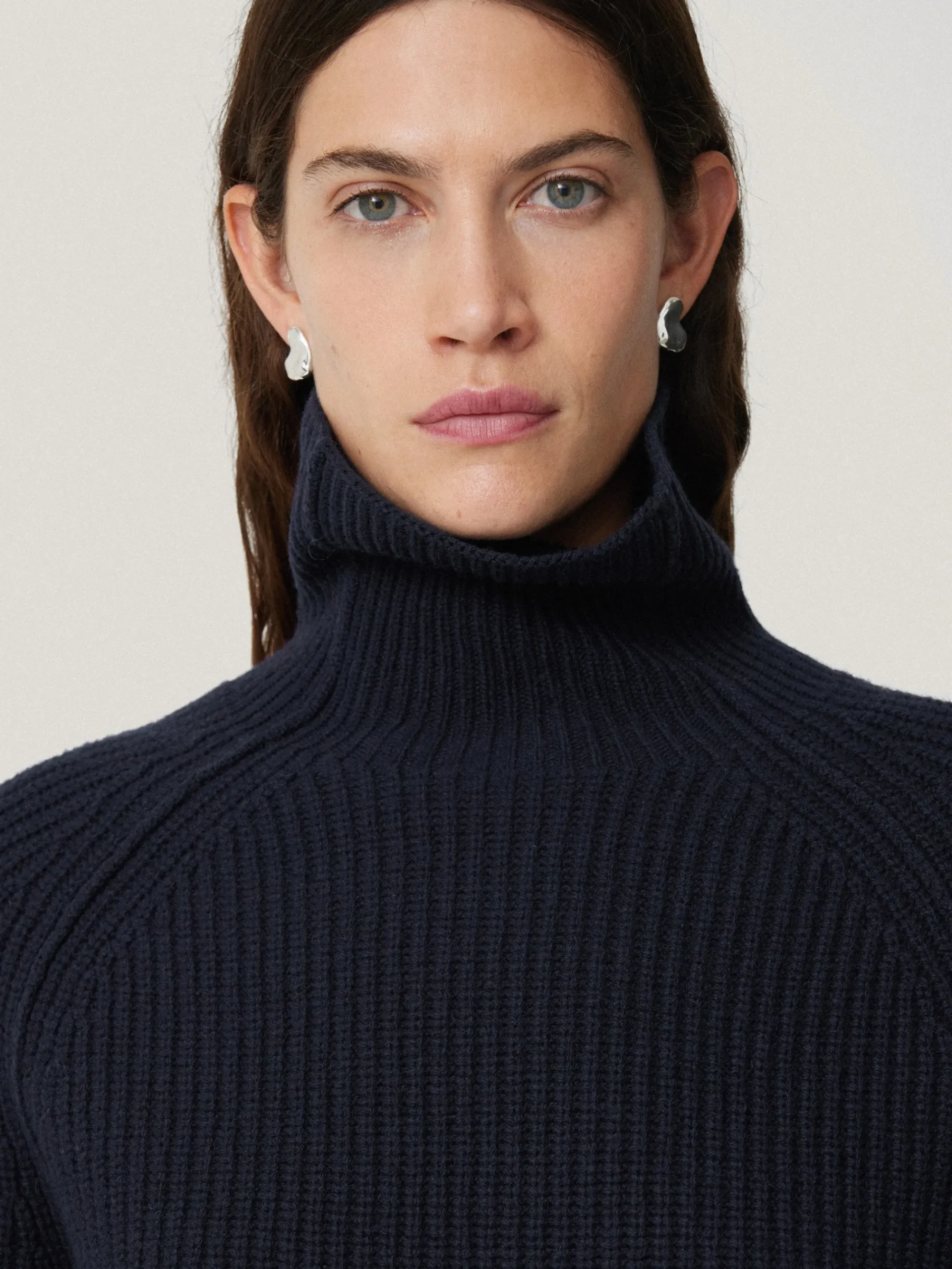 Crafted from responsibly sourced merino wool in a traditional fishermans rib stitch, this jumper will be a constant companion in the new season. Merino wool is softer than other types of wool because of its extra fine fibres that feel comfortable against the skin. Slouchy silhouette with stylish external seams on the raglan armholes, wear the ribbed turtleneck pulled up under your chin to keep out the cold, or folded down.