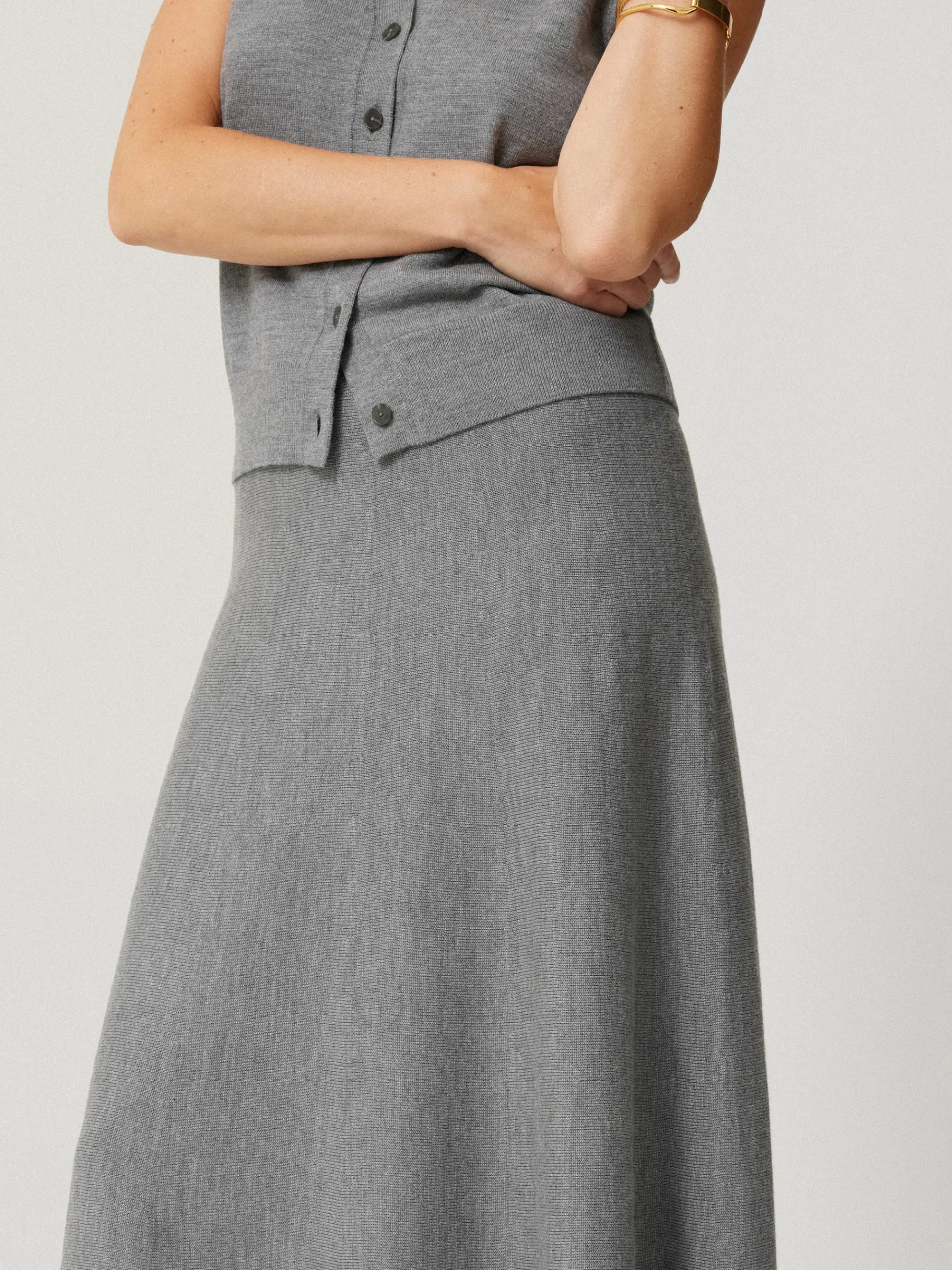 Beautiful merino wool provides lightweight warmth as seen with this classic midi skirt. Cut for a graceful silhouette that falls to the ankle, we love that this piece can be worn with the matching waistcoat or polo neck and a pair of knee high boots.