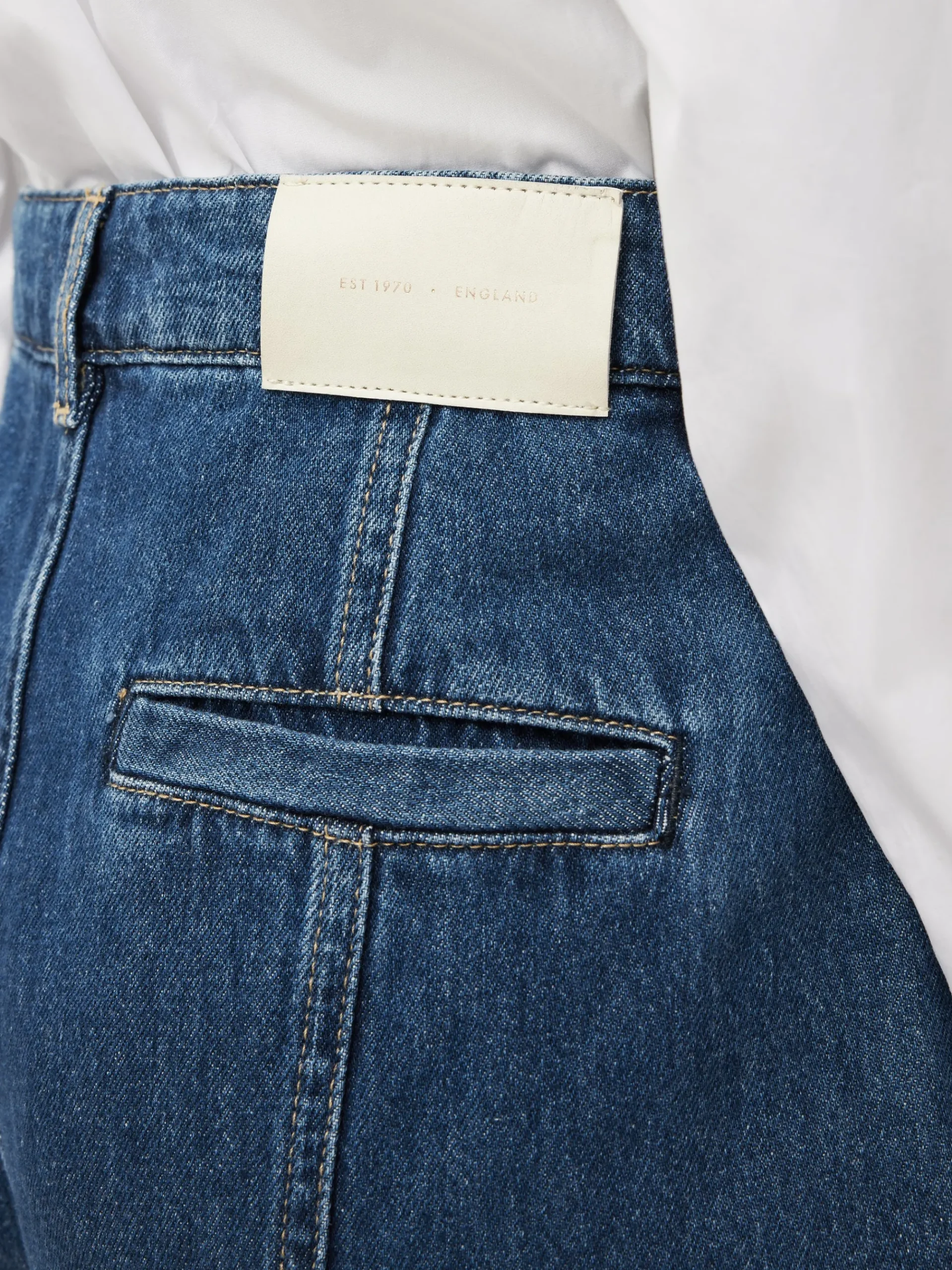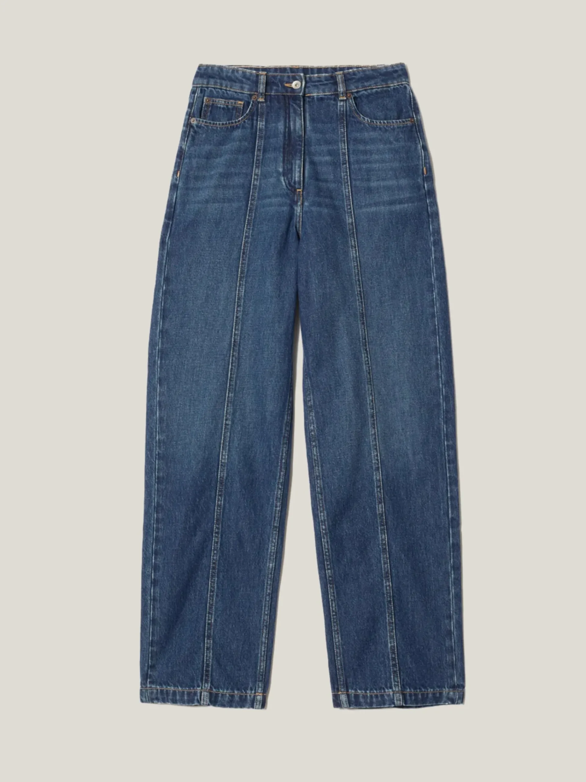 Authentic 5 pocket detail loose leg jean in our ethically sourced rich indigo denim. A tailored regular rise, with straight loose leg and contrast ecru top stitched vertical front and back leg seams. An instant classic. Size up a size for a more easy fit on the waist. Fit and Features