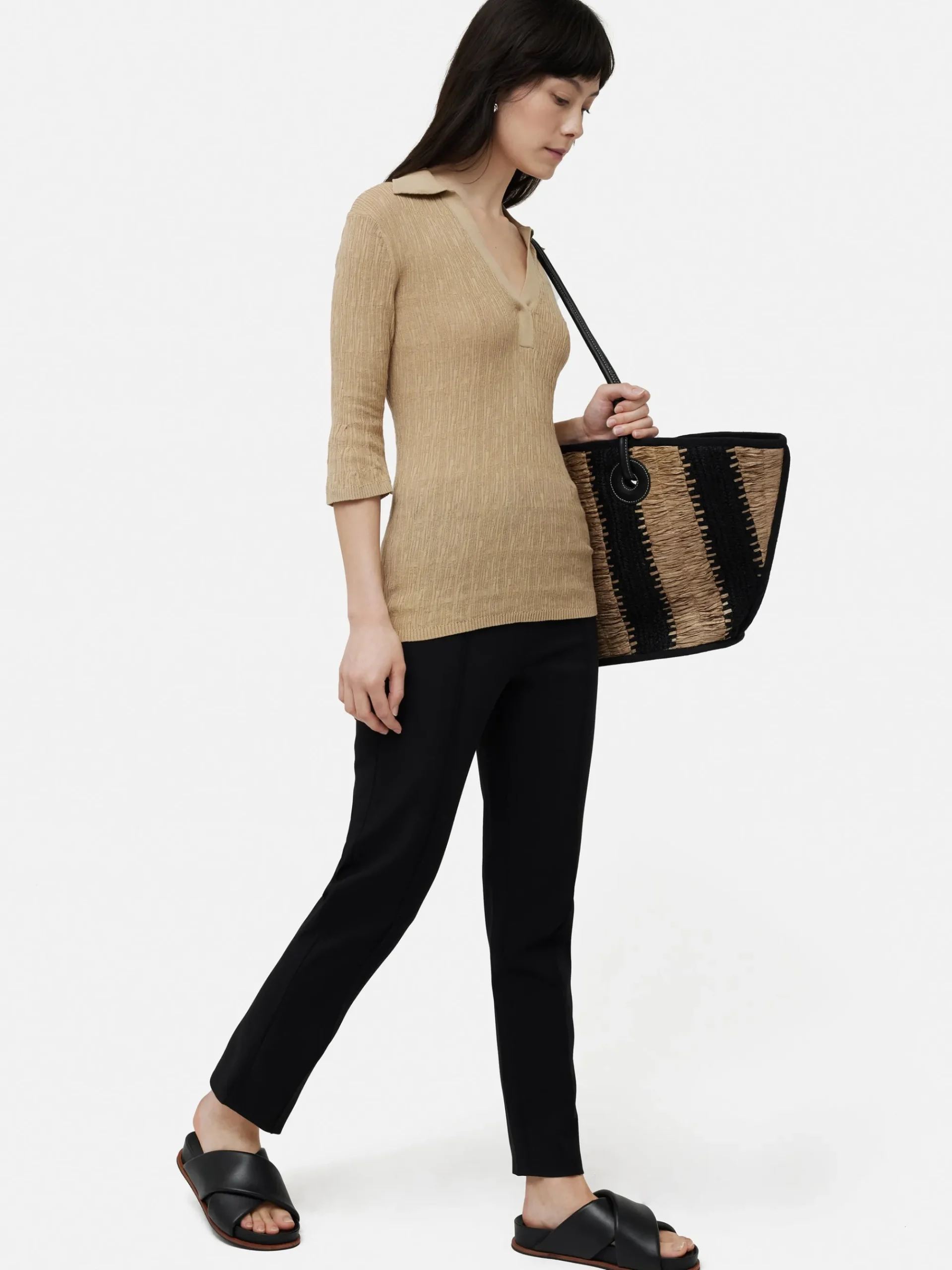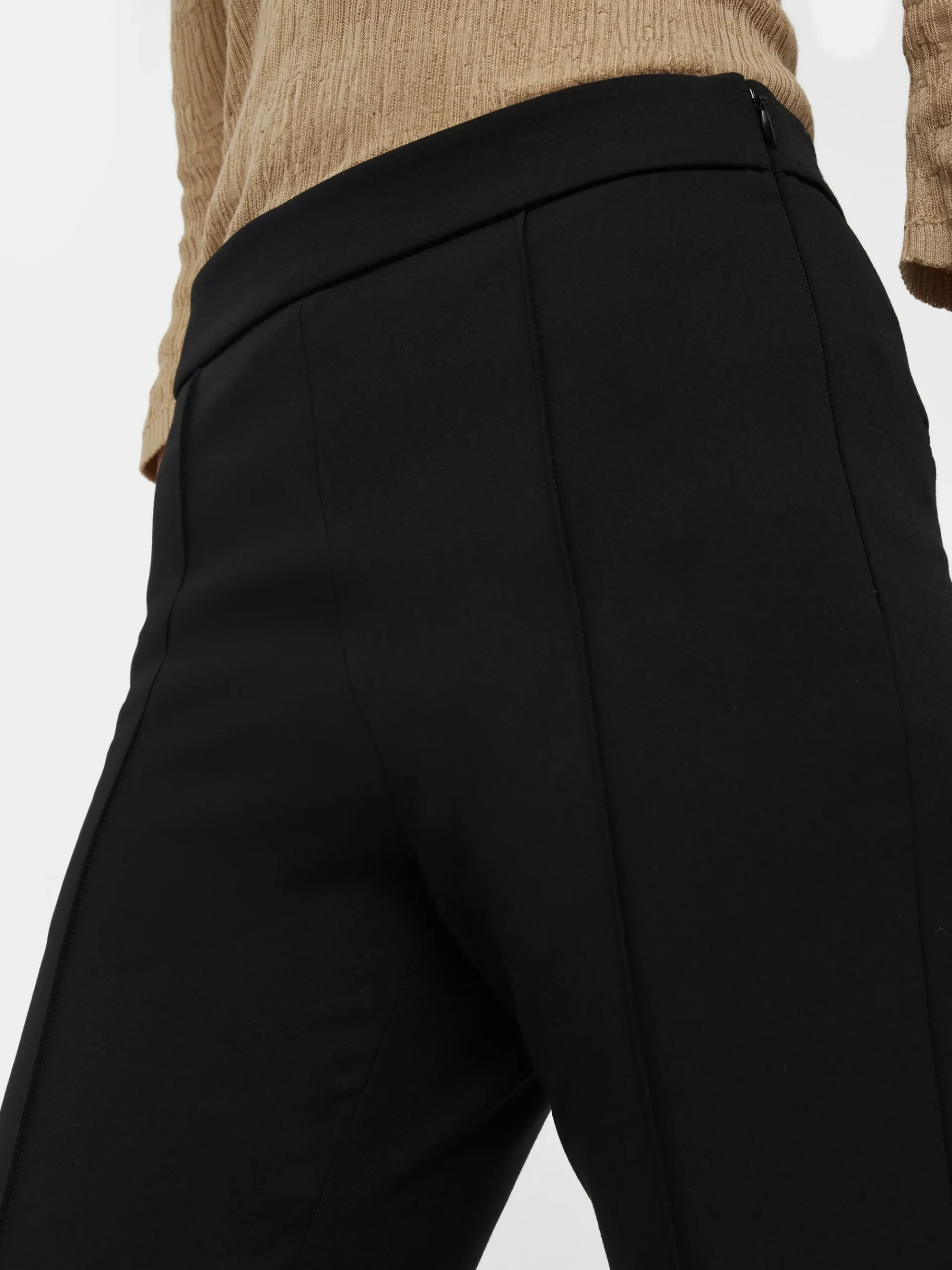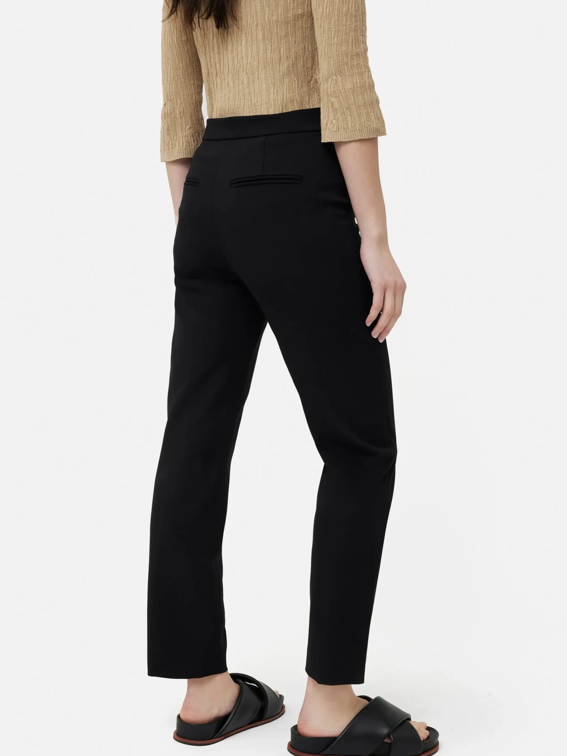 Our best-selling bi-stretch fabric is now offered in a cigarette leg shape, ensuring a flattering and supportive silhouette. With a slim leg that finishes just above the ankle, this pair features an extension tab waistband and a pressed-in crease along the leg for extra detailing. Contrasts play a crucial role in styling: pair it with an oversized knit for instantly chic look.