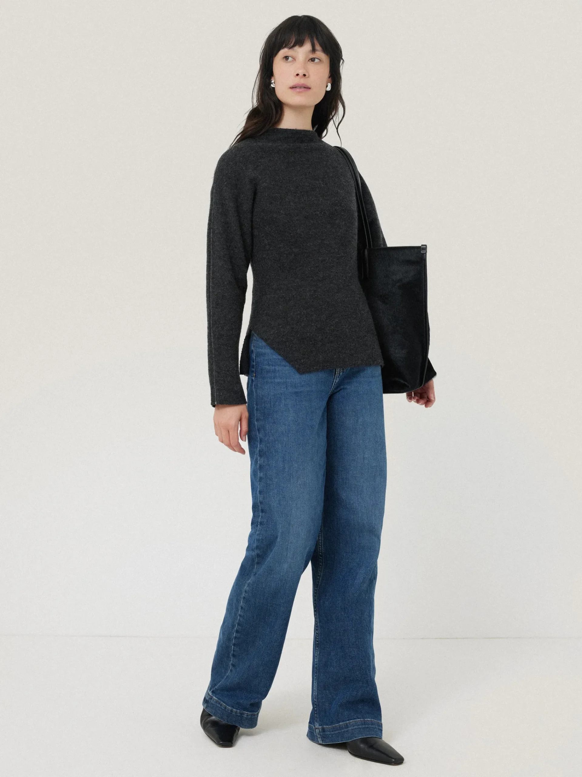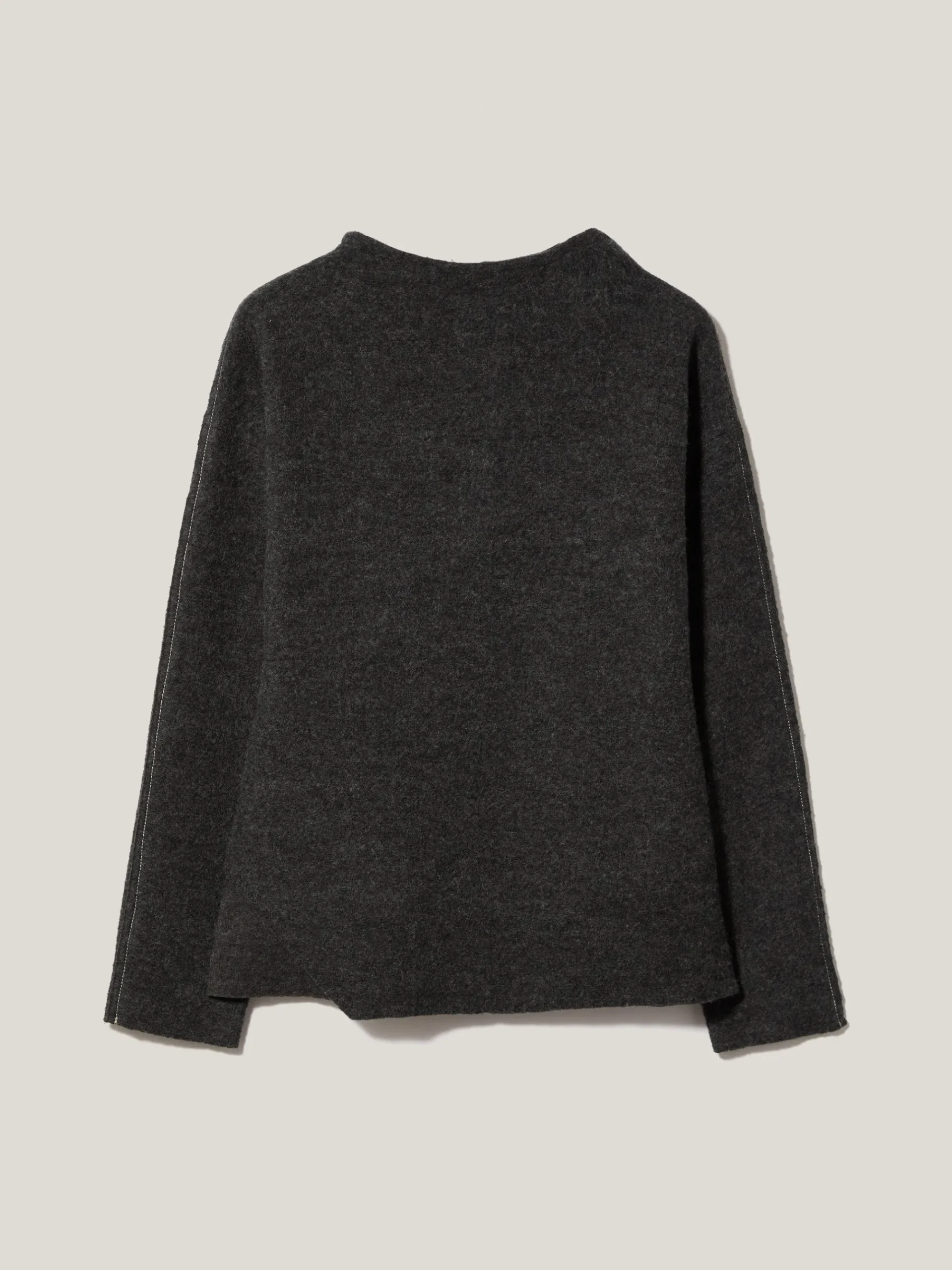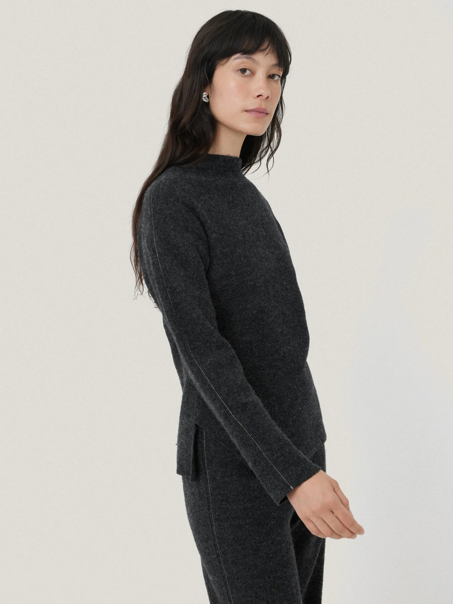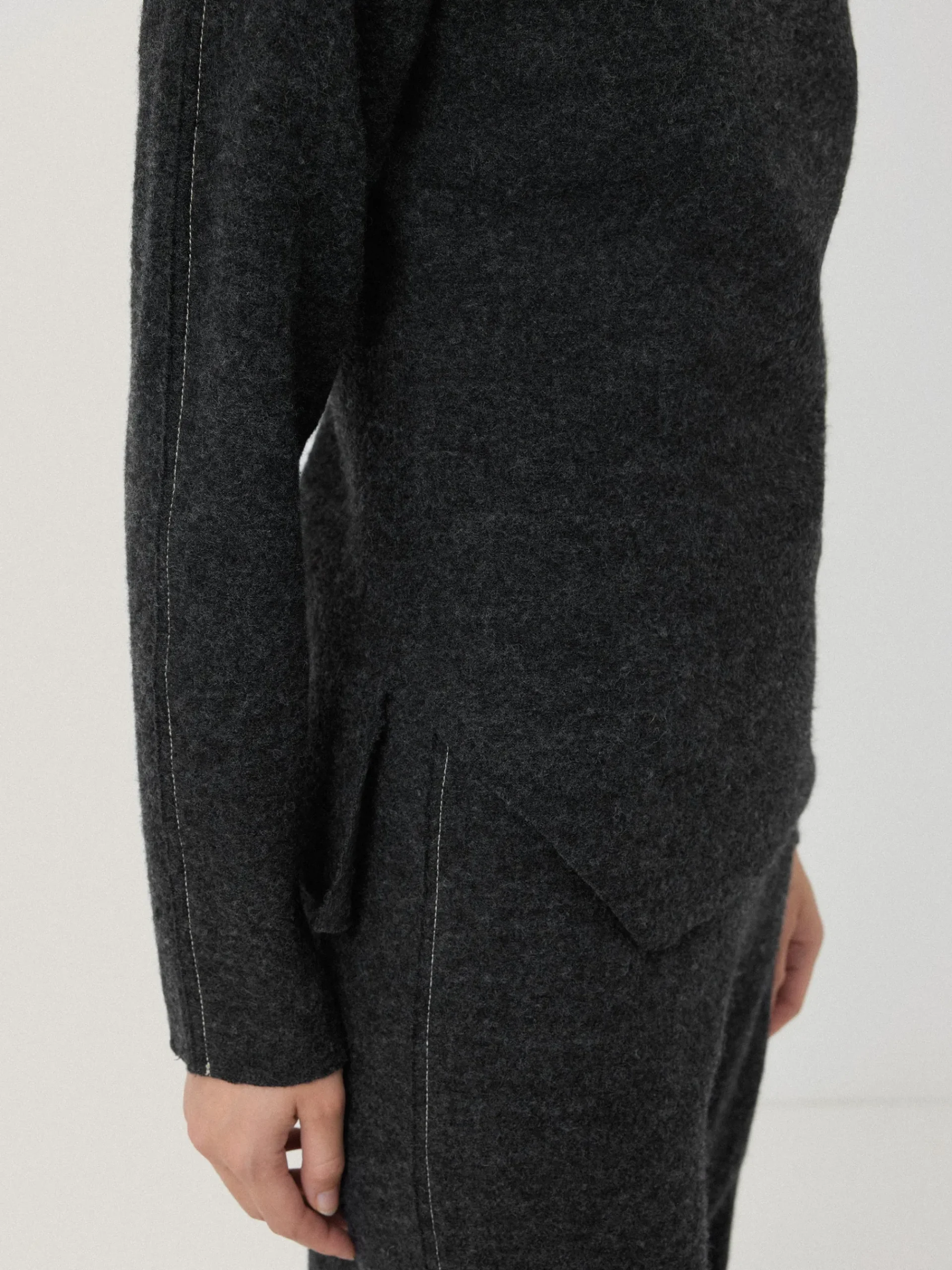 This charcoal grey top forms part of a co-ord for elevating downtime at home and beyond. The boiled wool fabrication creates structure to its contemporary silhouette with a nipped-in waist for subtle femininity alongside batwing sleeves and an asymmetric hemline. Contrast stitching on the seams adds a deconstructed feel.
