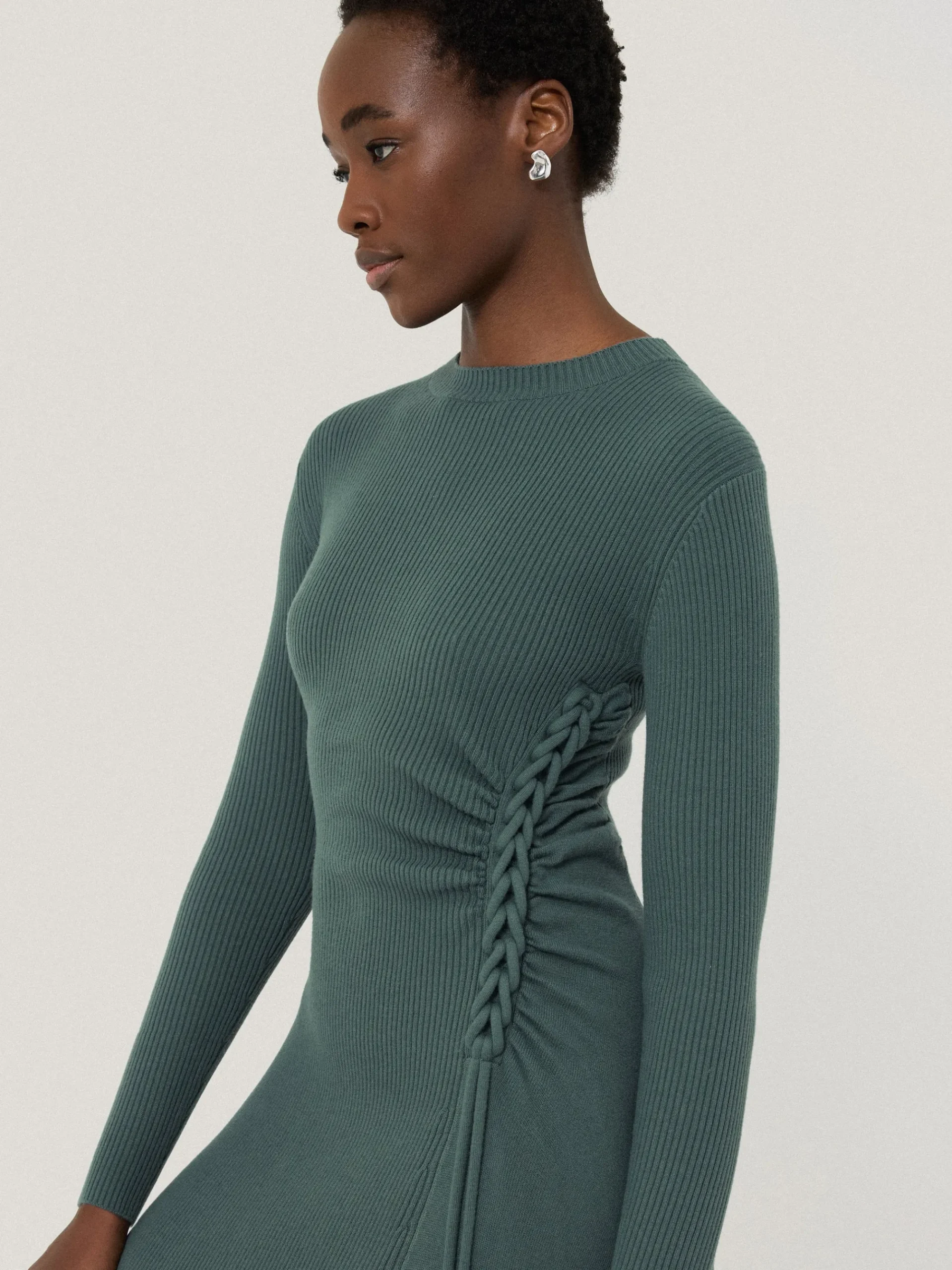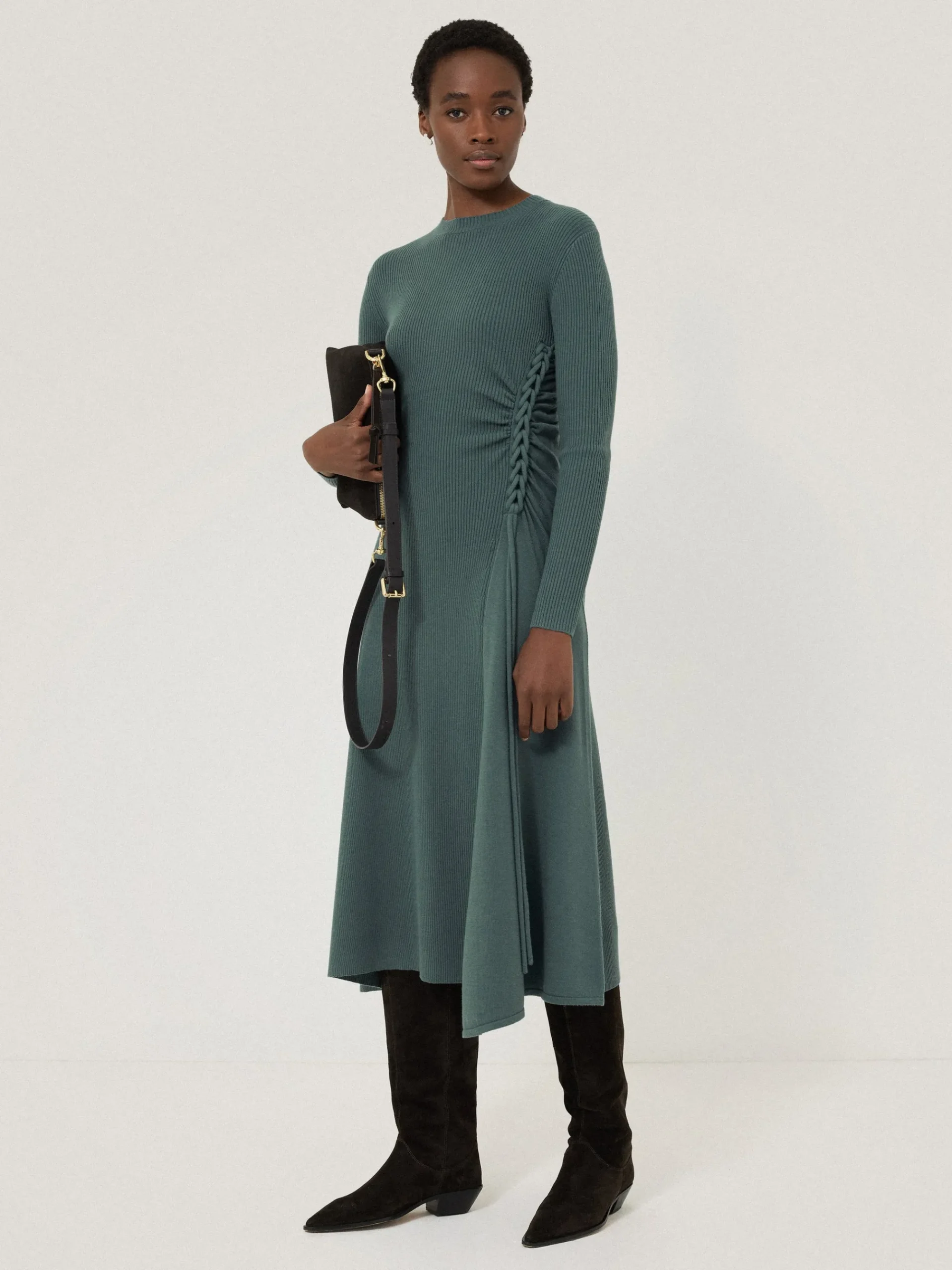 This knitted midi dress is inherently Jigsaw, juxtaposing a classic crew neck design with a chunky braided side panel. This unique detail allows for flattering ruching around the waist and adds interest to a casual daytime option.