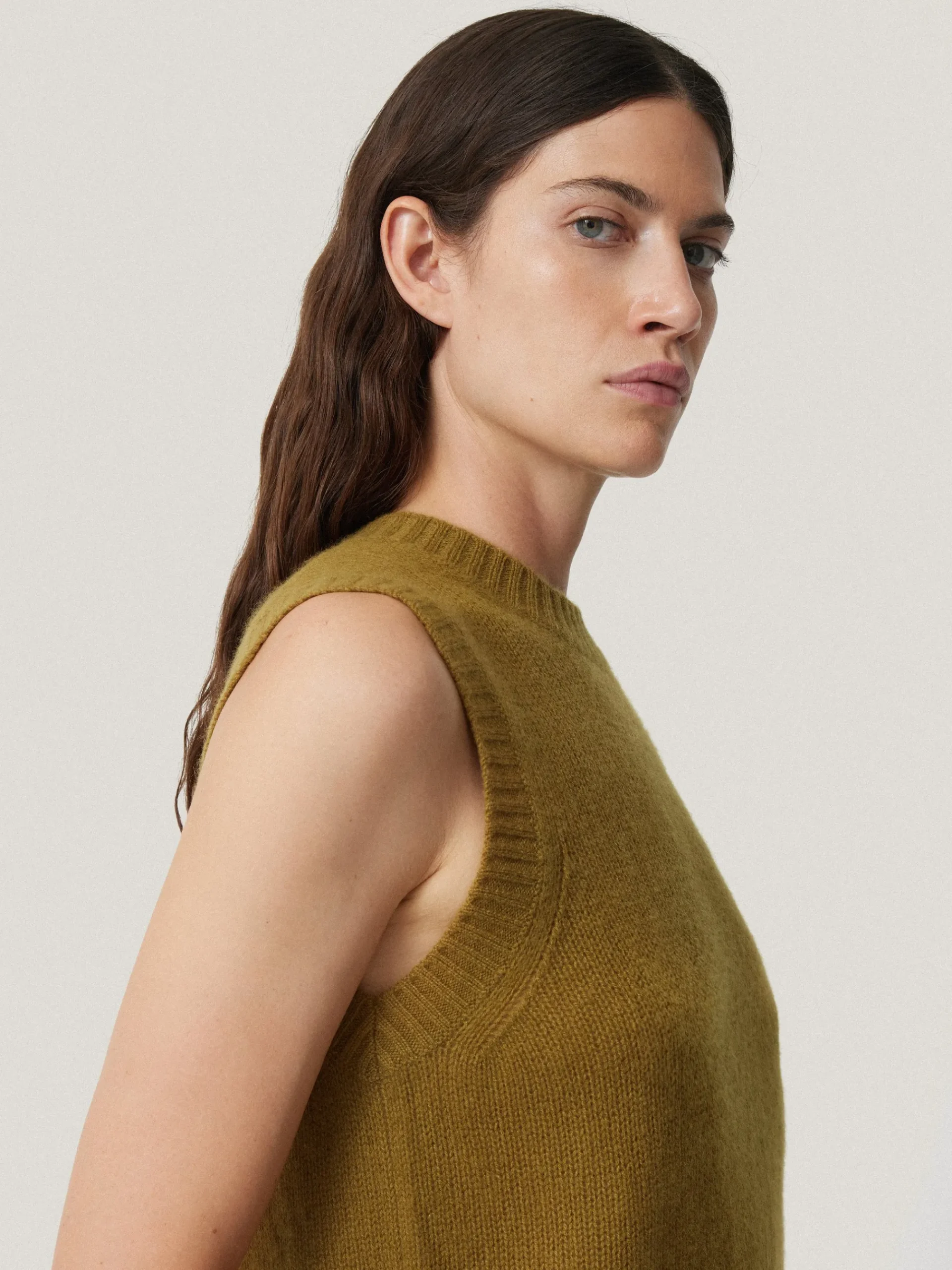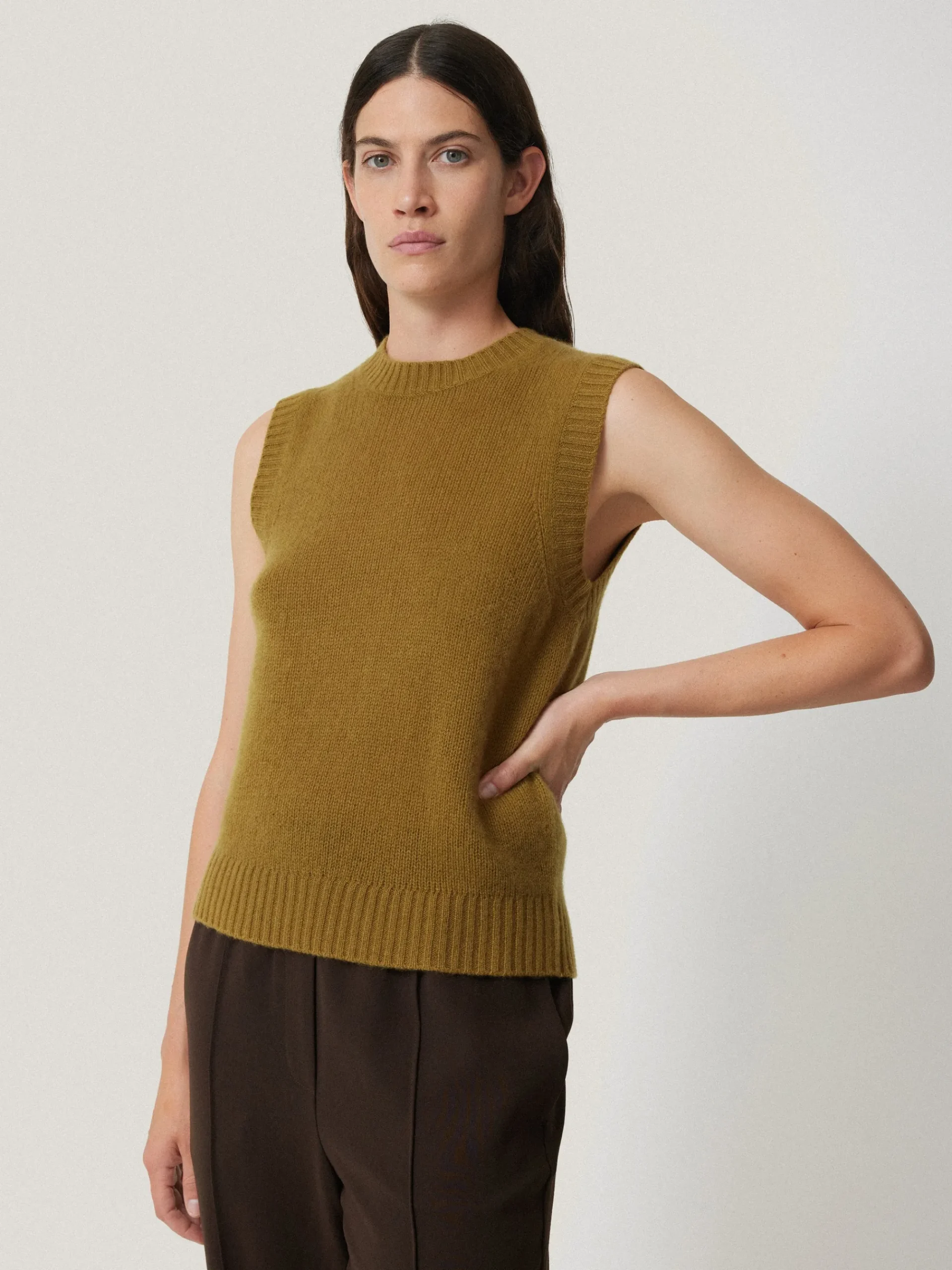 Our best-selling tank arrives in a new fabrication this Autumn: fully traceable Mongolian cashmere sourced from one of the worlds leading cashmere spinners. High crew neckline shape with a deep ribbed hem. Perfect for layering over a shirt or printed dress, or simply wear alone with high waisted trousers. This versatile piece promises endless wardrobe combinations.