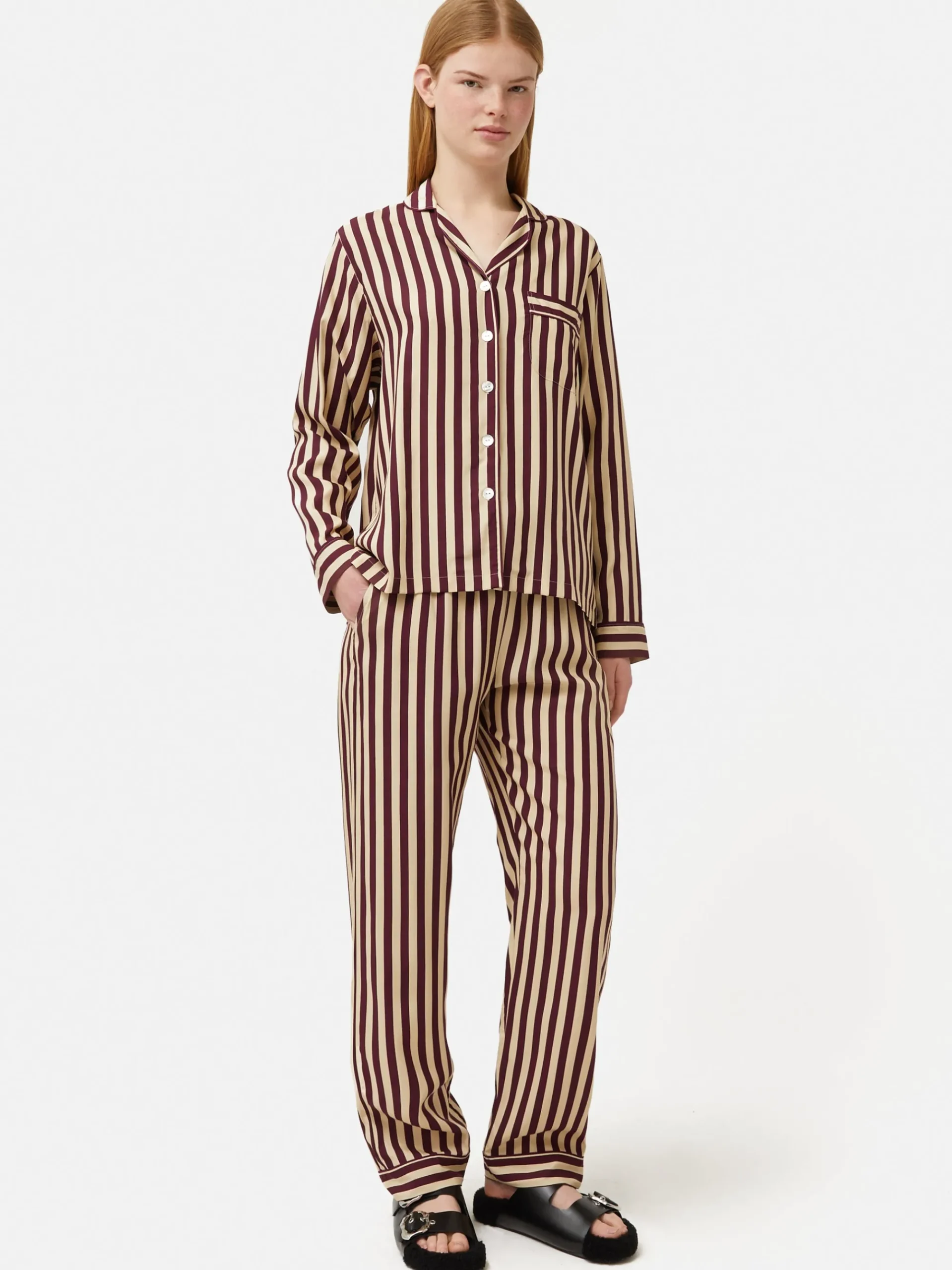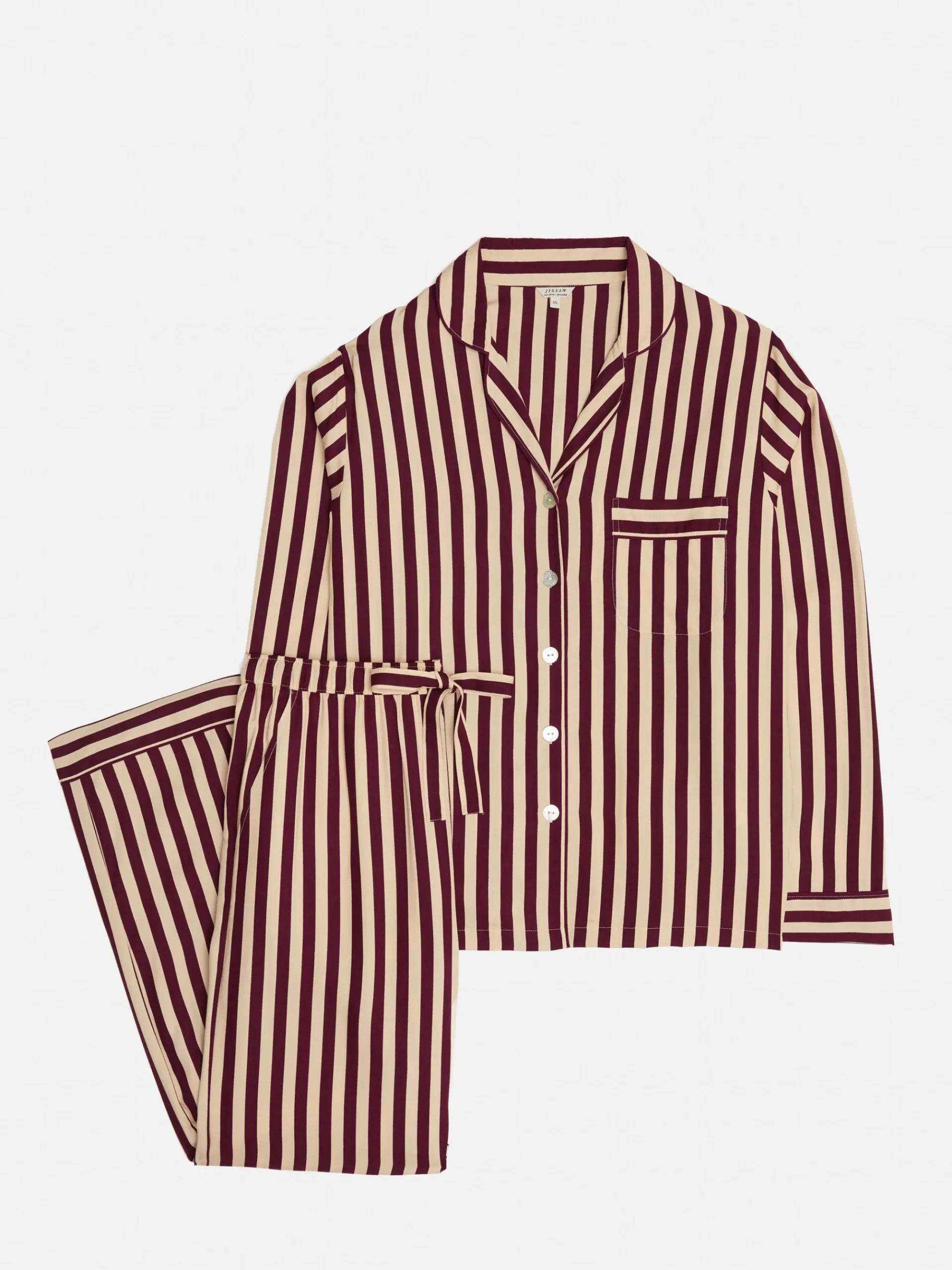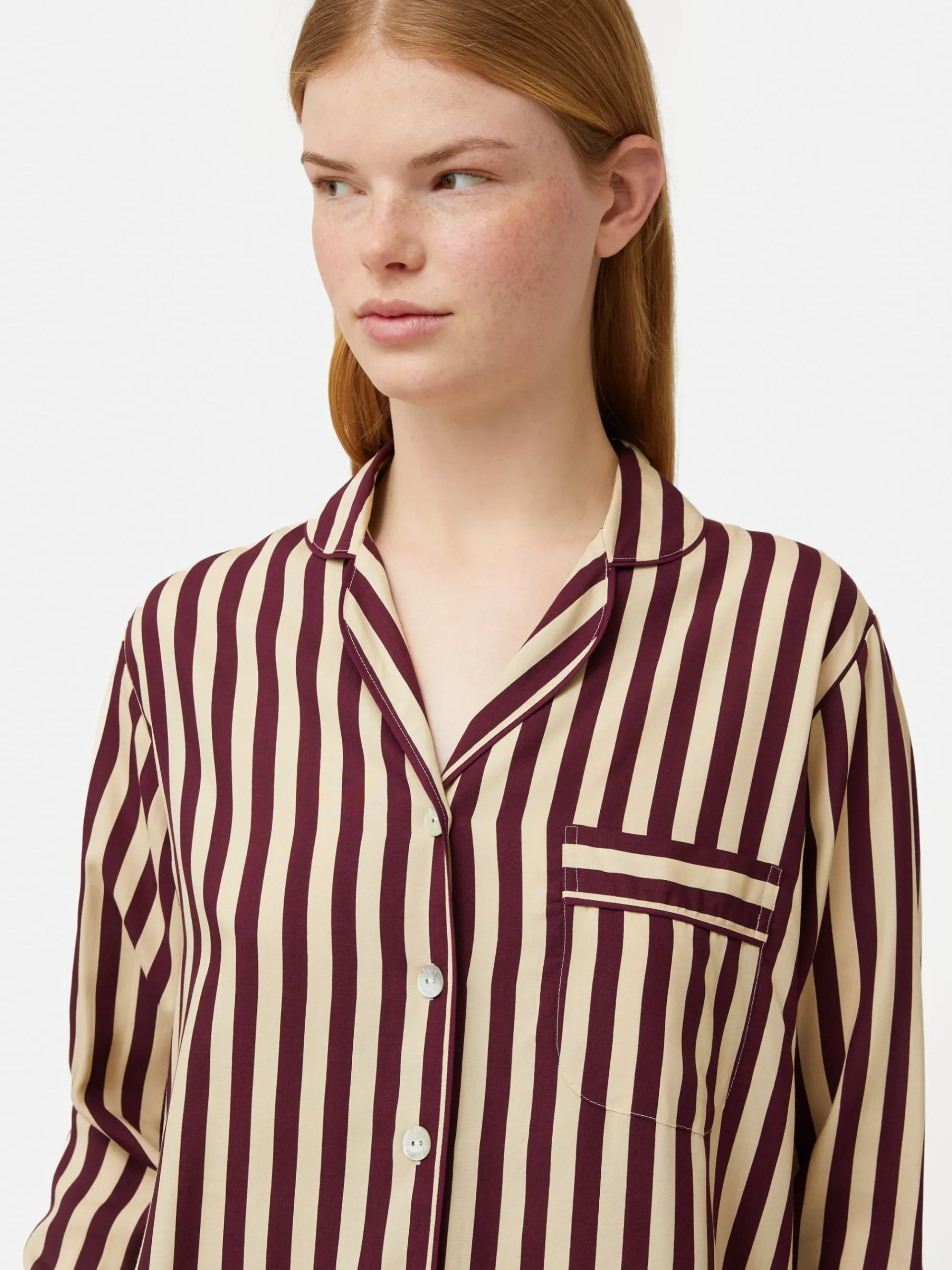 Blending our classic pyjama vibe with contemporary stripes, this ensemble is crafted from a modal blend. It’s all about the details, sharp contrast piping, elegant mother-of-pearl buttons, and a relaxed-fit shirt-style top featuring a handy chest pocket. Meanwhile, the easy drawstring bottoms with side pockets ensure a lounging experience that’s both comfy and practical. Fit and Features
