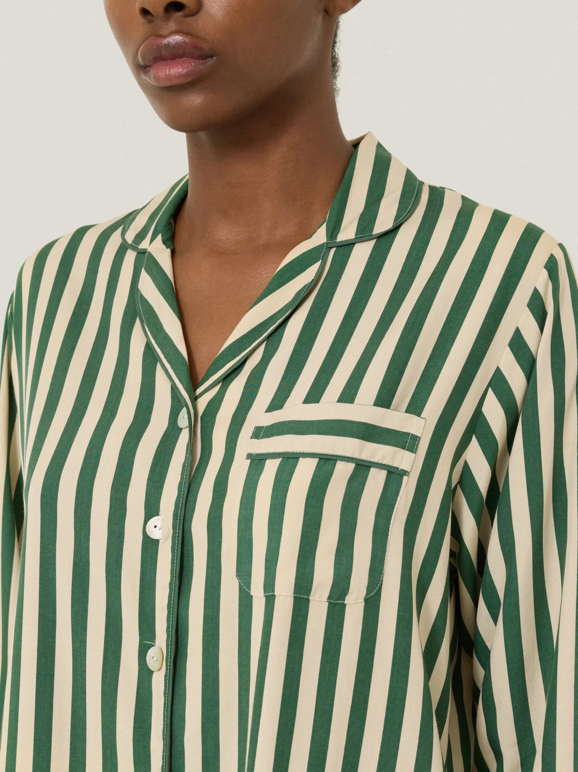 Blending our classic pyjama vibe with contemporary stripes, this ensemble is crafted from a modal. It’s all about the details, sharp contrast piping, elegant mother-of-pearl buttons, and a relaxed-fit shirt-style top featuring a handy chest pocket. Meanwhile, the easy drawstring bottoms with side pockets ensure a lounging experience that’s both comfy and practical. Fit and Features