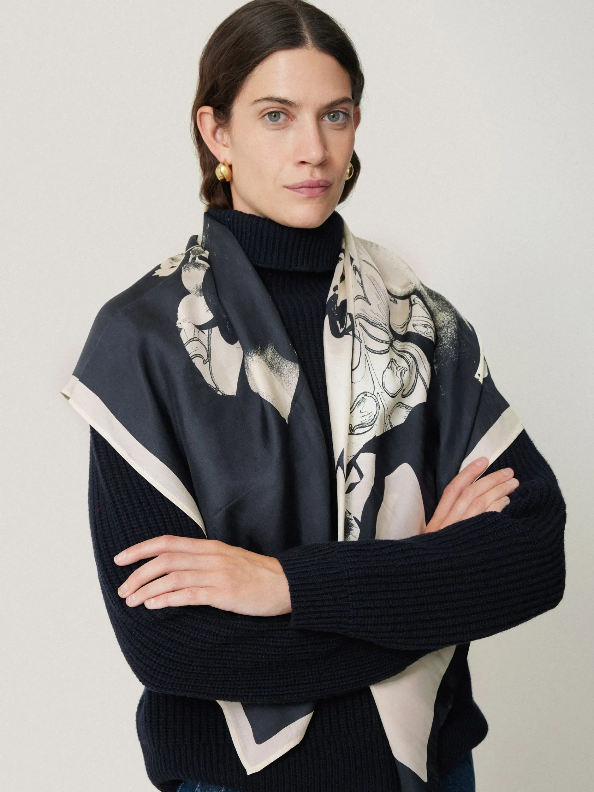 Our floral scarf started out as a collage by our in-house print designer, taking inspiration from the faded grandeur of manor houses. The repetitive pattern was then digitised onto a silk twill fabric in a graphic monochrome palette.