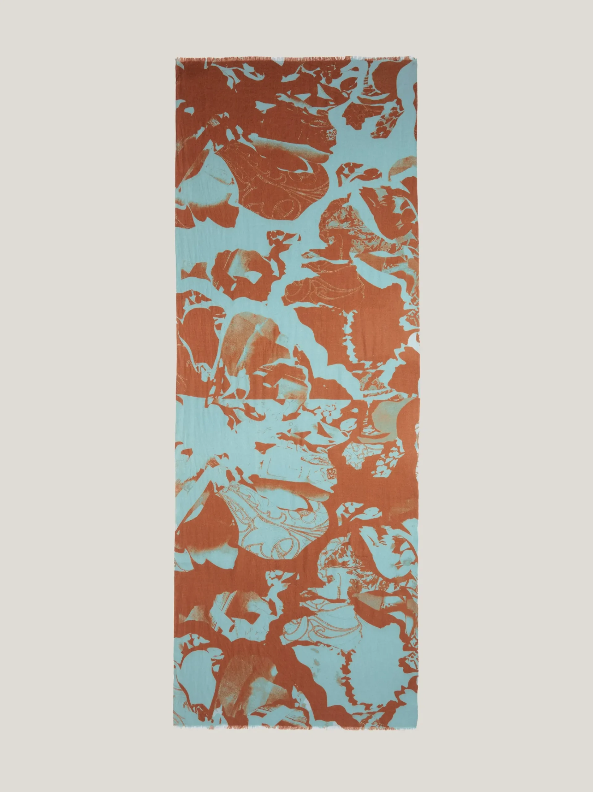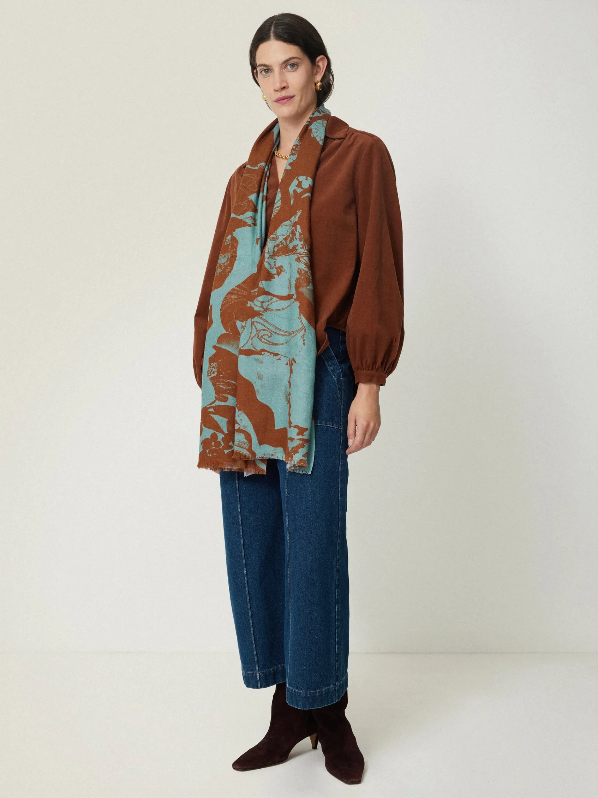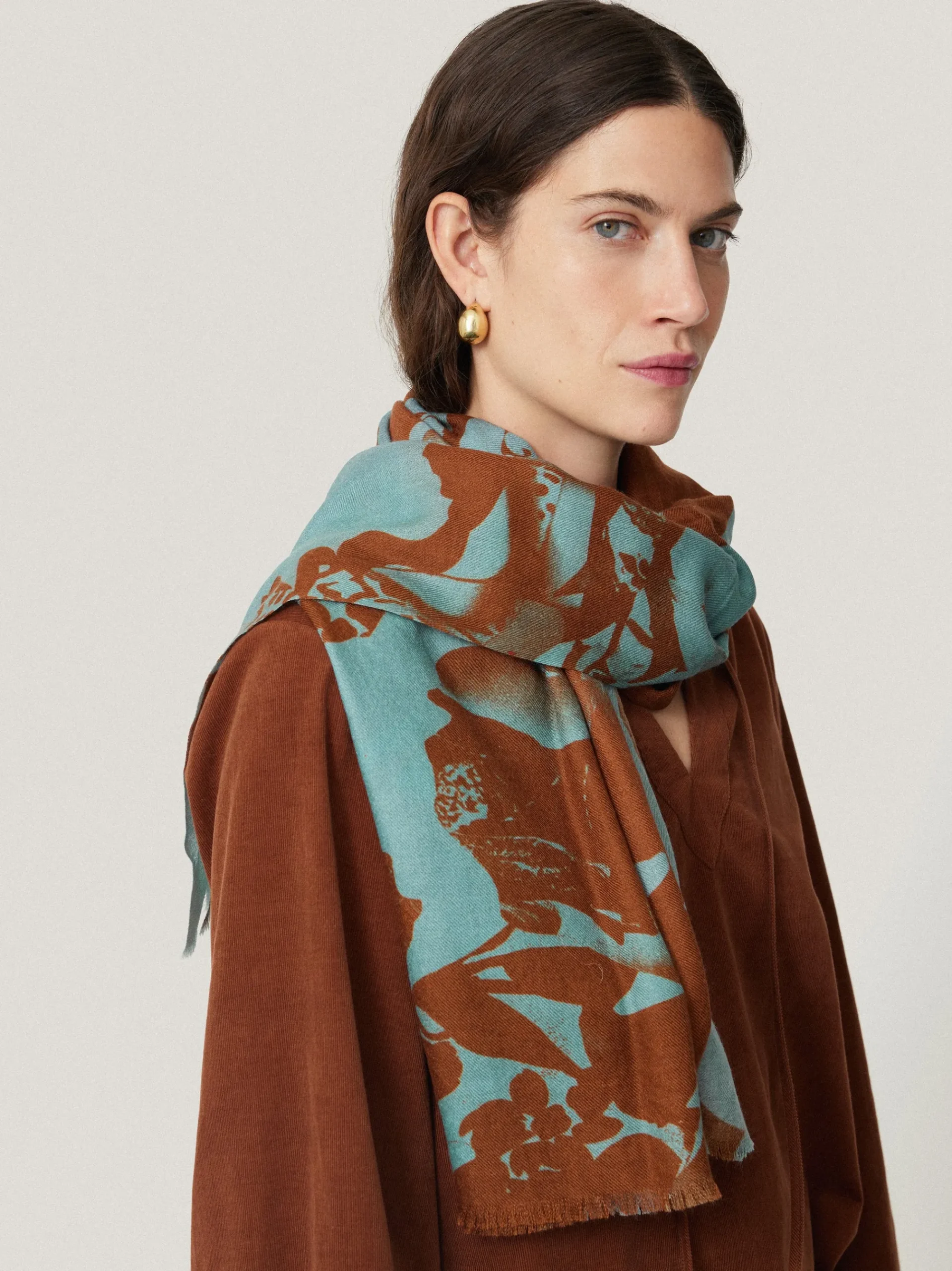 Our floral scarf started out as a collage by our in-house print designer, taking inspiration from the faded grandeur of manor houses. The repetitive pattern was then digitised onto a wool silk blend fabric, spotlighting our bespoke Golden Kelp colour.