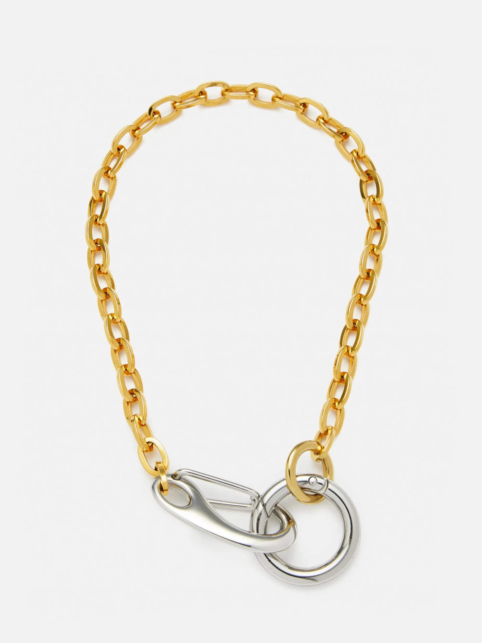 As part of our limited edition Jigsaw X Collagerie SS23 collection, a bespoke gold-plated chain necklace with contrast silver carabiner clip details. Made in Italy, this statement necklace delivers elegance with a subtle ode to contemporary punk rock styles. Fit and Features