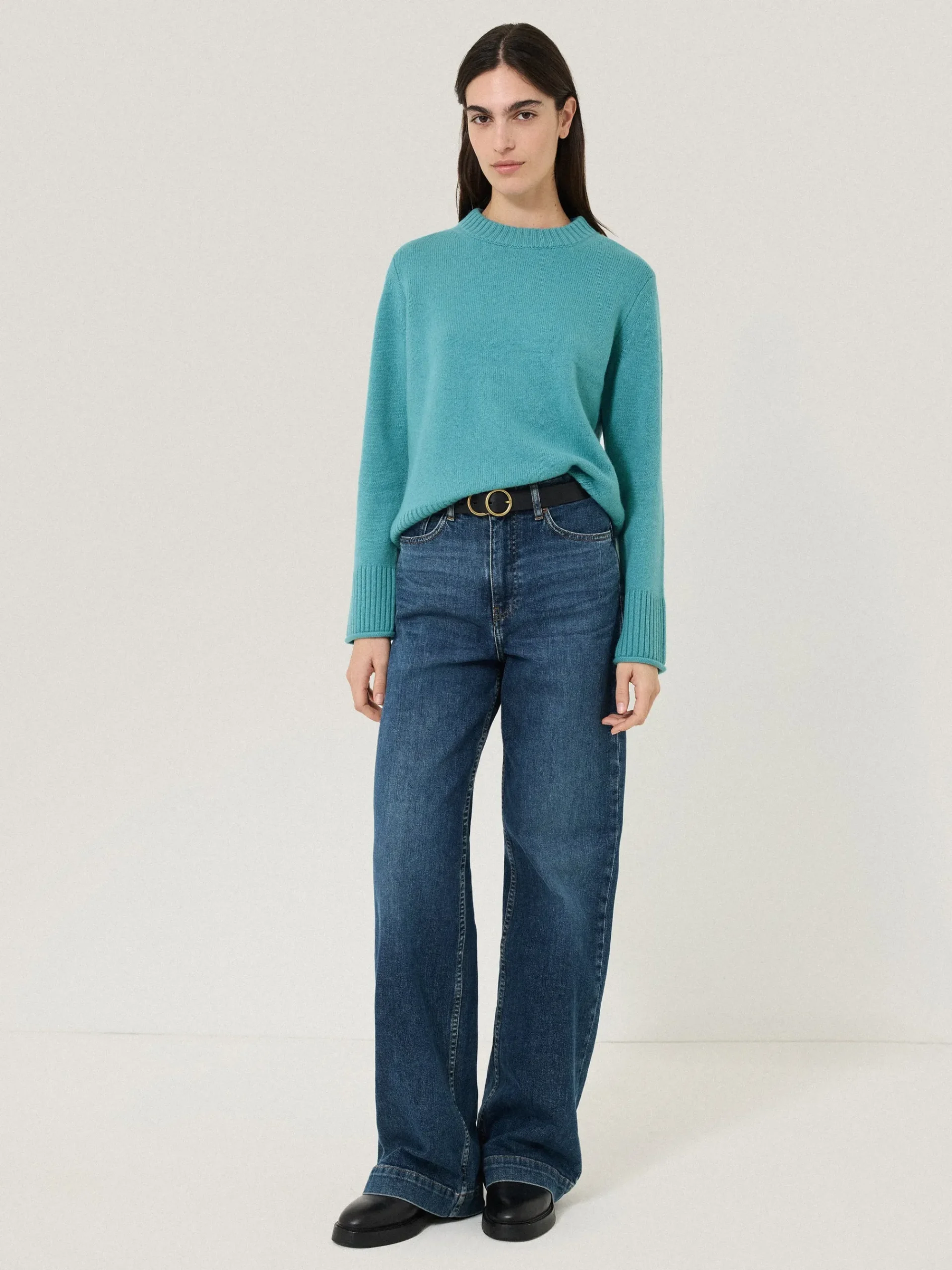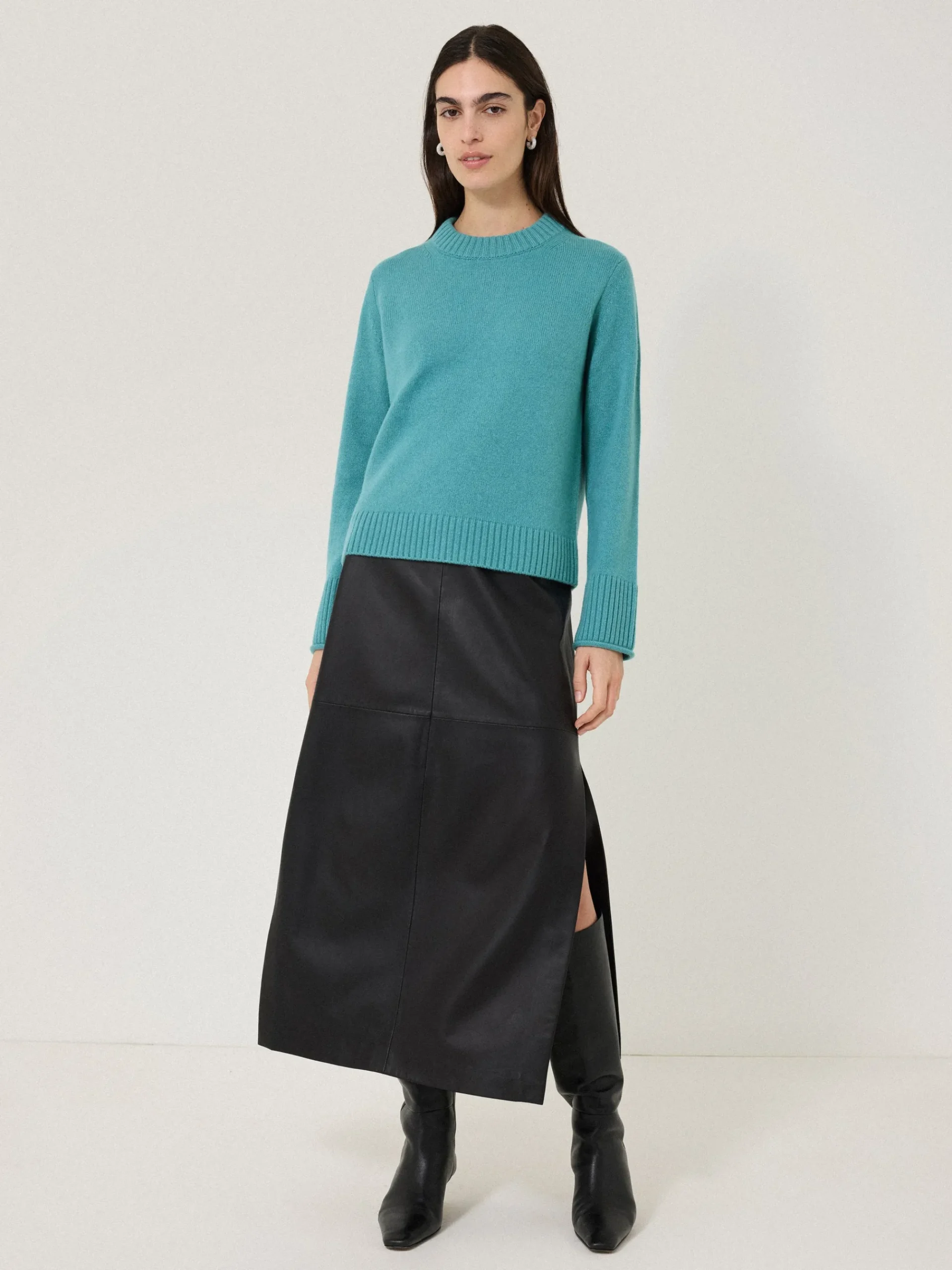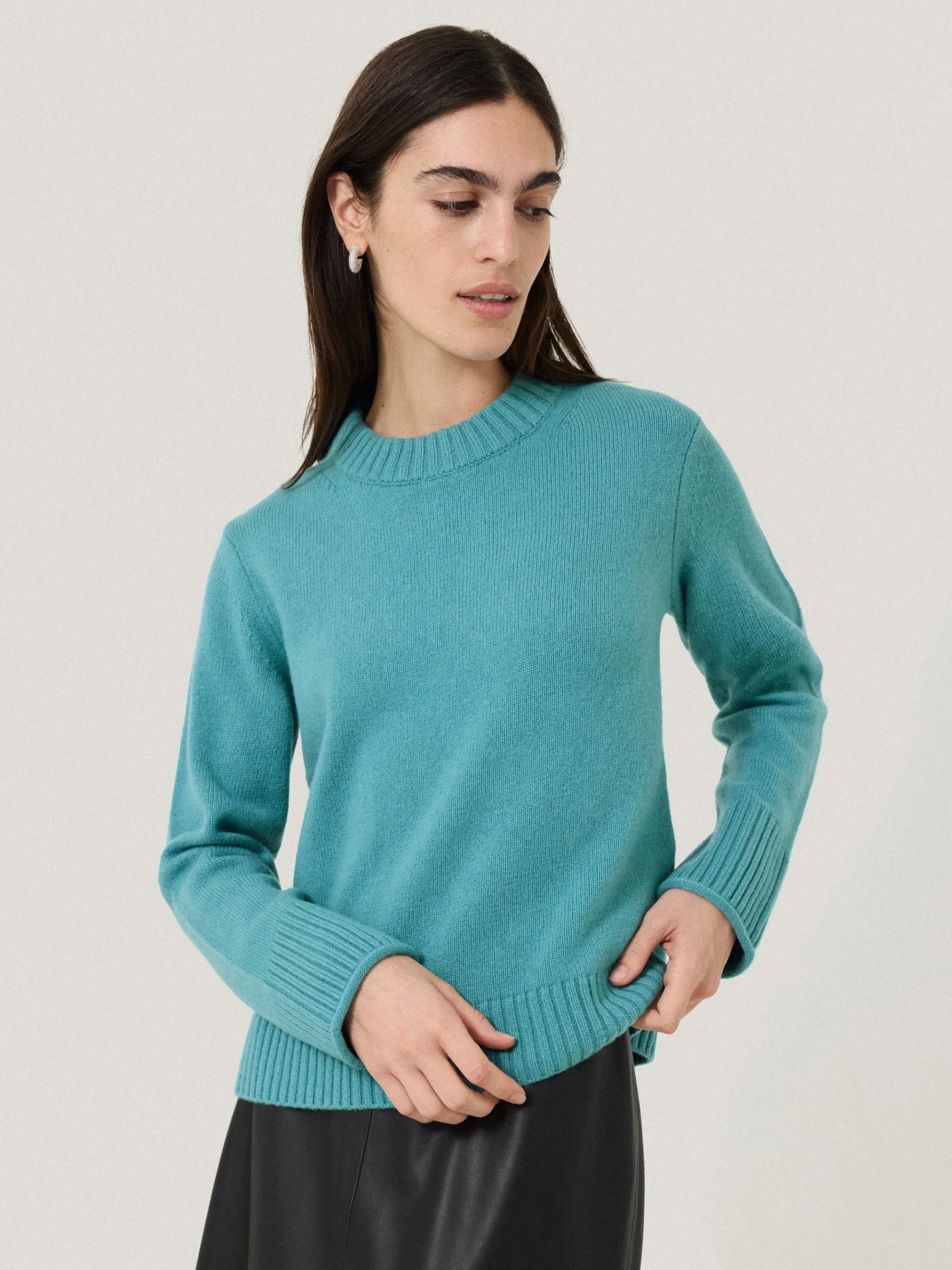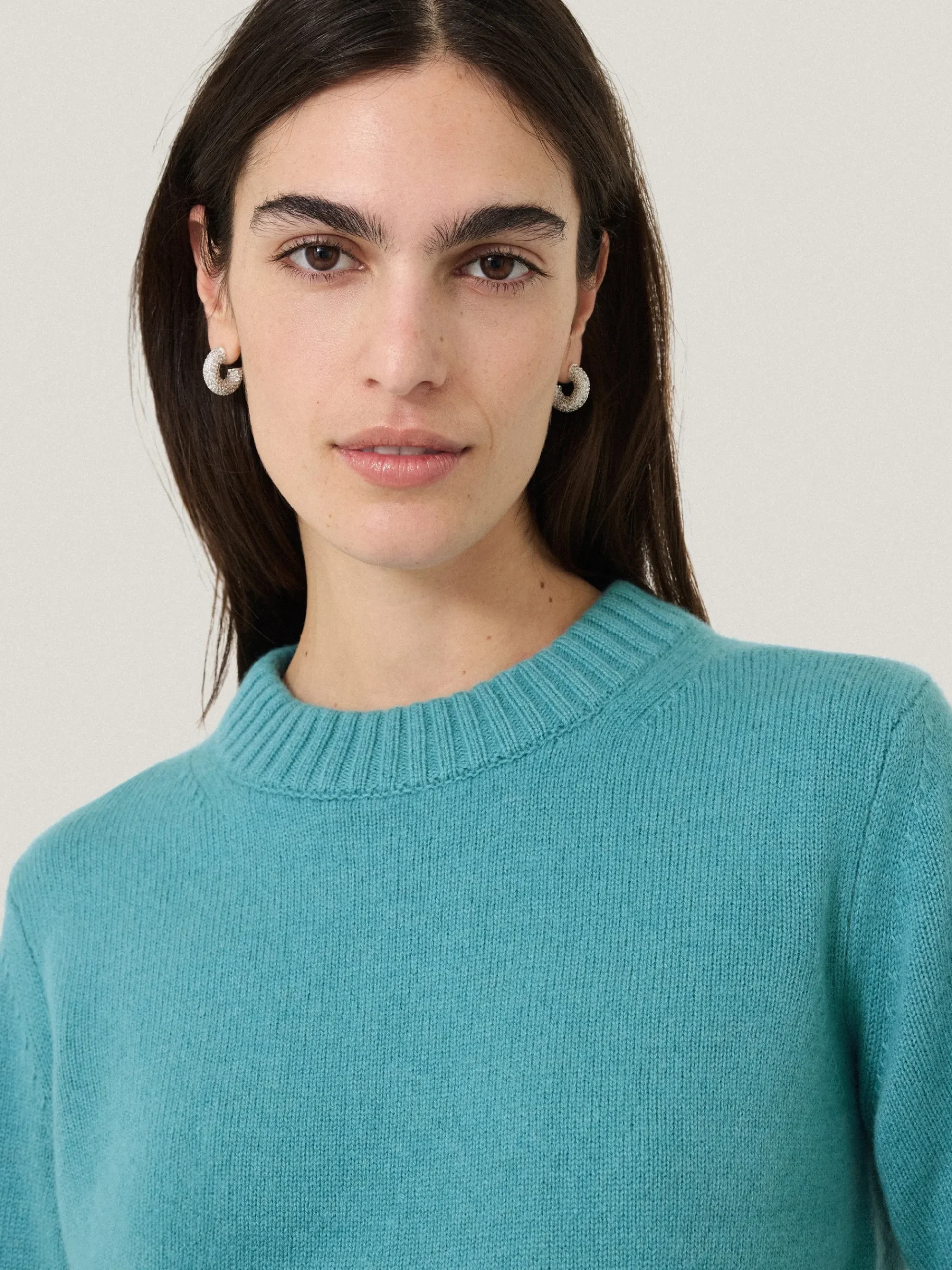 Knitted in a mid weight wool cashmere blended yarn, our crew neck jumper is designed with a shorter silhouette. Finished with modern chunky rib at neck and cuffs. Pair with denim and leather separates or layer over printed dresses. Size up for a more slouchy look.