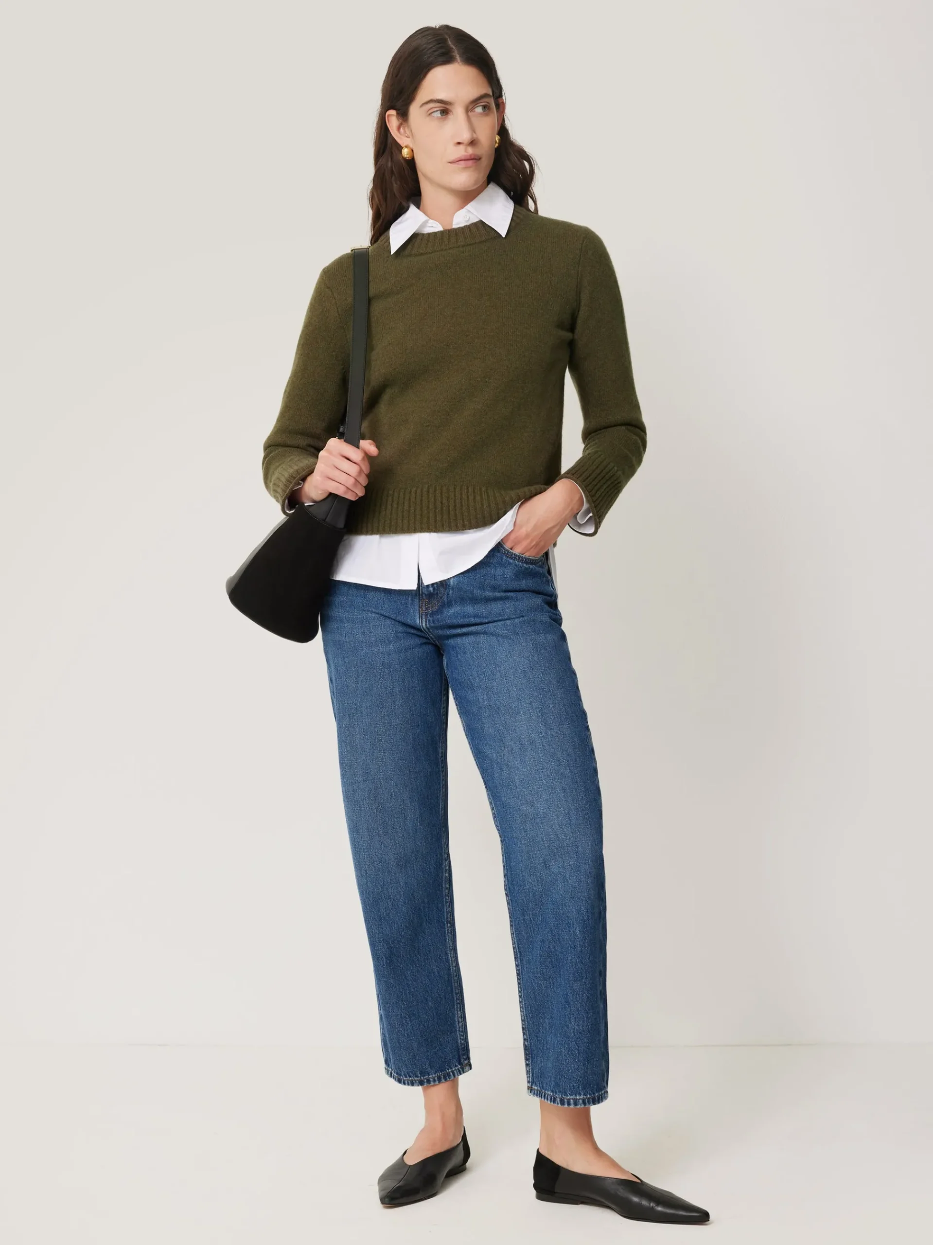Knitted in a mid weight wool cashmere blended yarn, our crew neck jumper is designed with a shorter silhouette. Finished with modern chunky rib at neck and cuffs. Pair with denim and leather separates or layer over printed dresses. Size up for a more slouchy look.