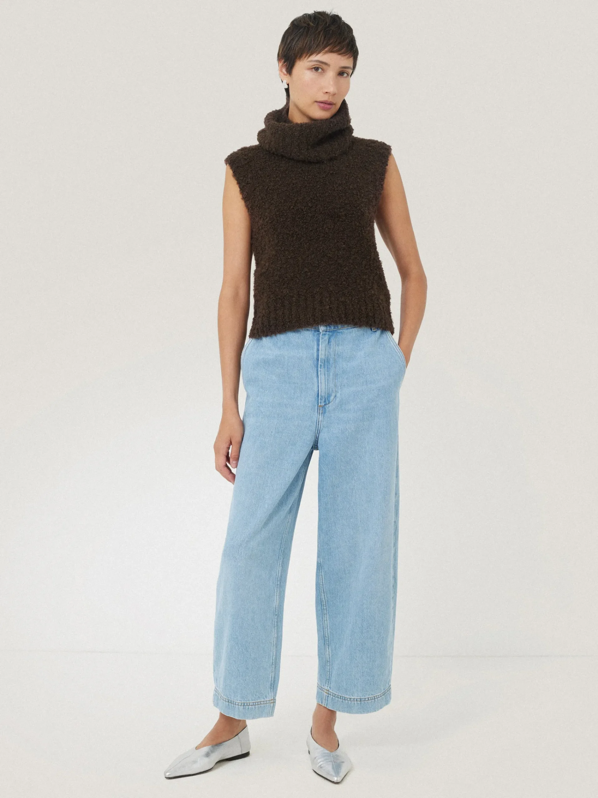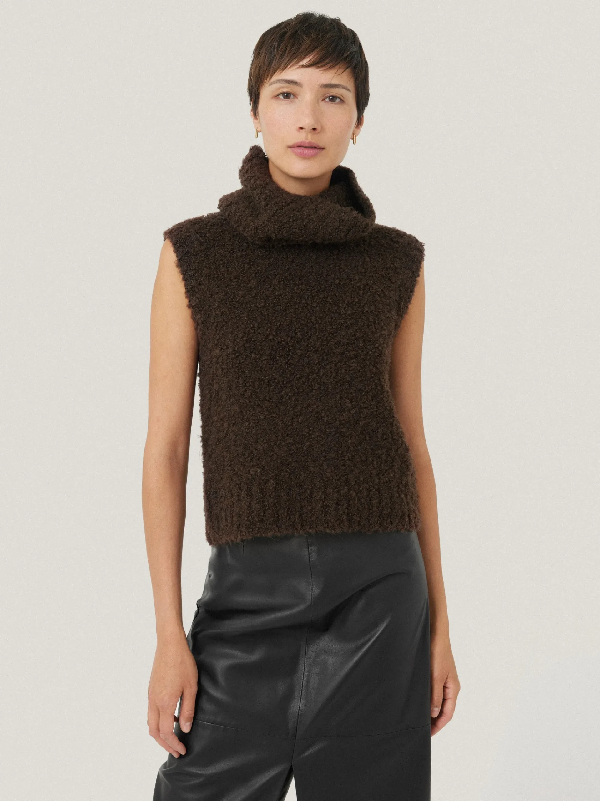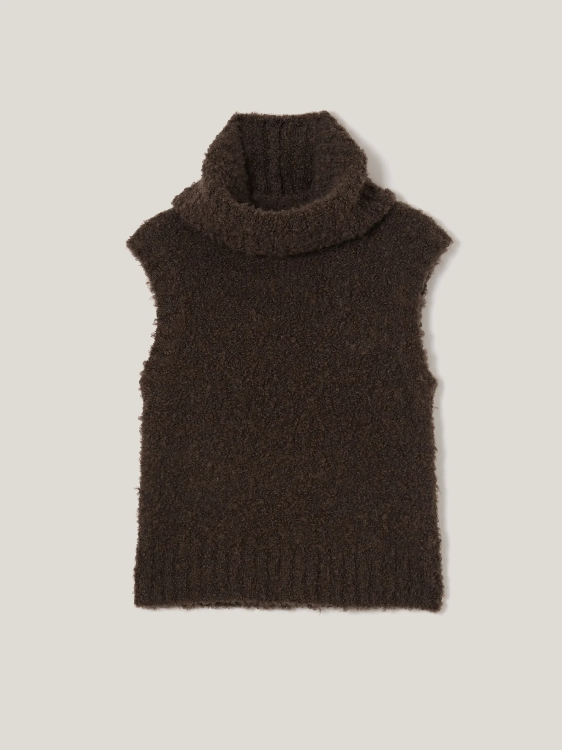 Cuddly boucle yarn makes this boxy tank feel super cosy and warm for the colder seasons. We love that the turtleneck collar can be detached at the neck for interchangeable looks. Perfect for layering under a winter coat.