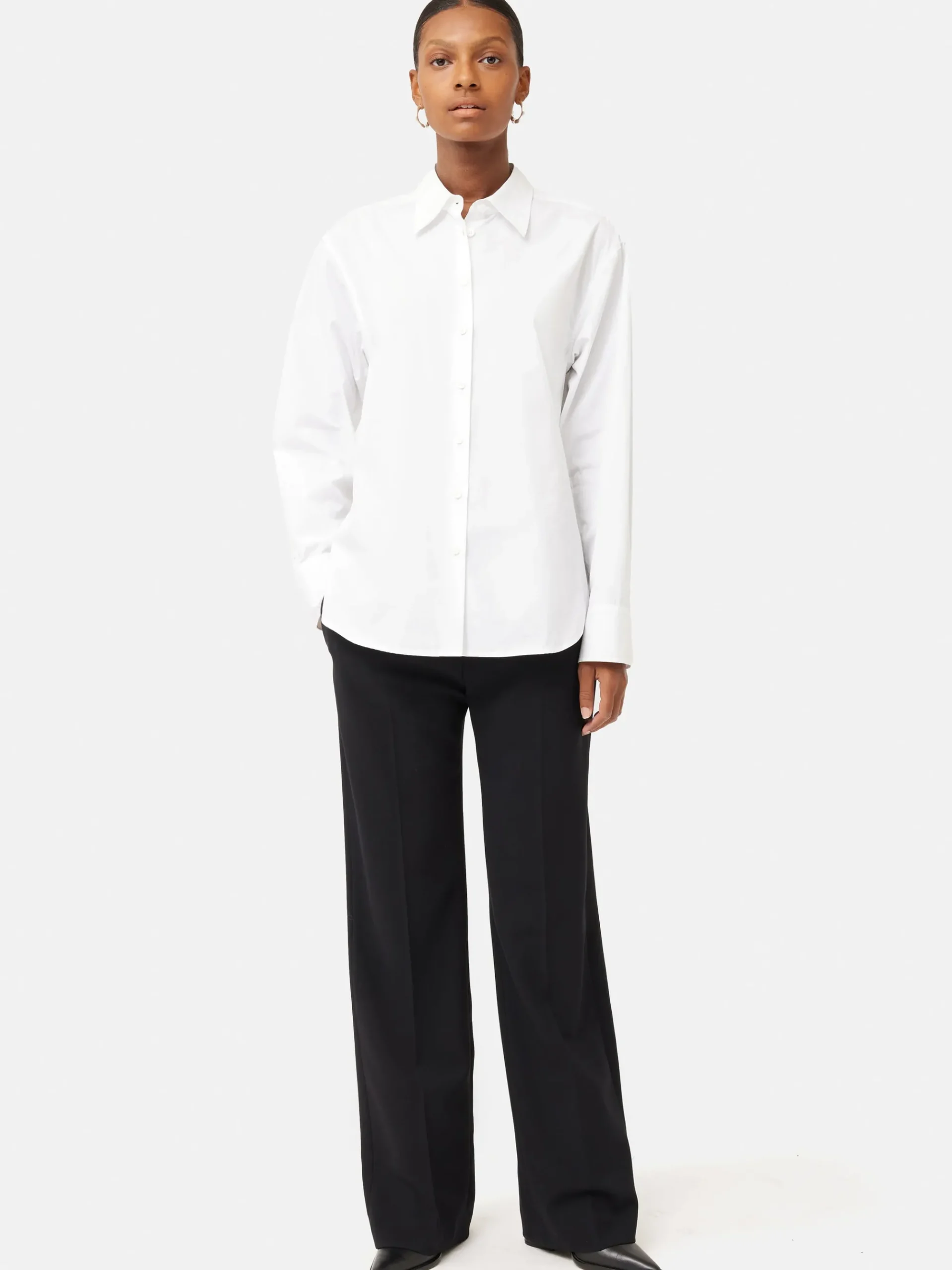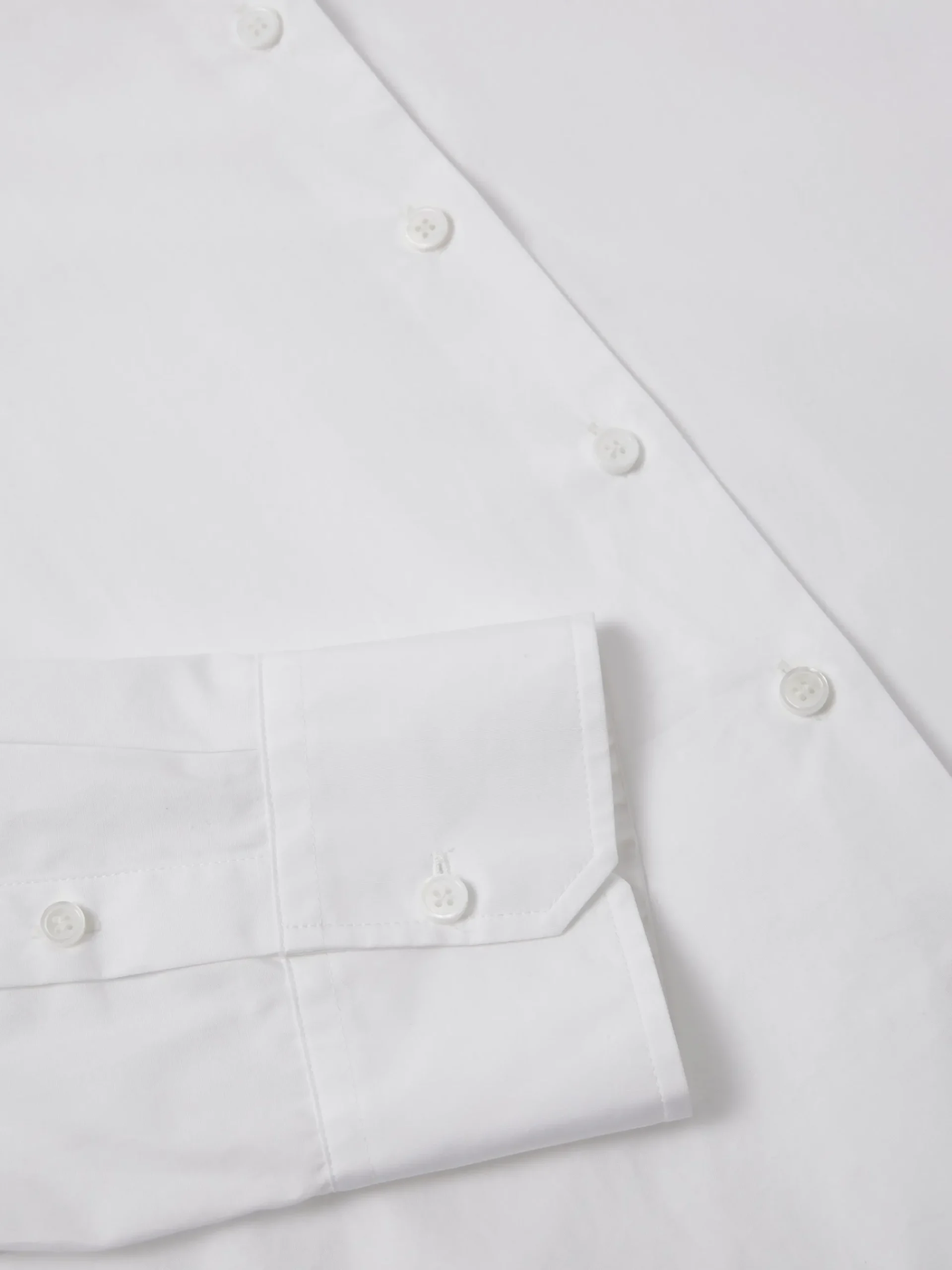 A soft cotton-poplin shirt. Features evocative of classic men styling including side slits, a box pleat and scooped shape hem. Elevated by mother of pearl buttons and top stitch details. The oversized fit allows for an adaptable silhouette can be worn tucked in or untucked with sleeves rolled up or down. Pair with some buttery leather separates for a clean and crisp finish. Fit and Features