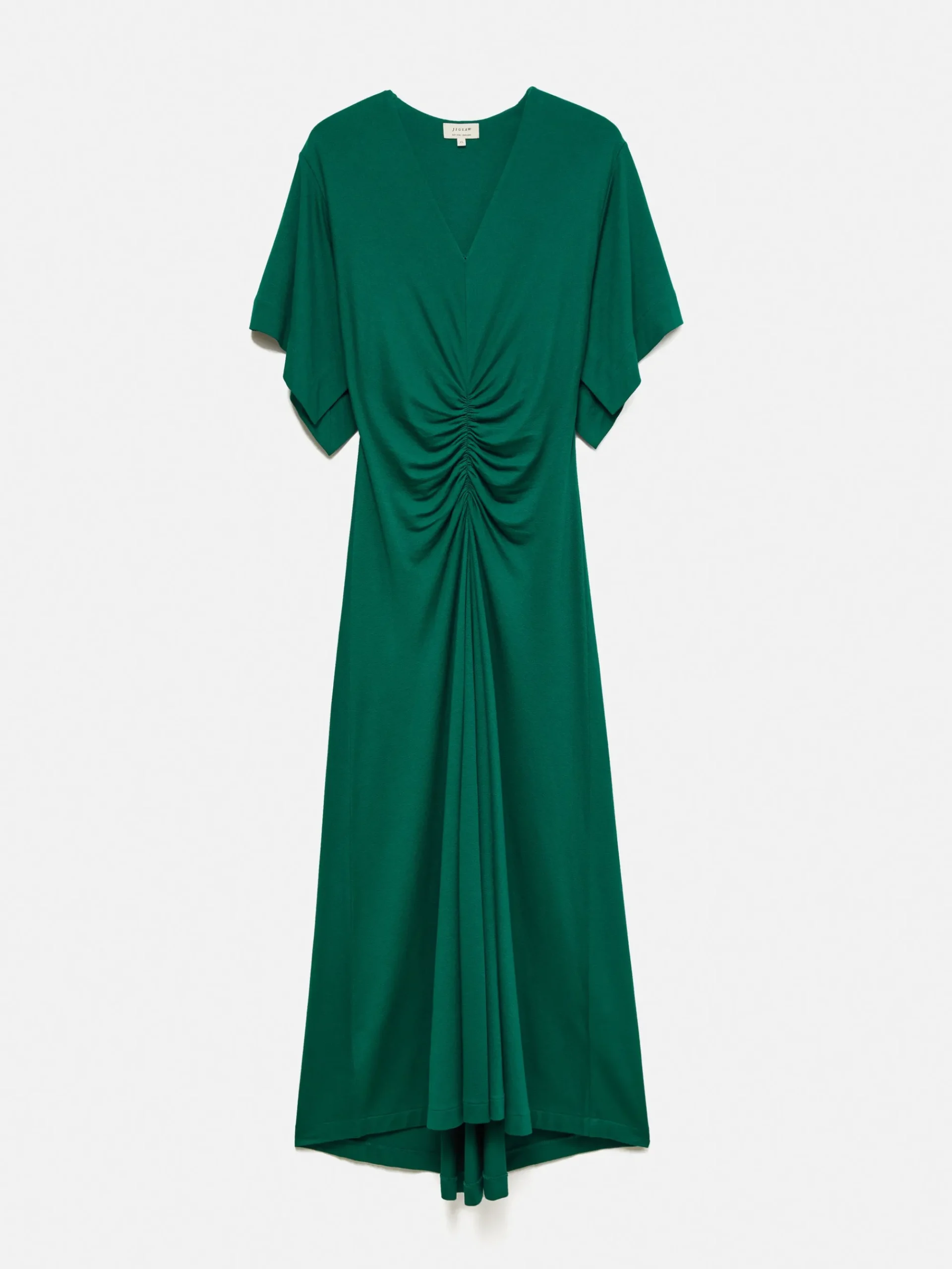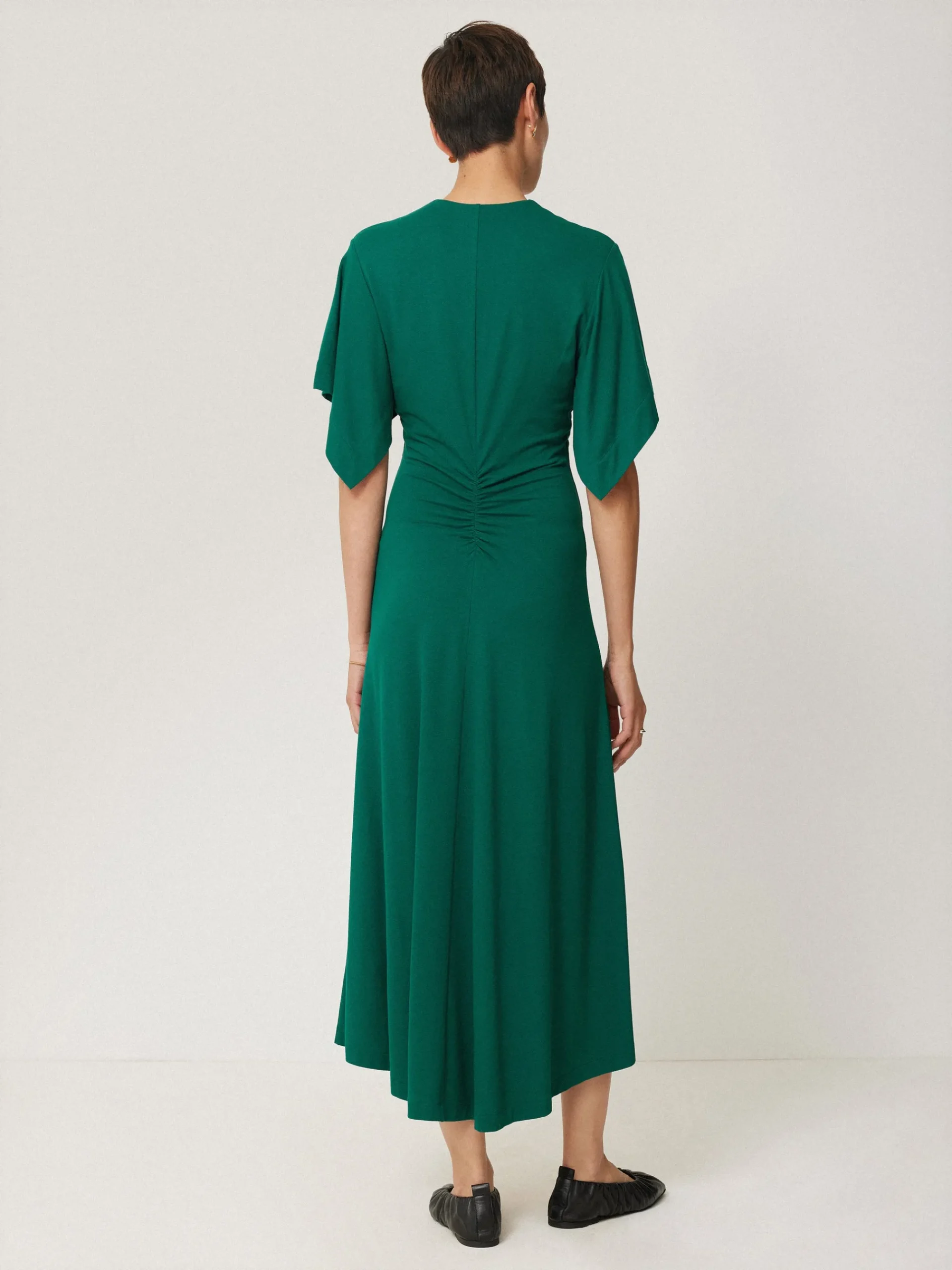 This midi dress is ready to grace your next event in a rich, emerald jewel tone. Soft jersey fabric hugs and flatters the body in all the right places, while ruched detail to the centre of the bodice and flutter sleeves frame this piece, whether worn in the day with flats or dressed up with heeled sandals.