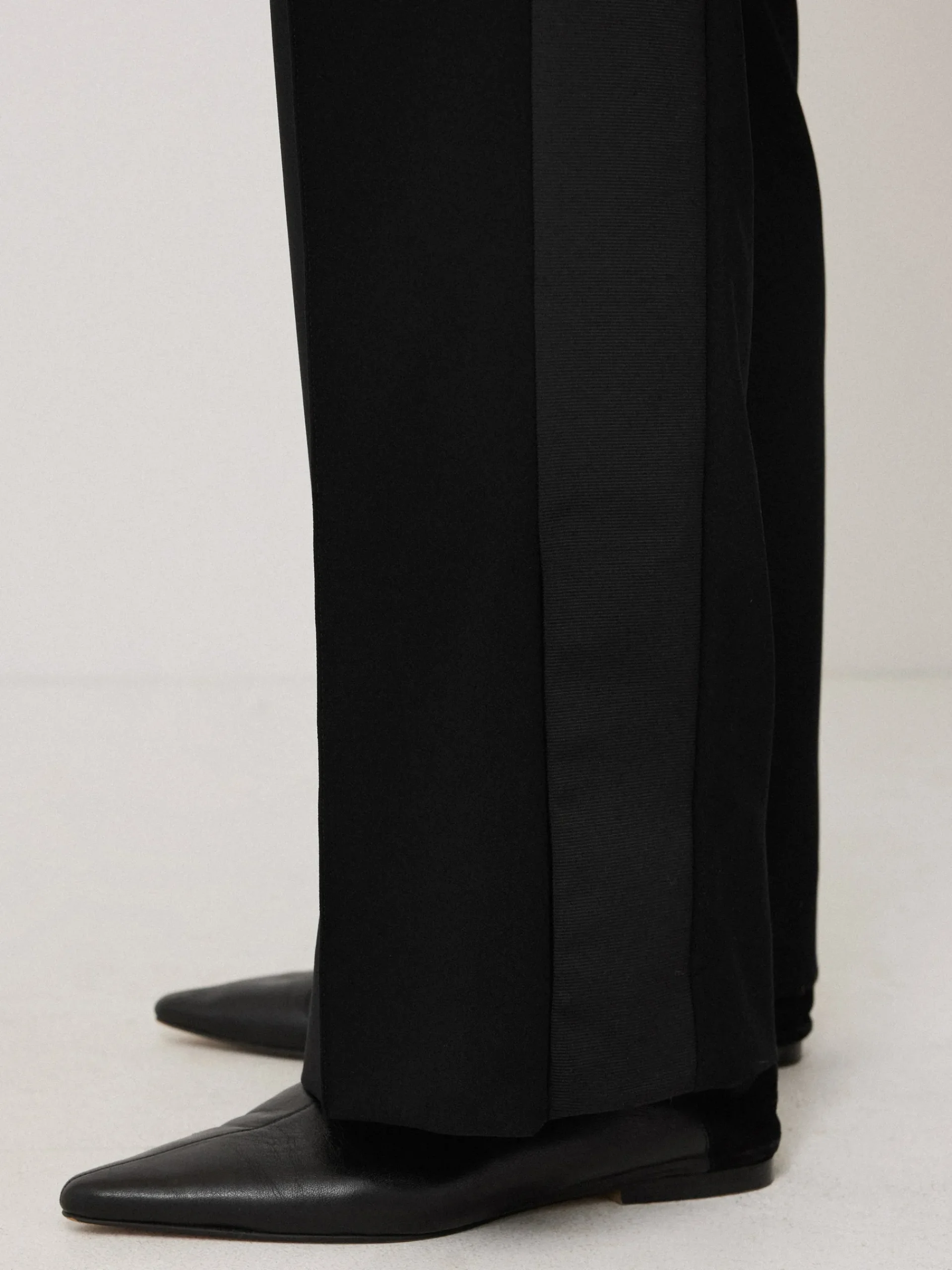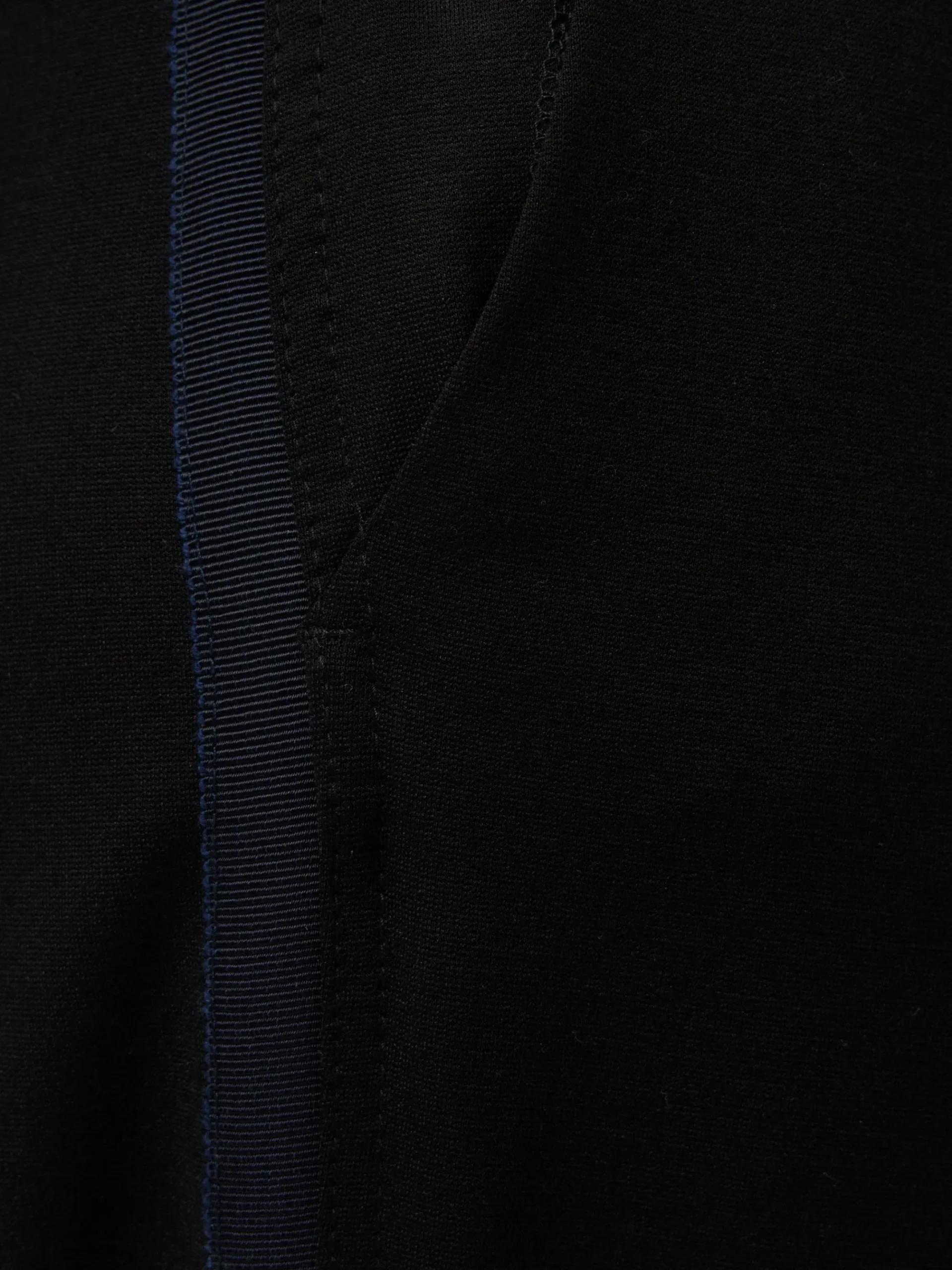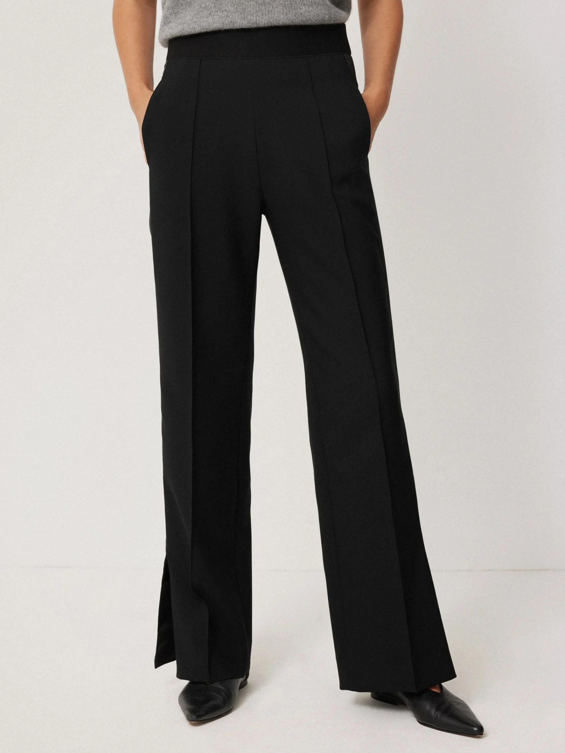 Stylish jogger trouser in an Italian soft crepe with textured fabric side leg detail. Designed with a contrast elastic waistband for a more relaxed fit. Features a pin tuck crease down the front and a split hem detail.
