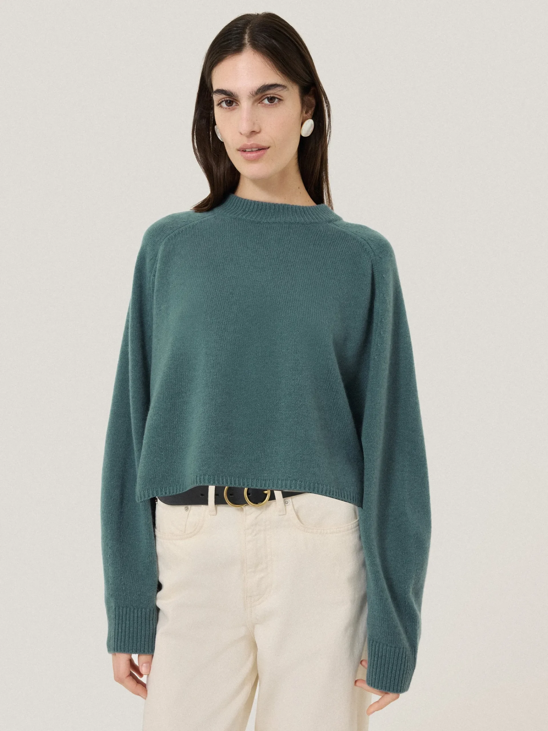 A unique fusion of a poncho and a jumper in luxurious merino wool, this crew neck style features a distinctive design where half the sleeve remains fixed. The boxy, cropped silhouette allows for dynamic layering. We love it with the sleeves rolled up against a tailored pair of trousers.