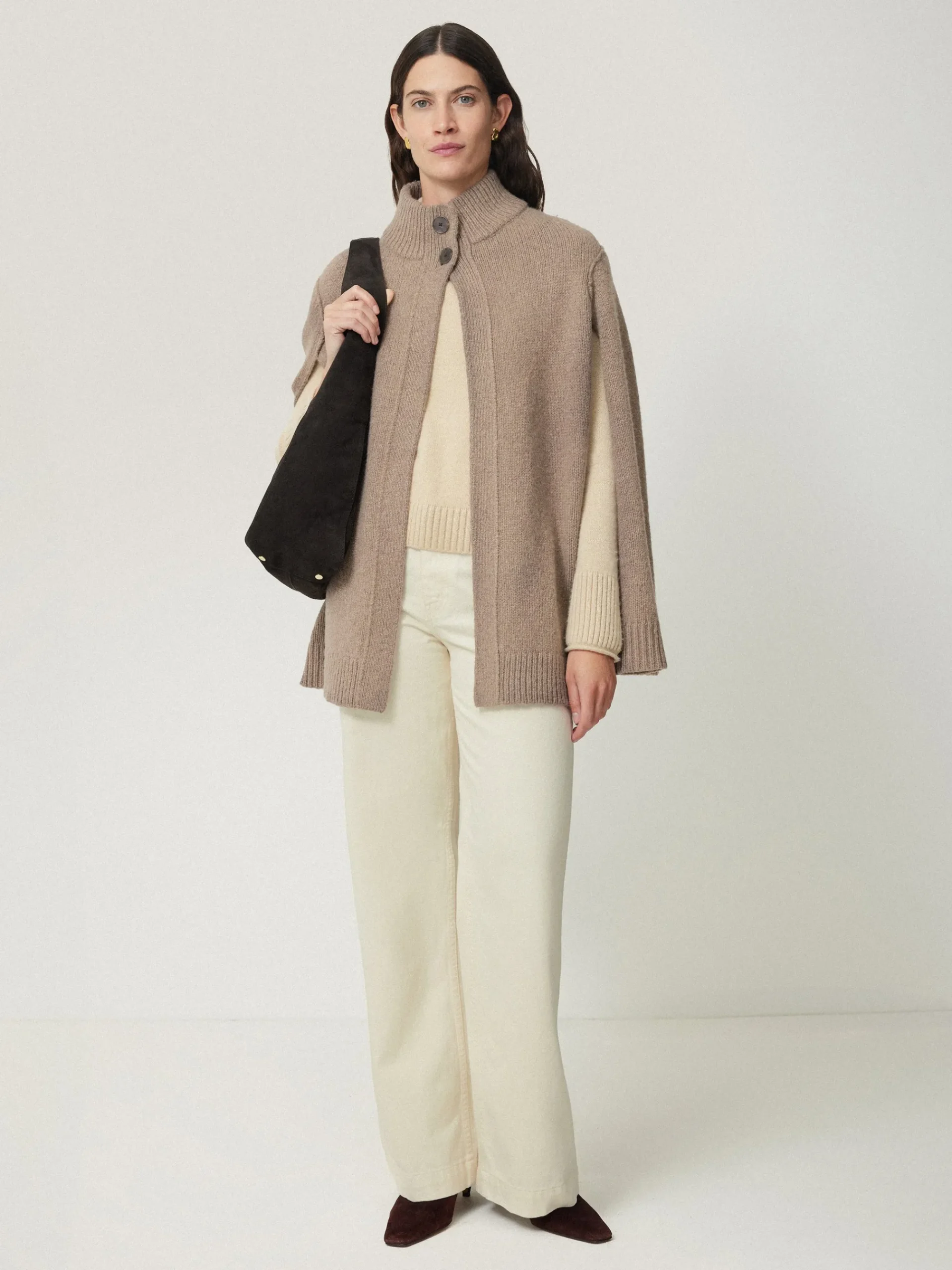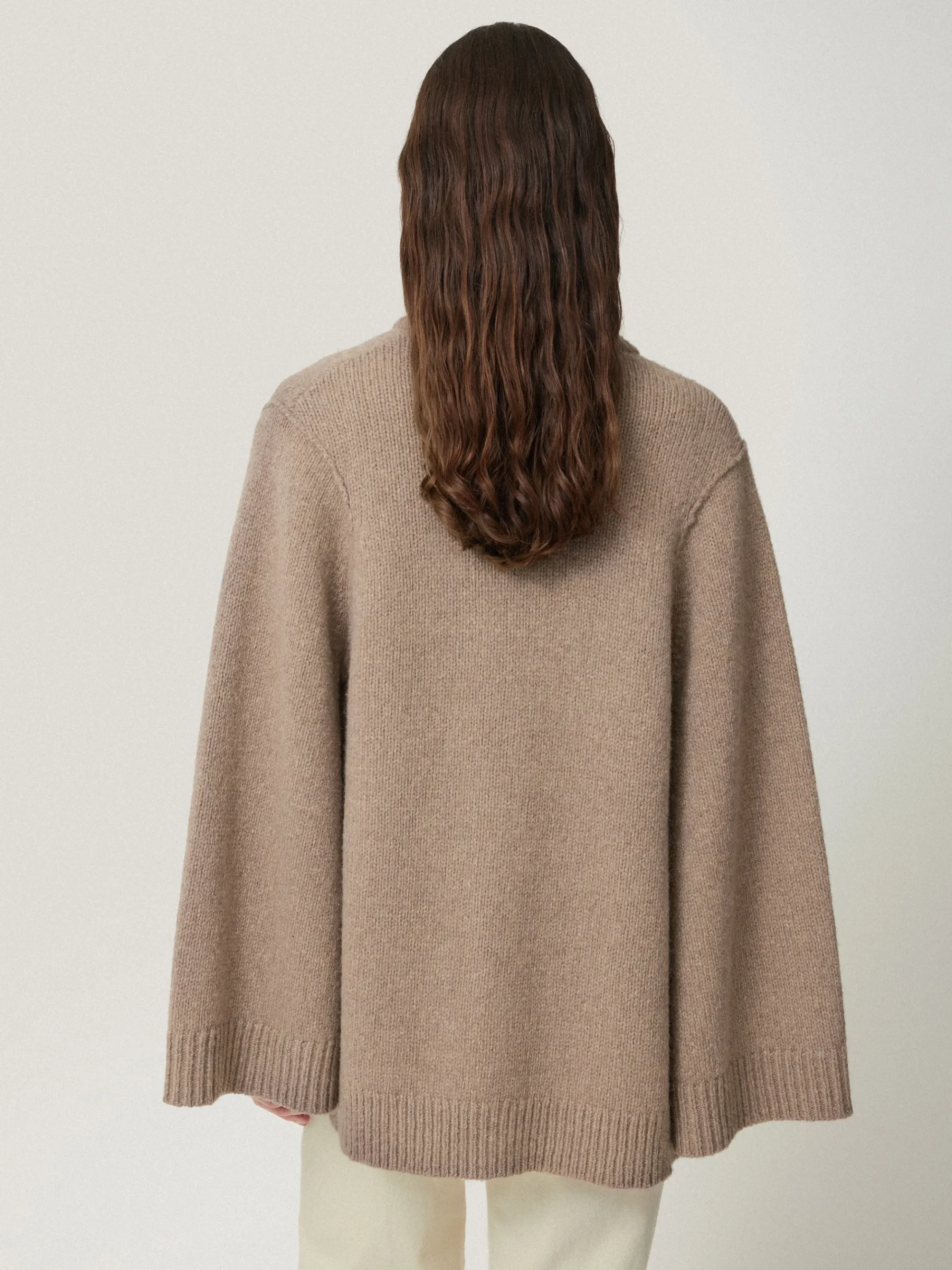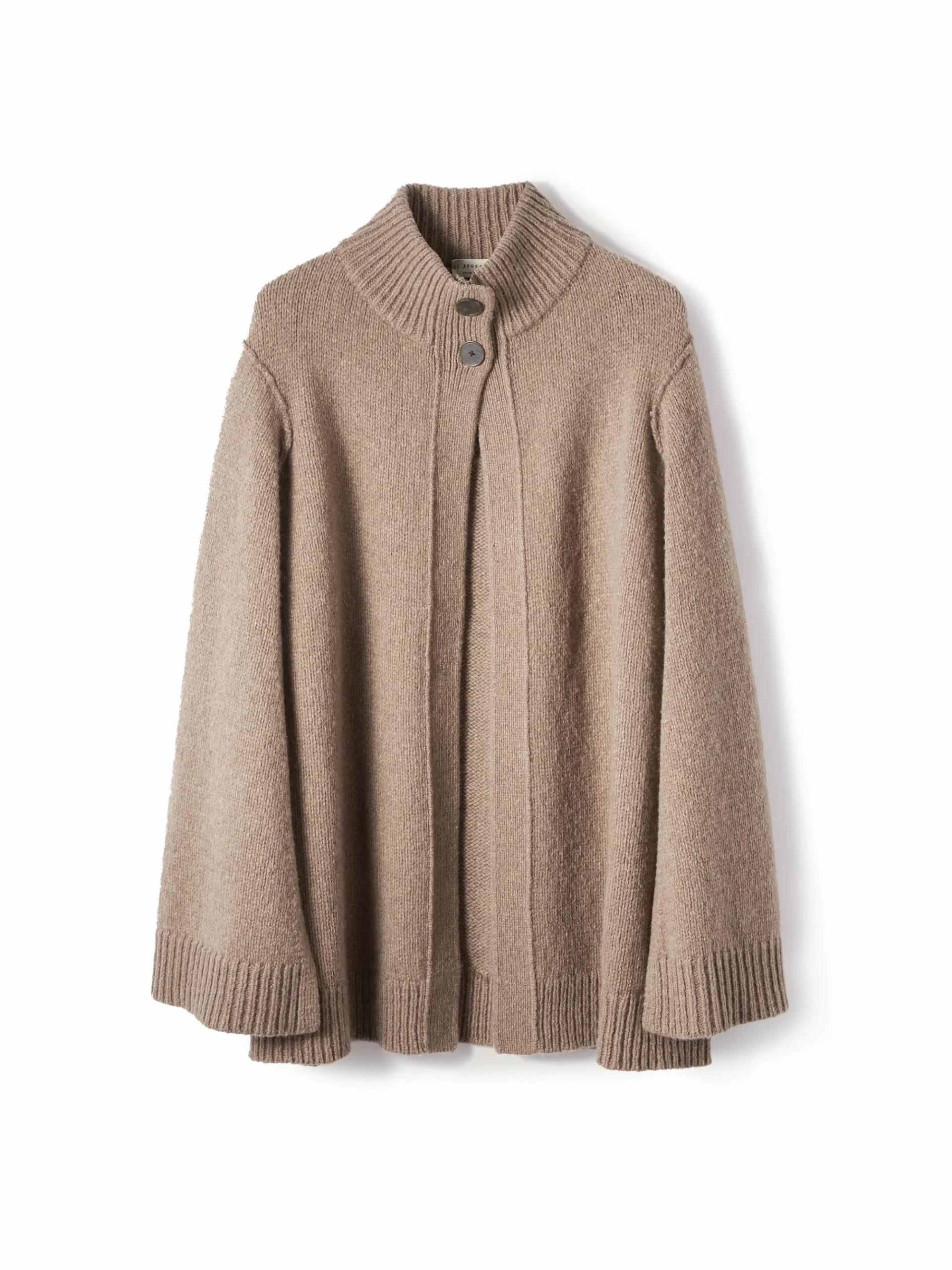This poncho is based on a slouchy turtle neck jumper from our archives. We deconstructed the design for the new season by unpicking the external seams while keeping some of the detail. This gave the piece freedom with open sleeves for wearing over all your best chunky knits. Wear when you need a warm layer but don’t want to get into a coat.