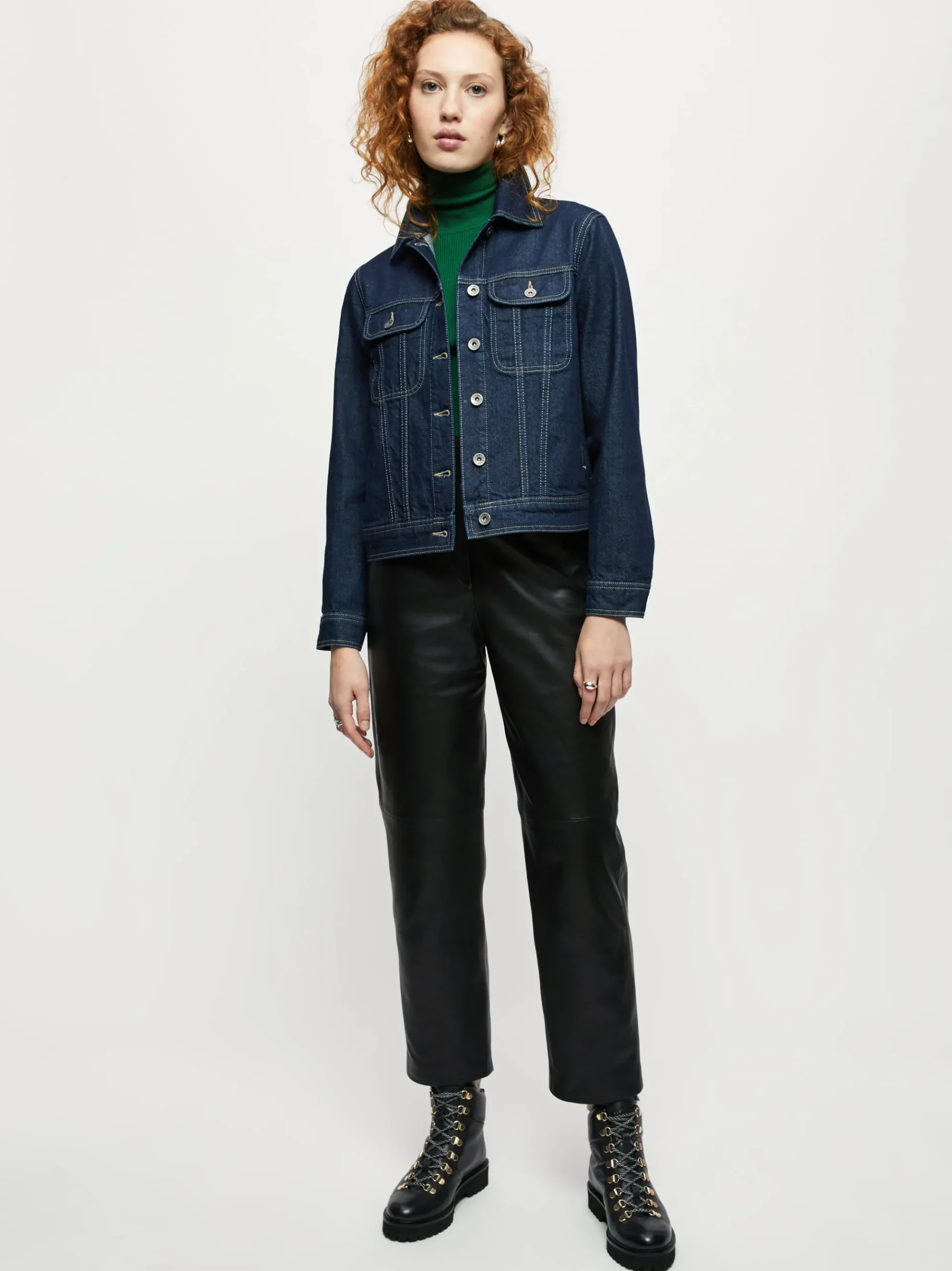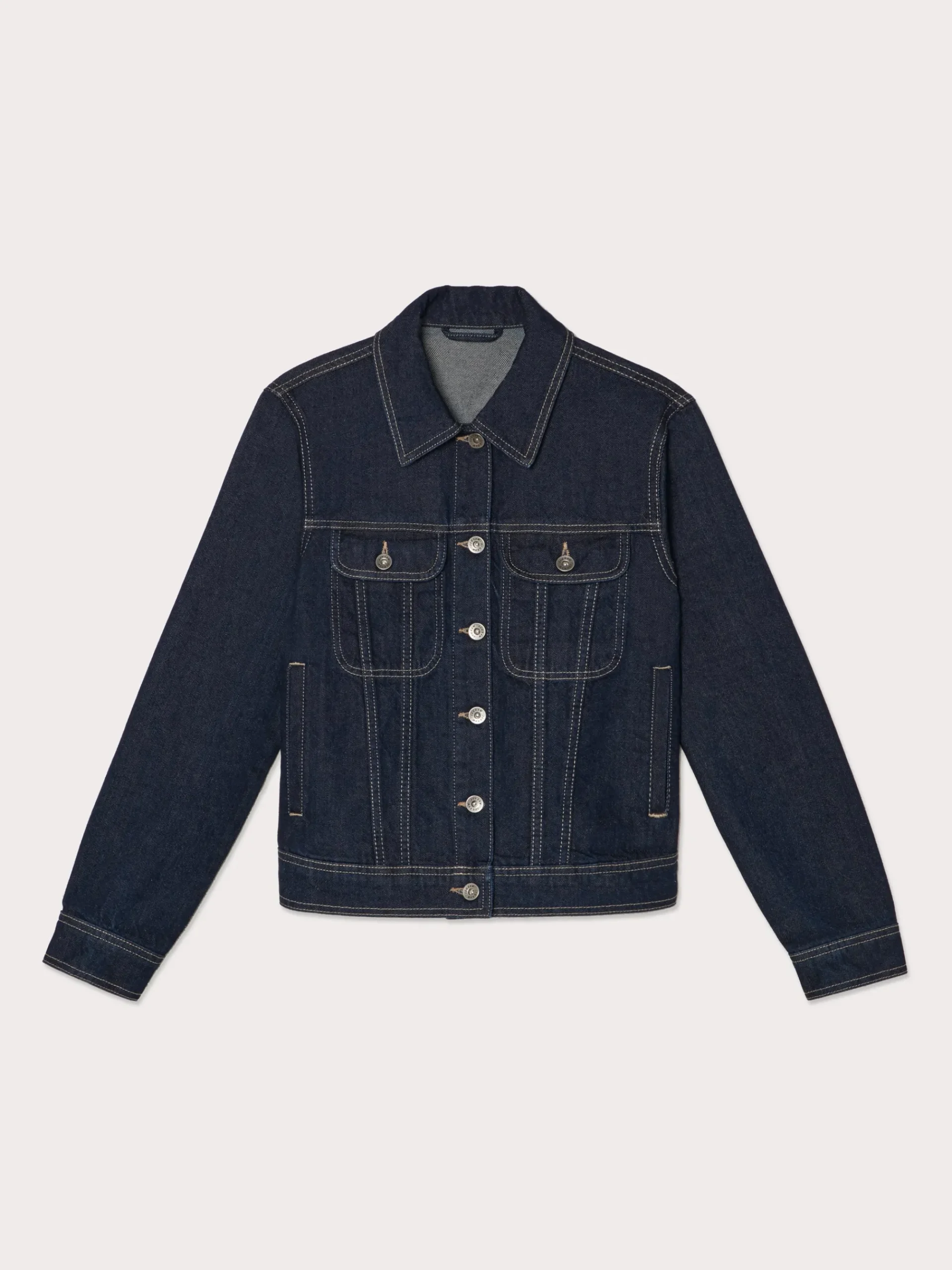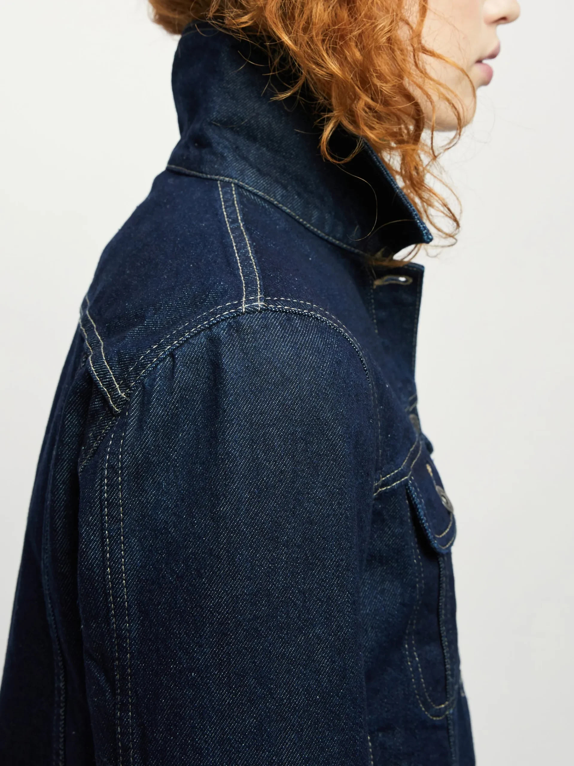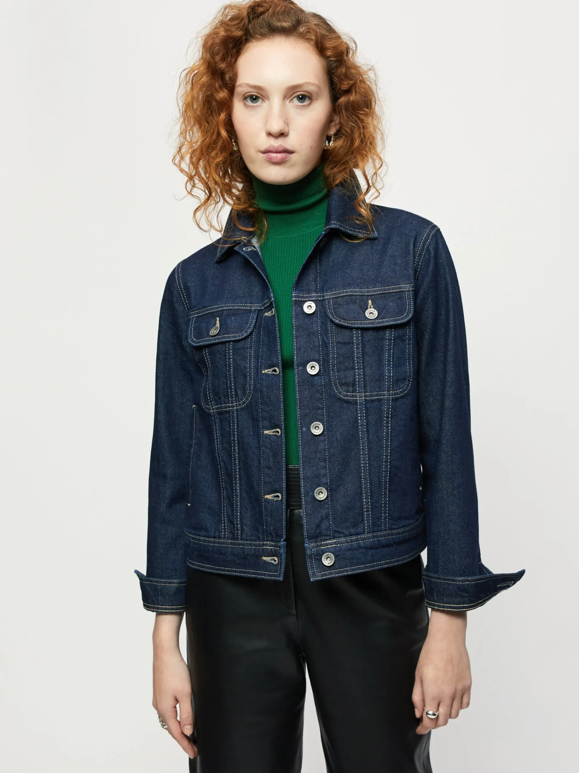 The classic trucker jacket. Sustainable fixed denim in an authentic vintage stonewash blue. Slim fit with side pockets and copper trim. Get the look and wear over our printed tea dress or double up with our jeans. Fit and Features
