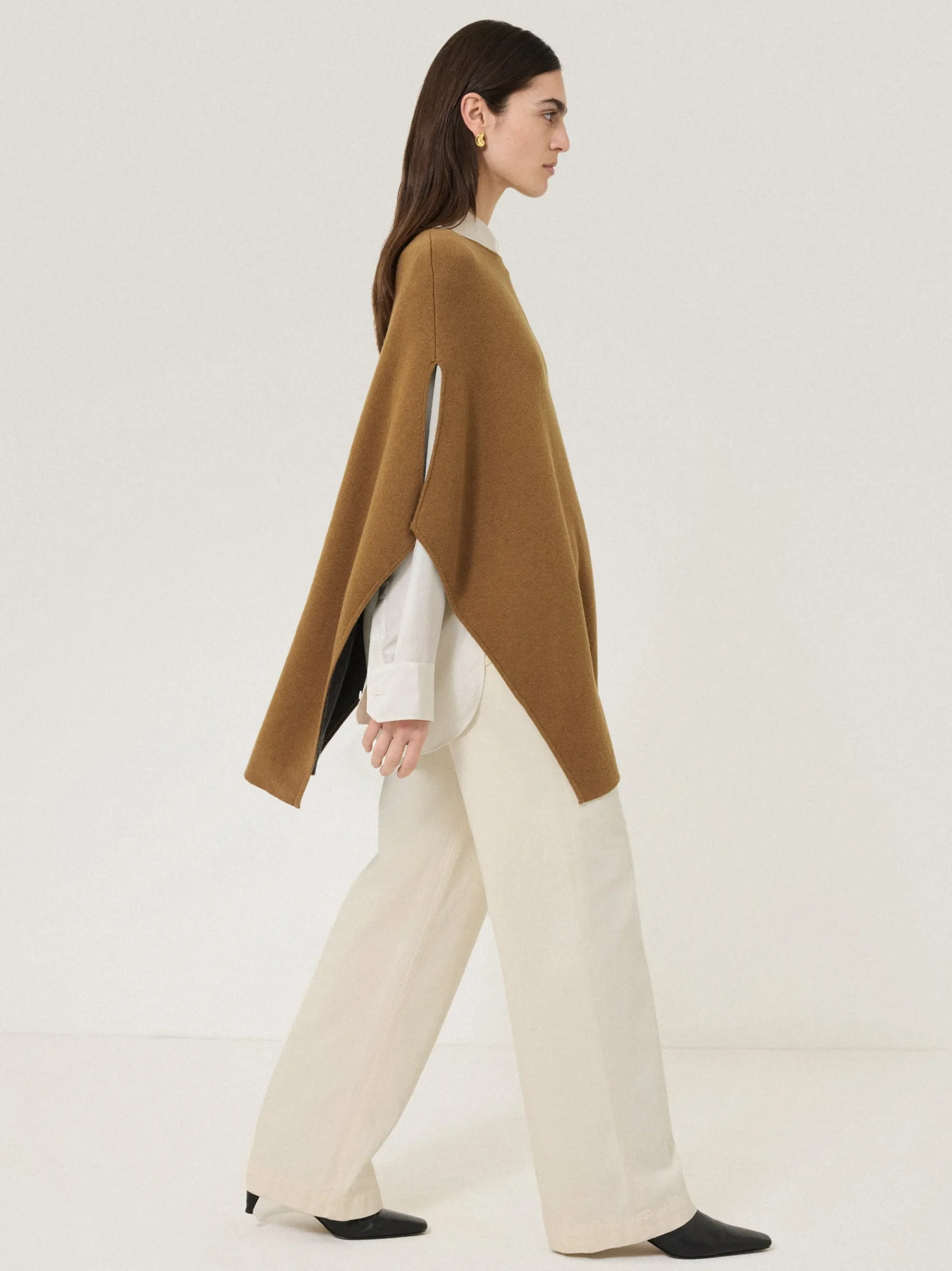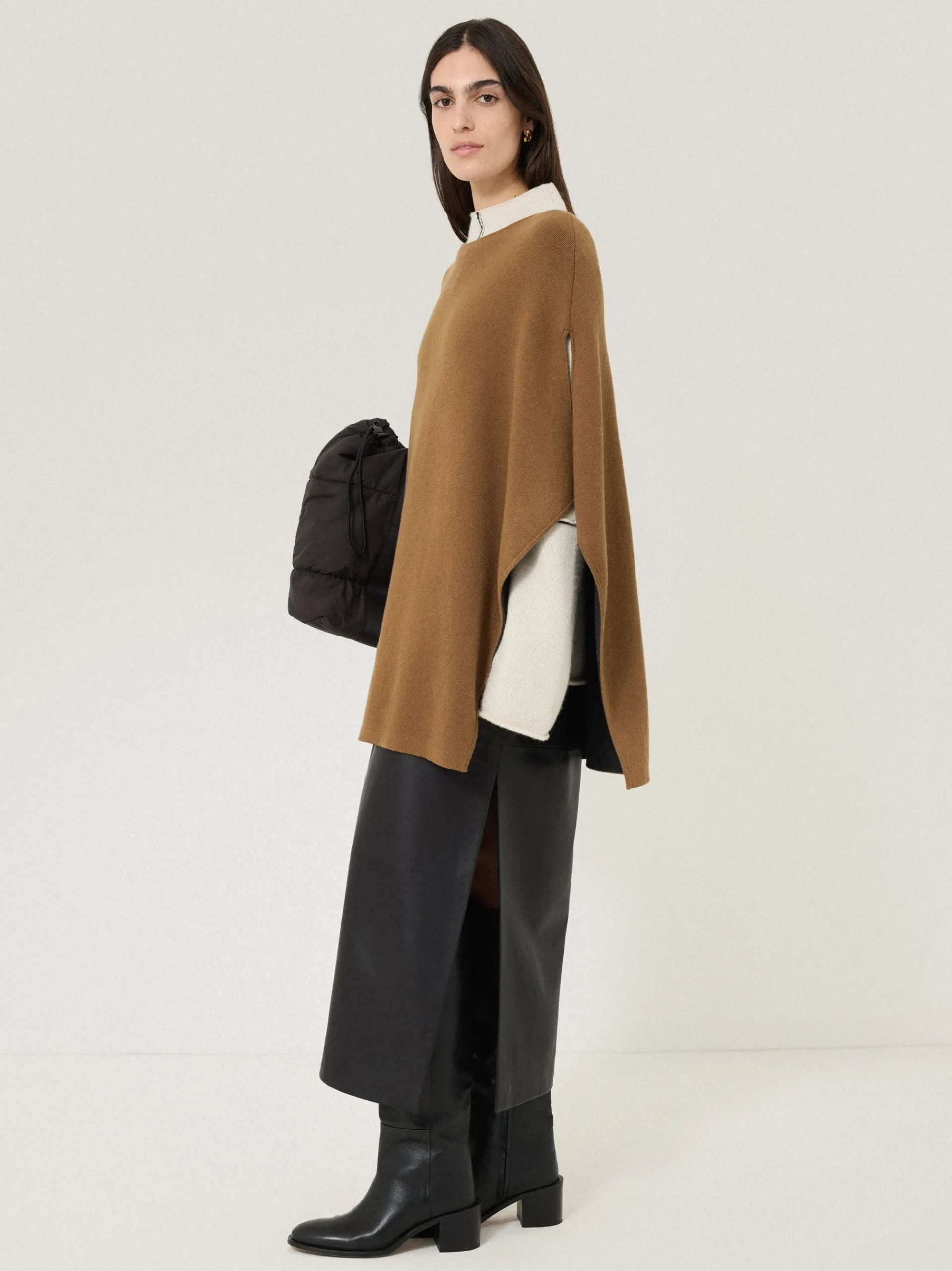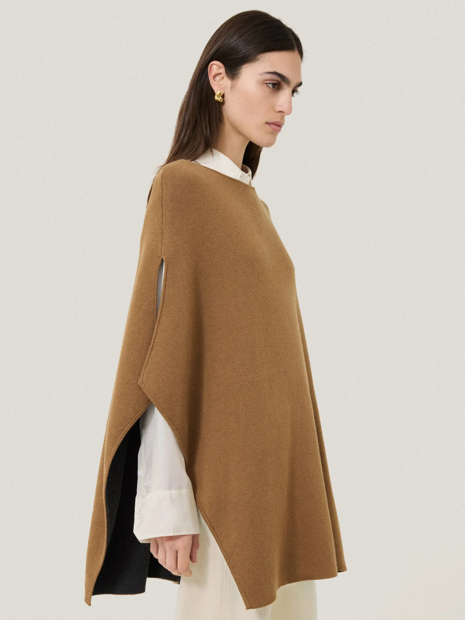 The boho-inspired poncho is back and even more luxurious than ever in a classic camel shade. Crafted from a double-faced cotton blend knit with a beautiful drape, wear over tailoring and basics equally for a sophisticated and unflustered approach to layering.