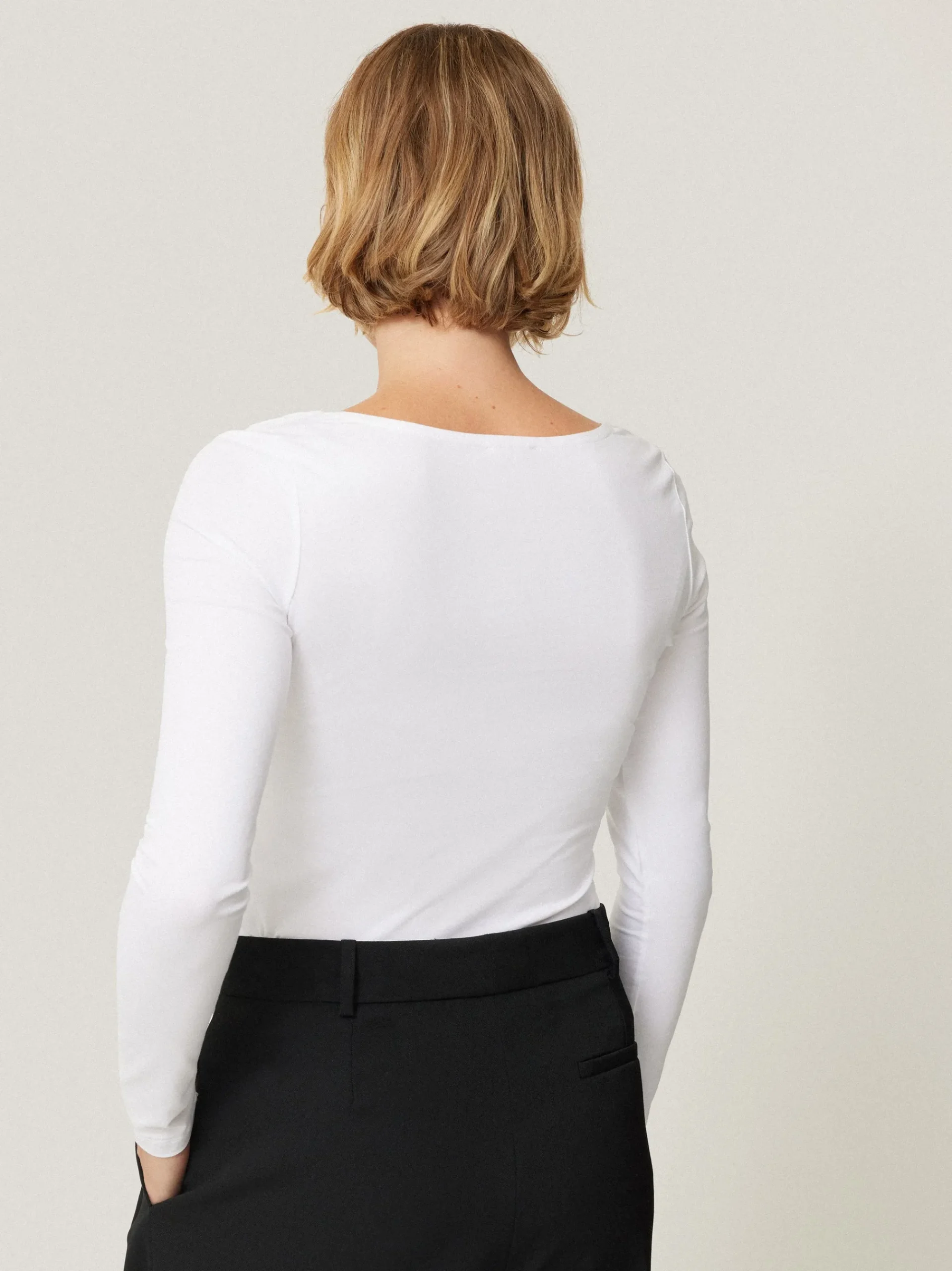 Stretch cotton lycra top featuring a double layer front panel. The neckline is cut with a flattering scoop and has a clean finished edge. The fitted body and narrow sleeves give a streamlined silhouette making this a perfect layering piece. Fit and Features