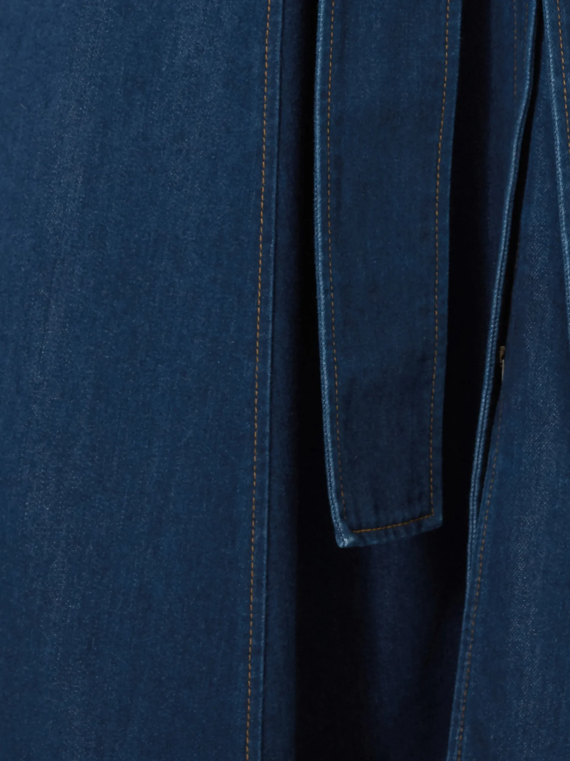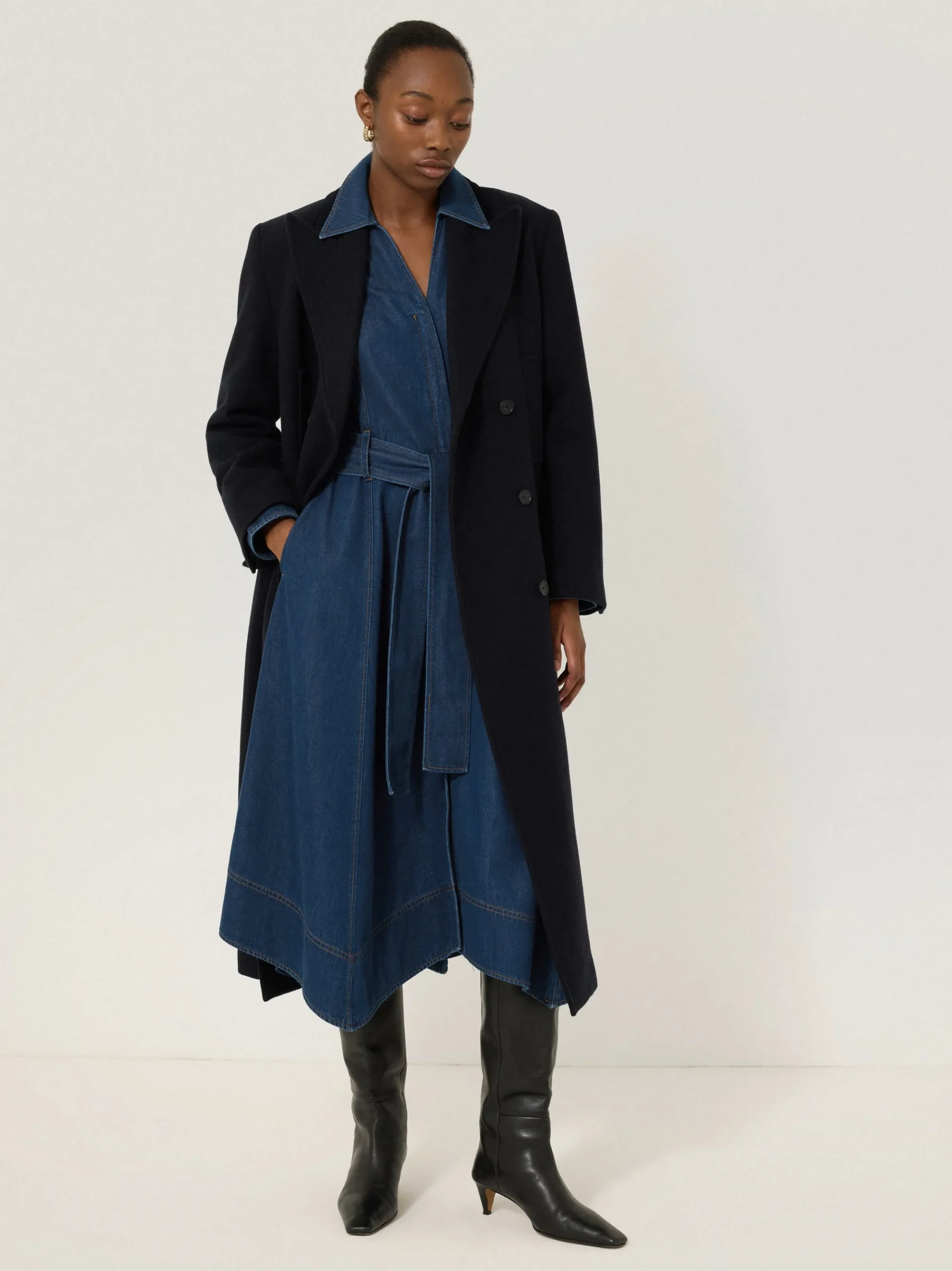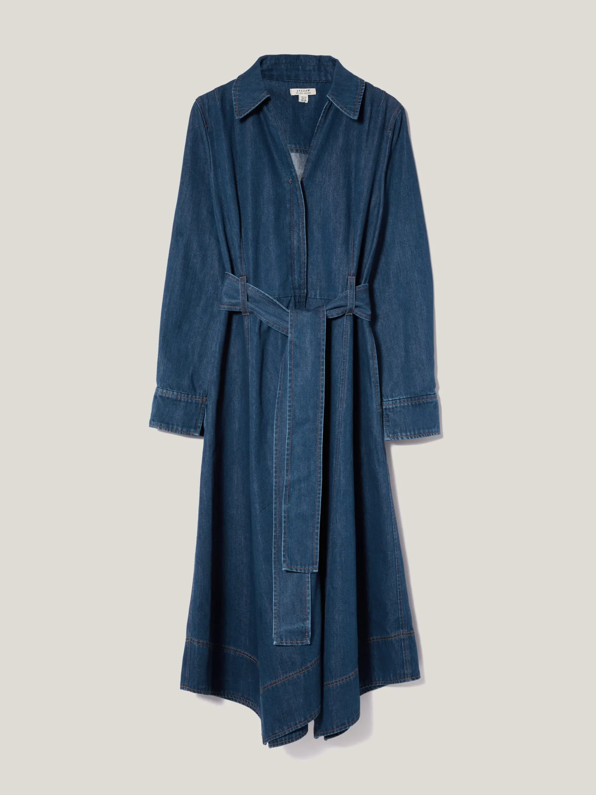 Denim shows its fluid side with this shirt dress for the new season. Designed in a mid-blue wash, the belted waist and handkerchief hemline lends beautiful movement to match its flowing shape. Match with a pair of high leather boots.