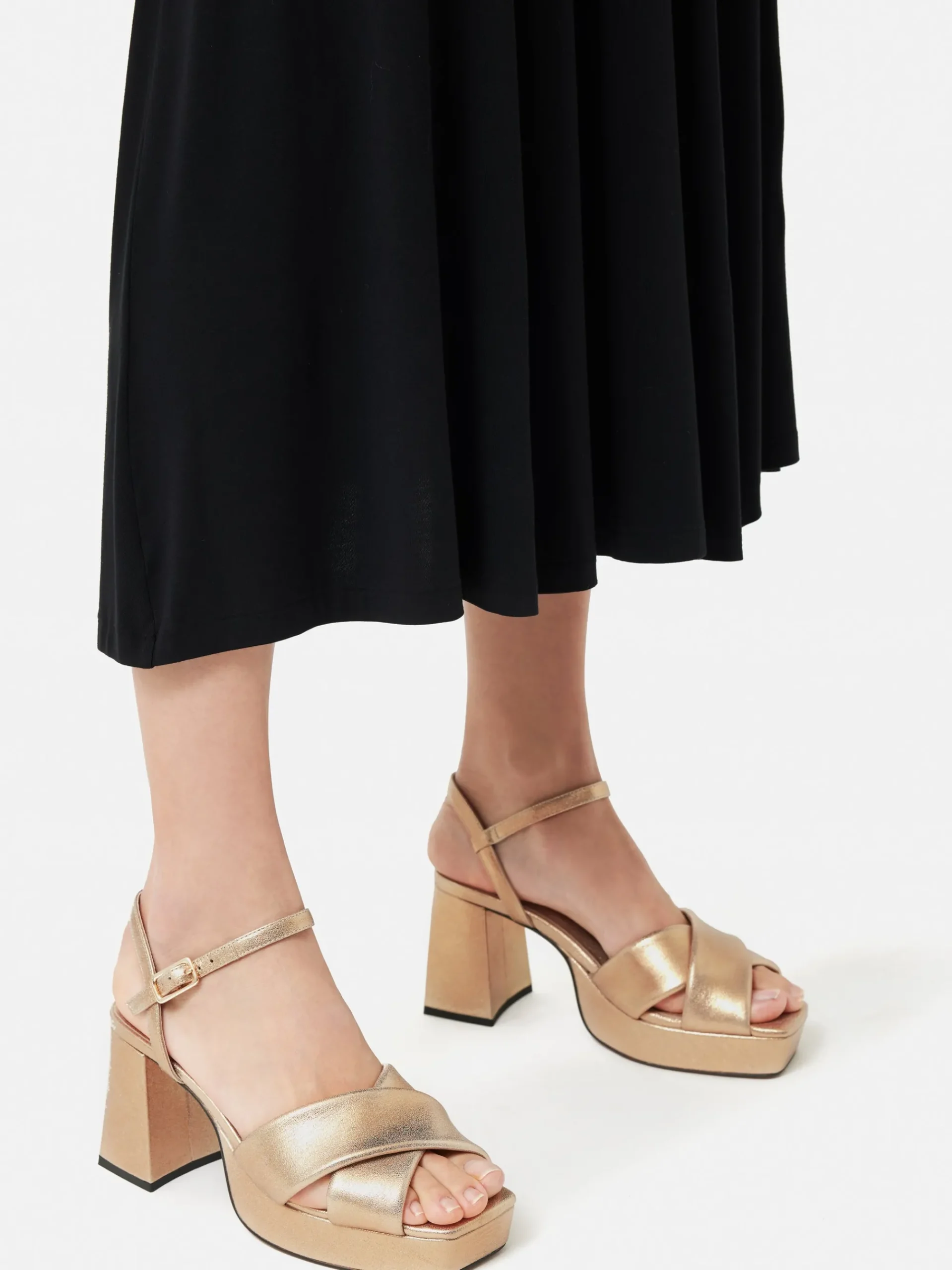 Arriving in premium black suede and gold leather the Hanna Platform Sandal features a wide block heel, platform sole, adjustable ankle strap and padded upper for a comfortable yet stylish look. The perfect heeled sandal to dance the night away in at any spring summer occasion. Fit and Features