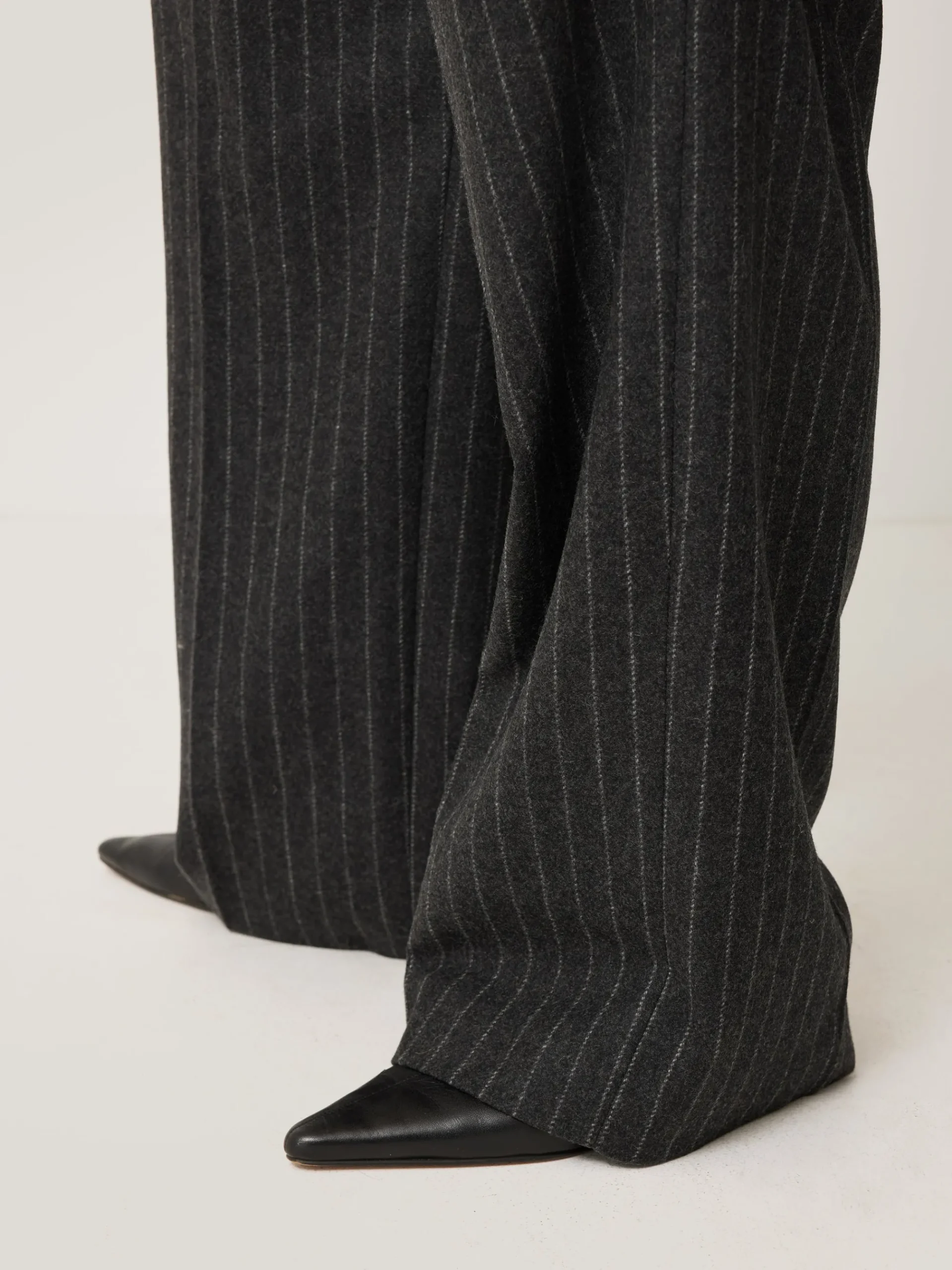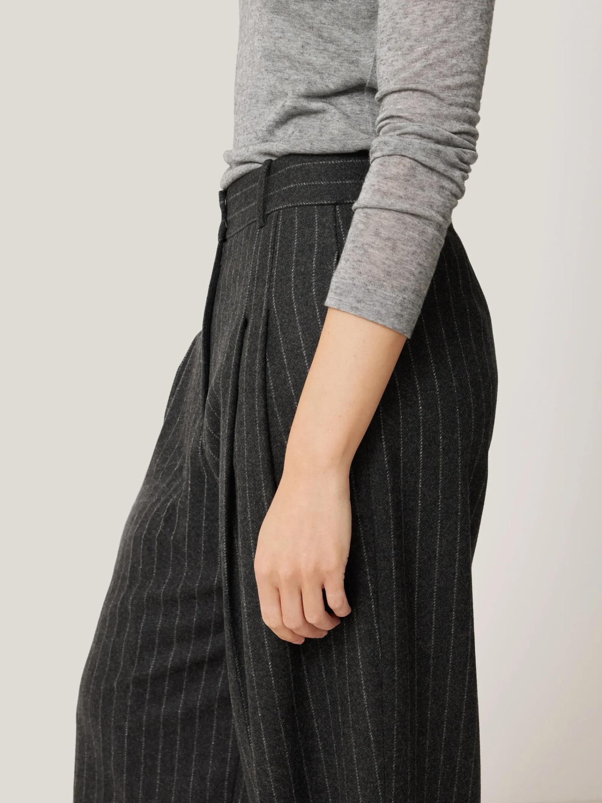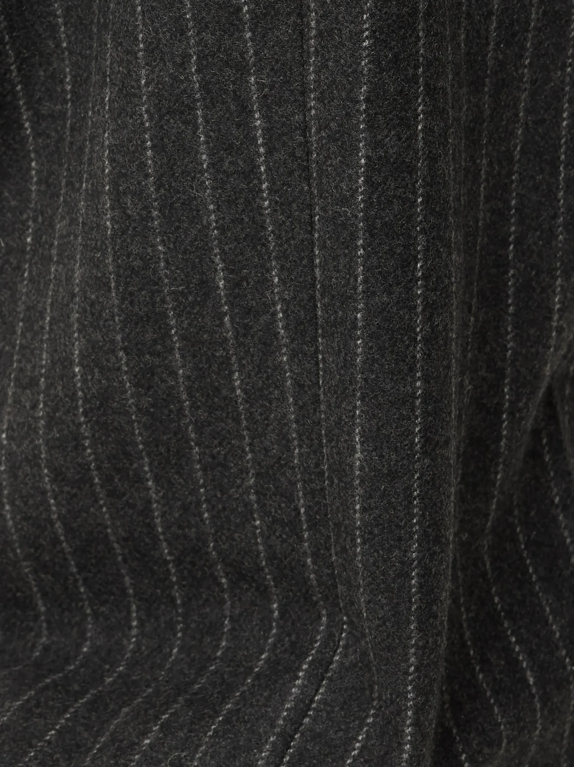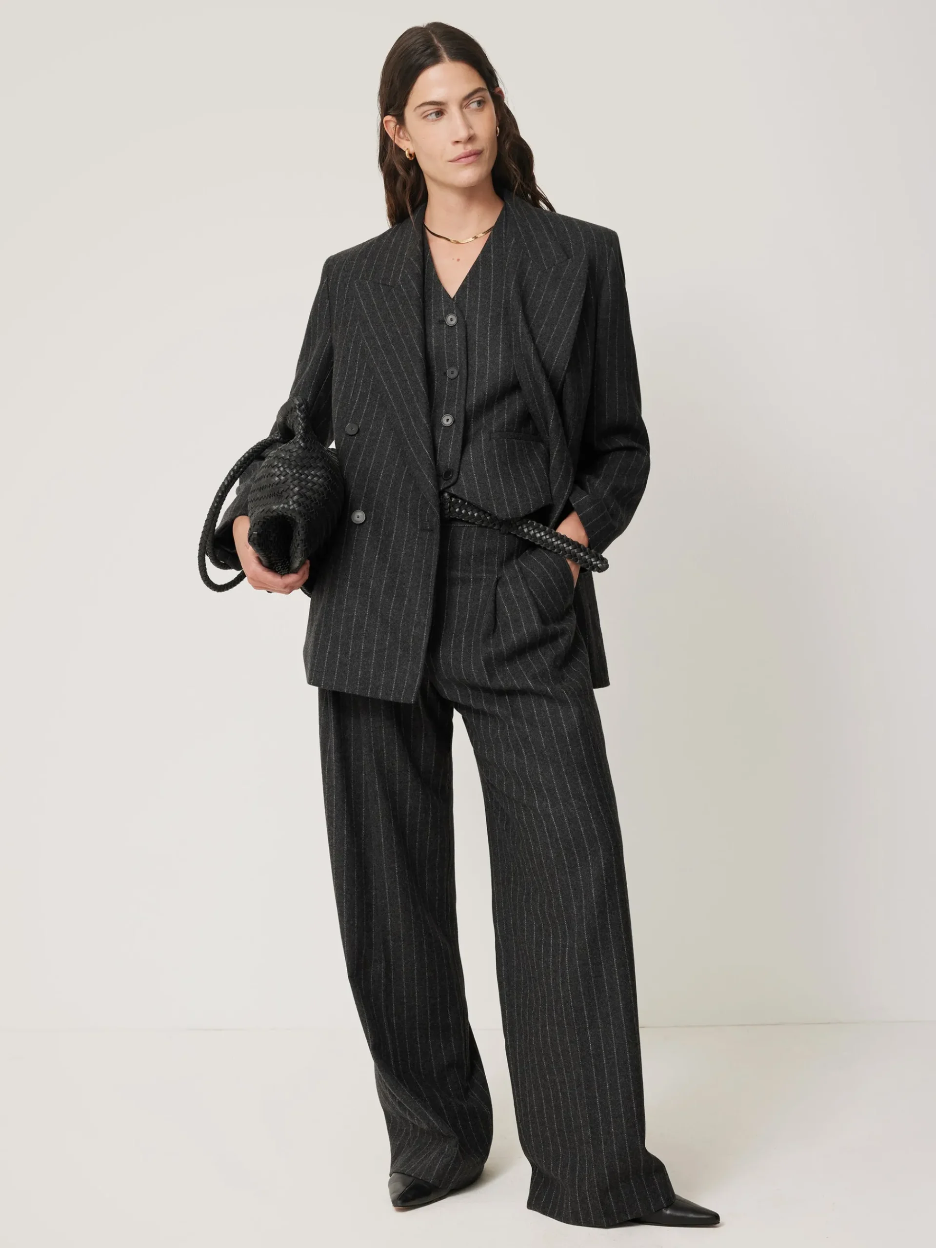 Tailored in-house using our own bespoke pattern, the Kemp trouser is the ultimate in fit. Medium rise, wide leg with double pleat detailing at the waist for a fluid silhouette. Crafted in a charcoal pinstripe wool-blend fabric from Italian heritage mill, Mantecco. Half lined, with a zip fly front hook and bar fastening, side pockets and single back pocket. Matching jacket and waistcoat complete this three-piece powerhouse suit. Fit and Features