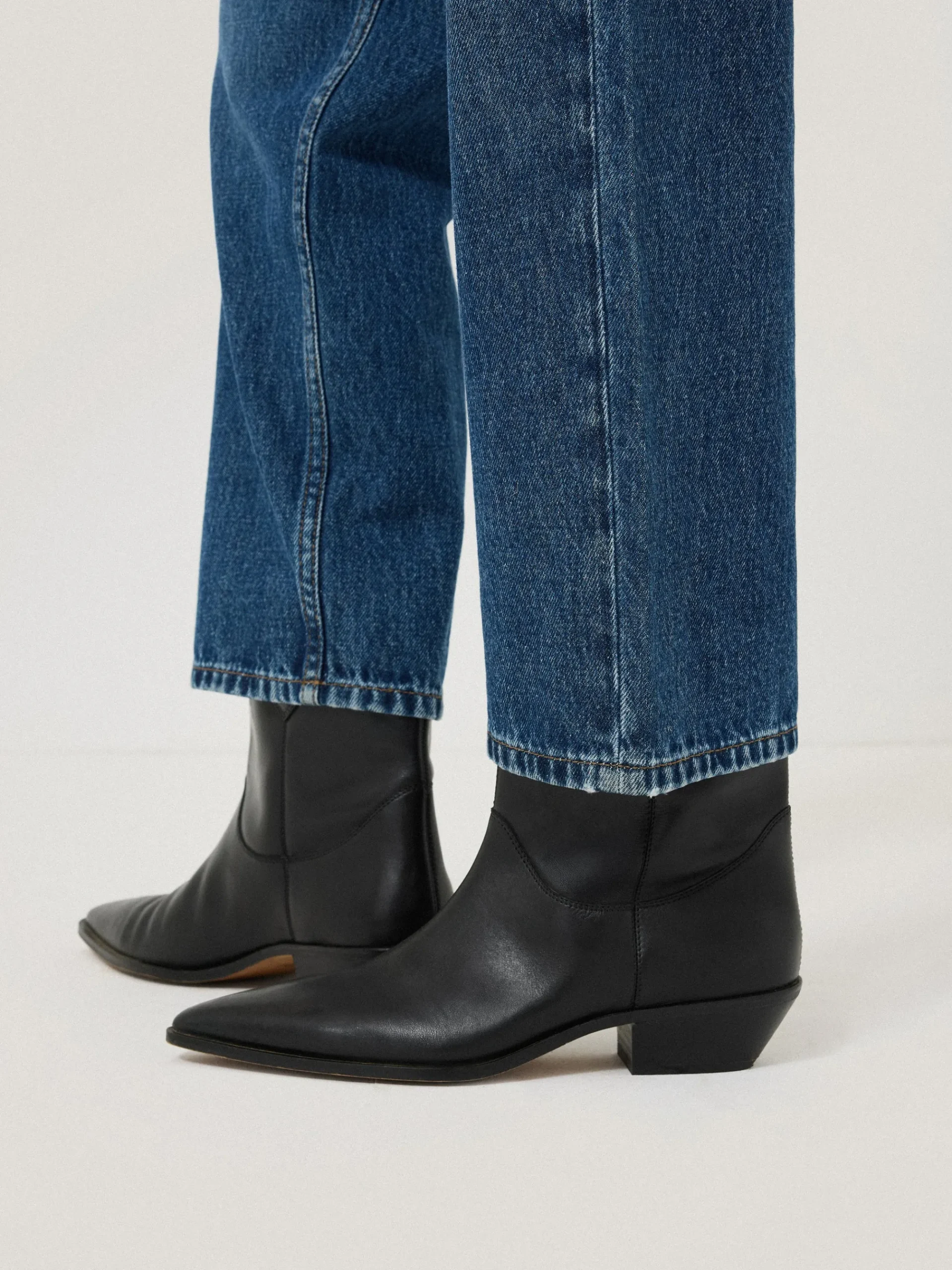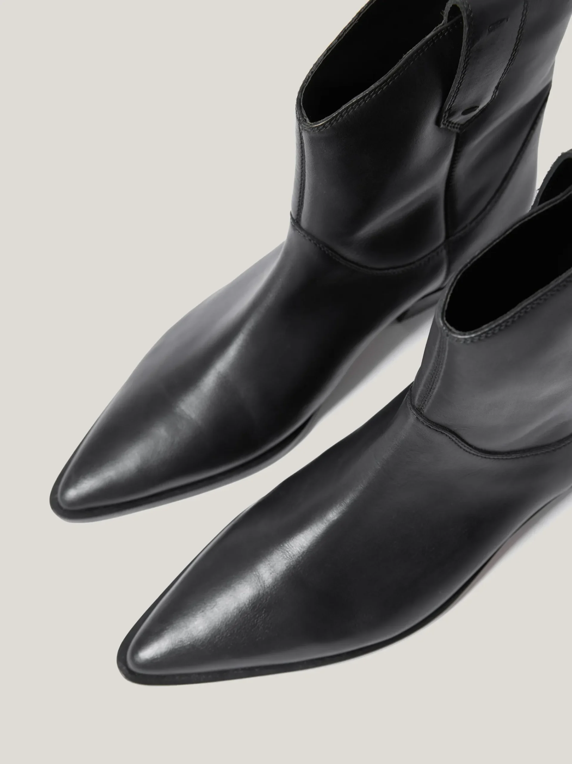 Soft leather meets a classic Western aesthetic with these ankle boots. Designed for a pointed toe and side pull tabs for ease slipping on and off, this pair are ready for striding out with all your midi dresses and jeans.