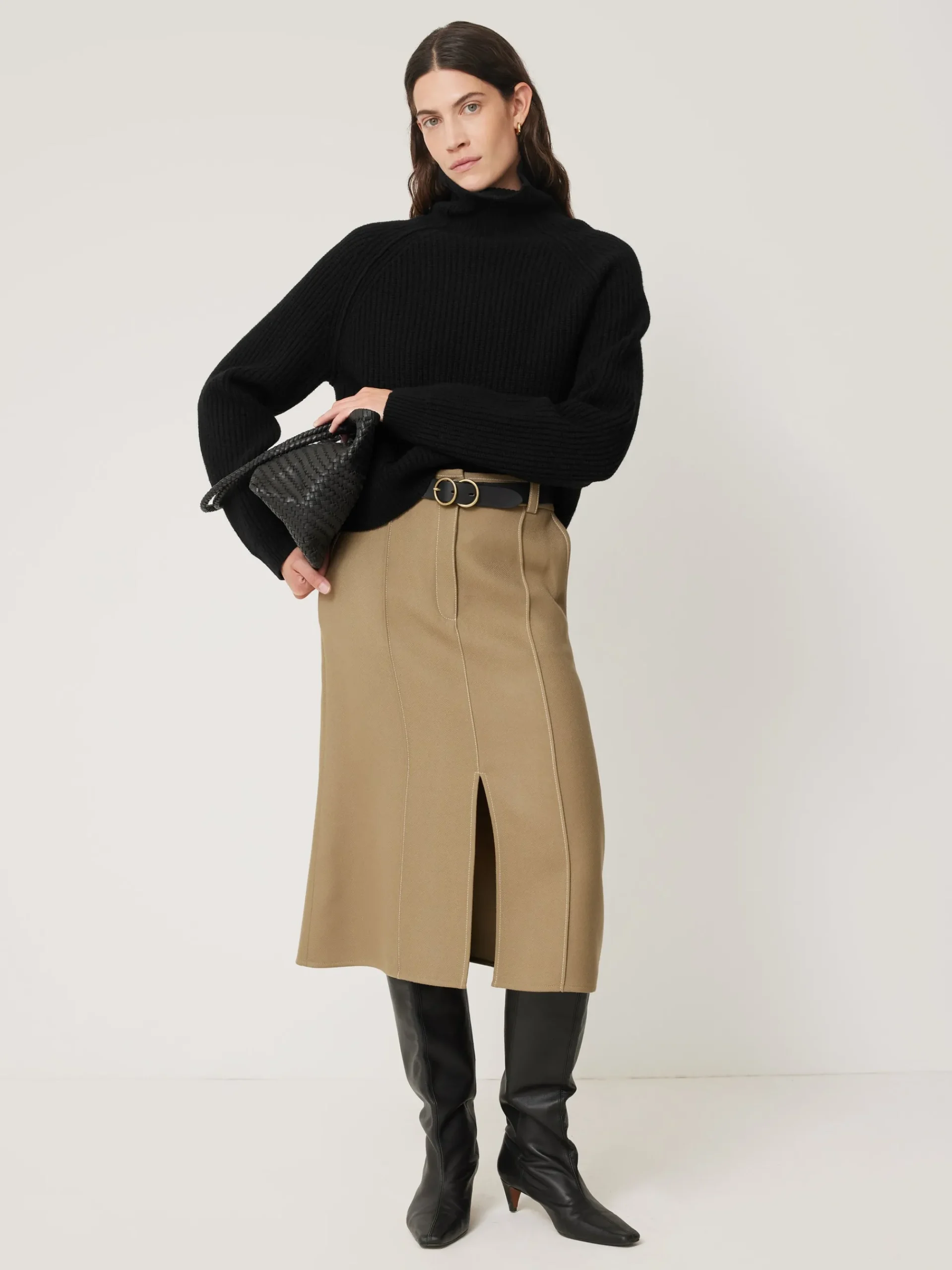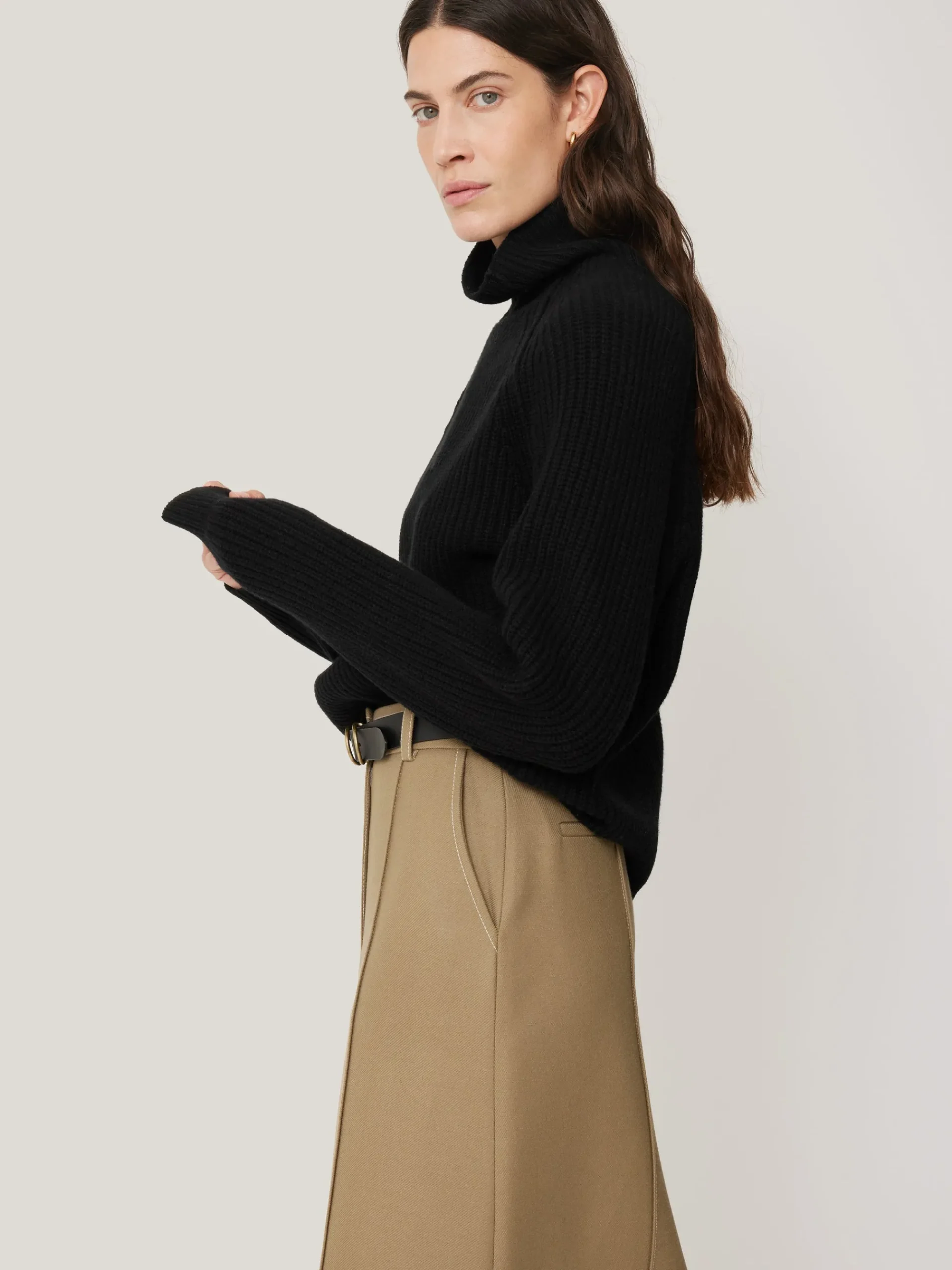 Crafted from responsibly sourced merino wool in a traditional fishermans rib stitch, this jumper will be a constant companion in the new season. Merino wool is softer than other types of wool?because of its?extra fine fibres that feel comfortable against the skin.?Slouchy silhouette with stylish external seams on the raglan armholes, wear the ribbed turtleneck pulled up under your chin to keep out the cold, or folded down. Fit and Features
