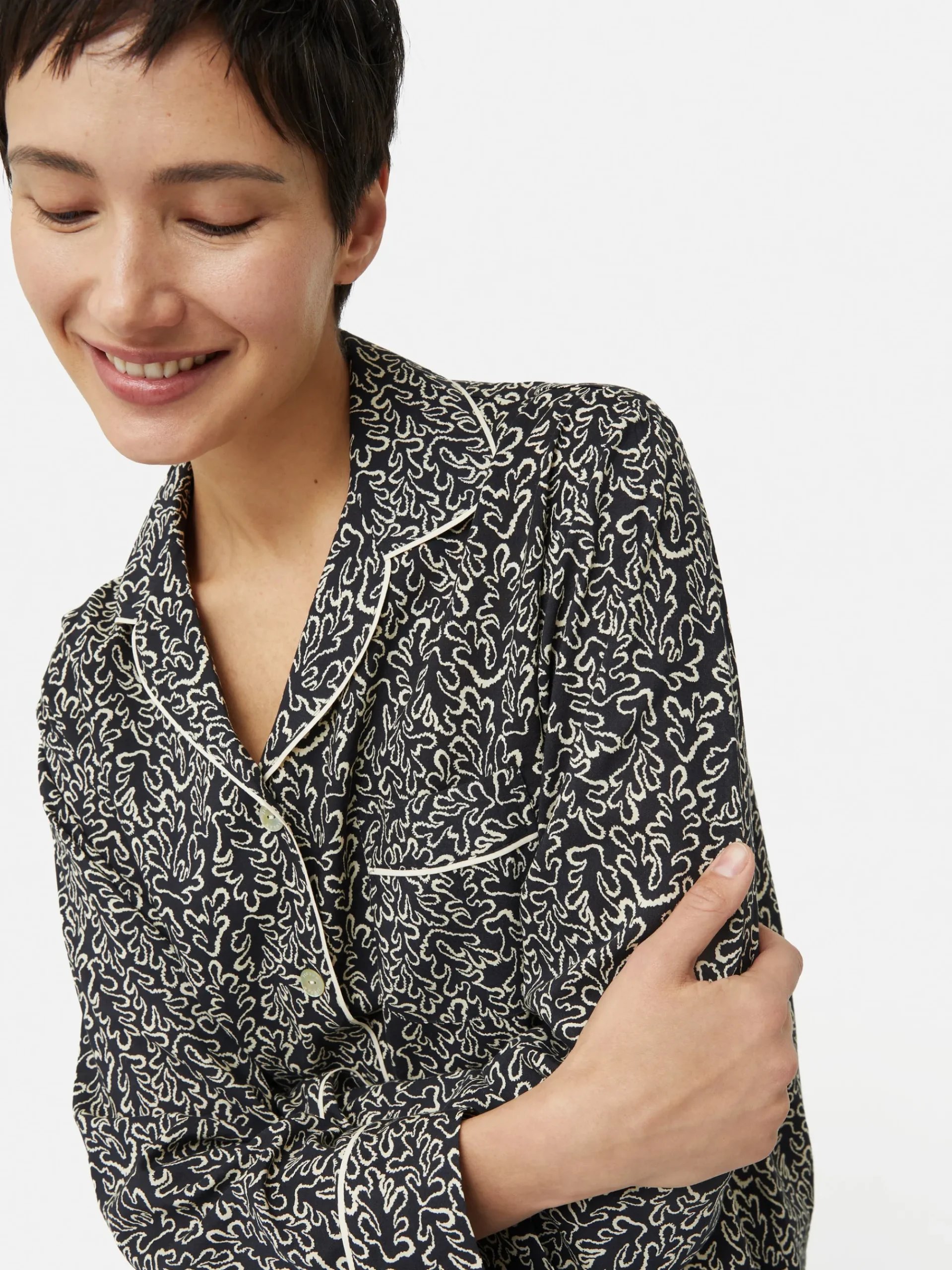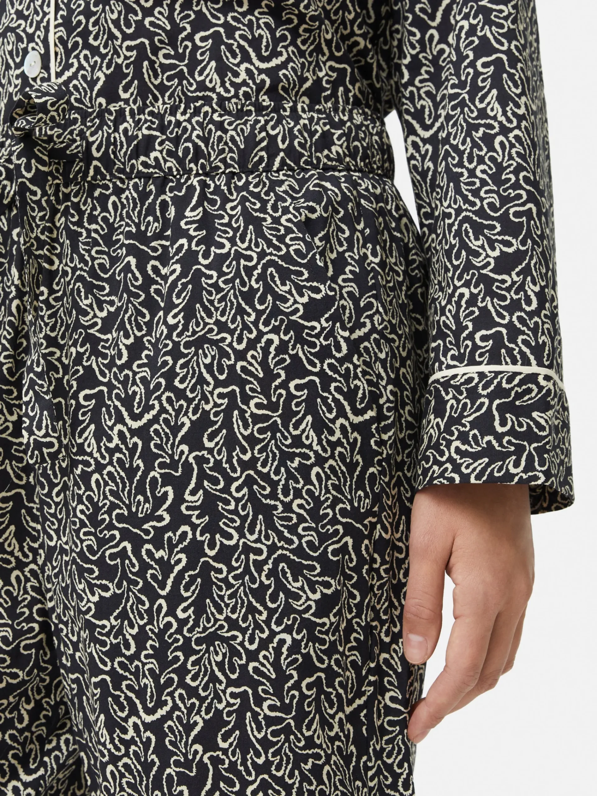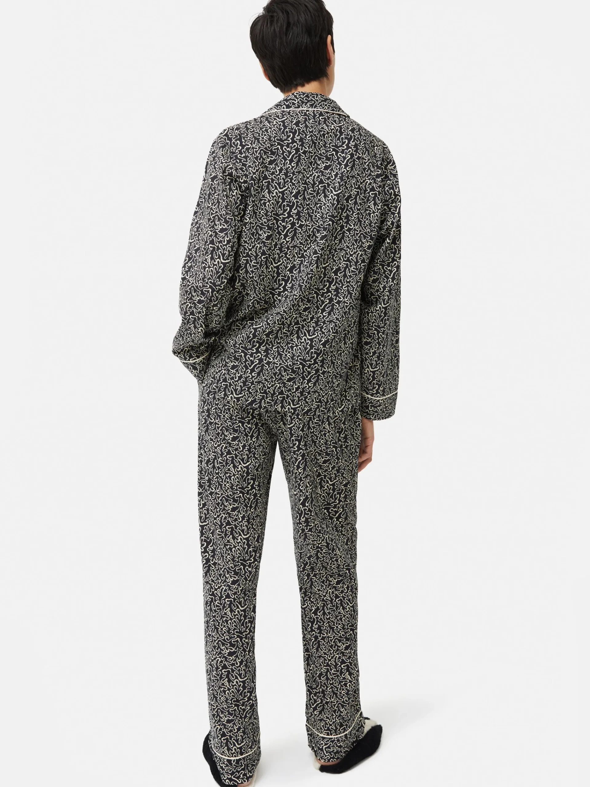 Our new Mini Hydra printed pyjama cut in supersoft modal is a perfect for gifting. Contrast piping and embossed mother of pearl buttons. A comfortable, relaxed fiting shirt style with single chest pocket and easy drawstring waisted bottoms with side pockets.