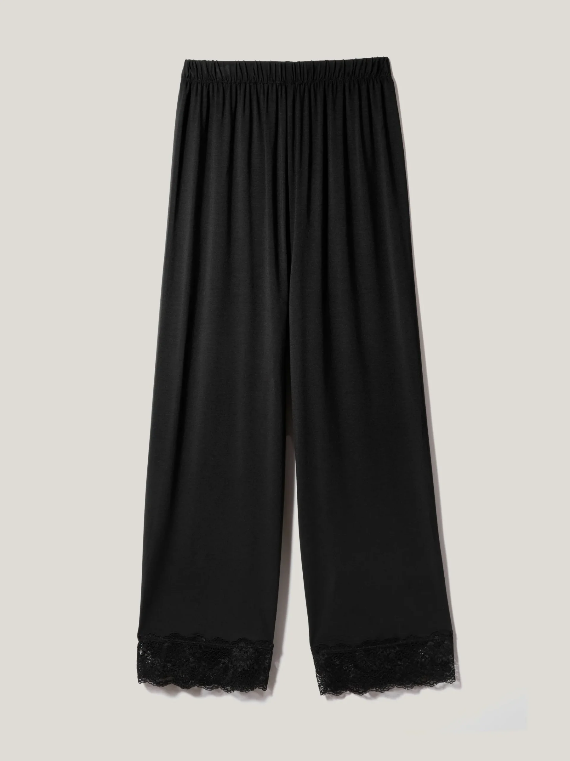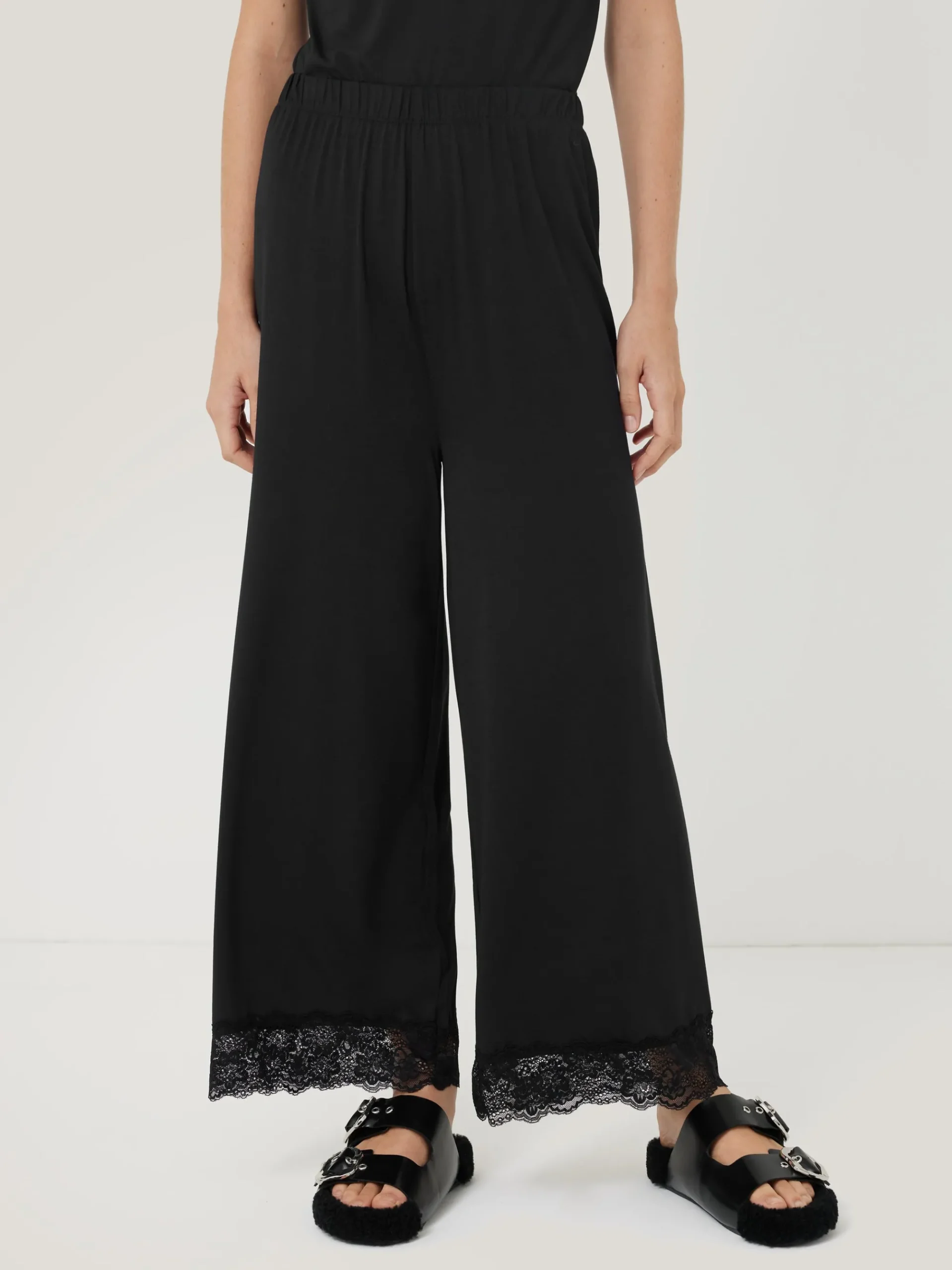 Downtime and beyond calls for these black wide leg trousers. The super-soft modal fabrication is detailed with an elasticated waistband for further comfort and elegant lace trim hems. Designed as part of a matching set.