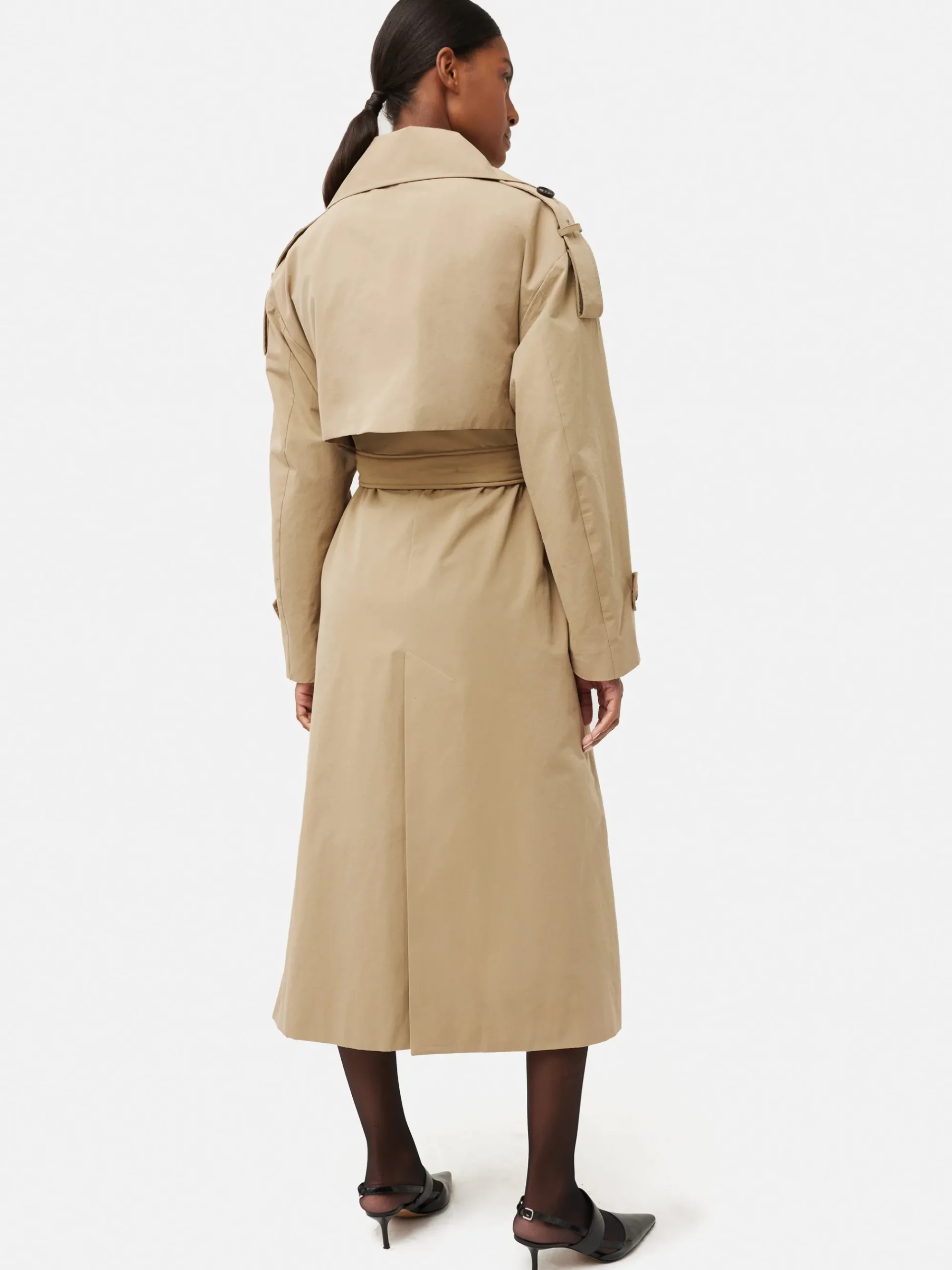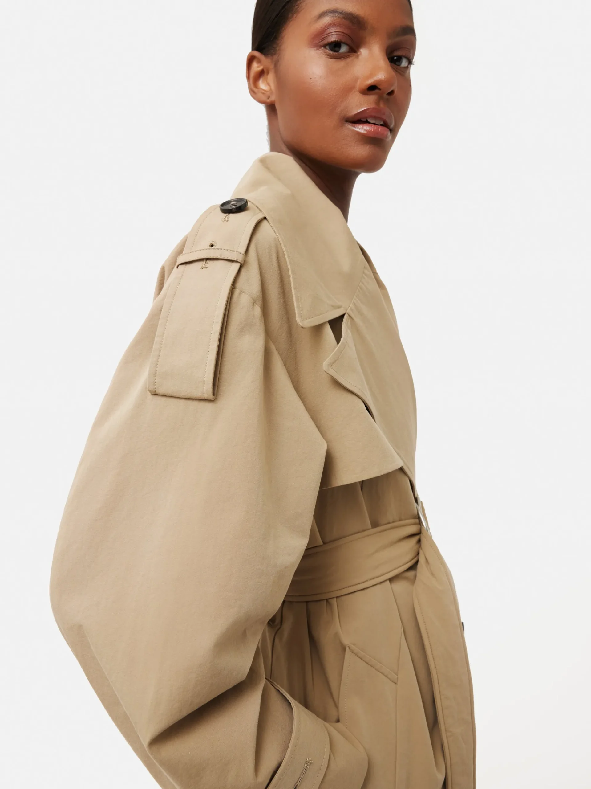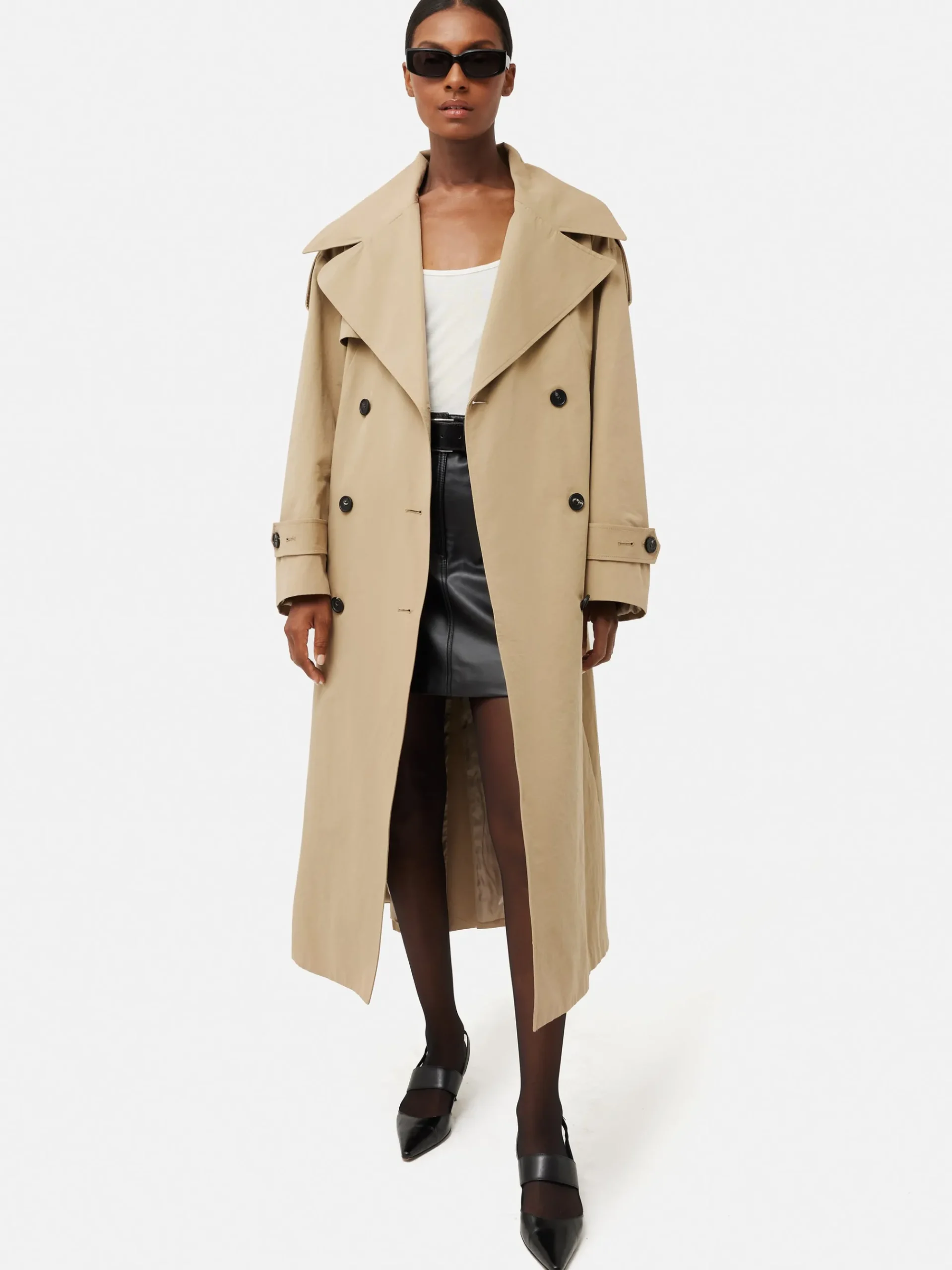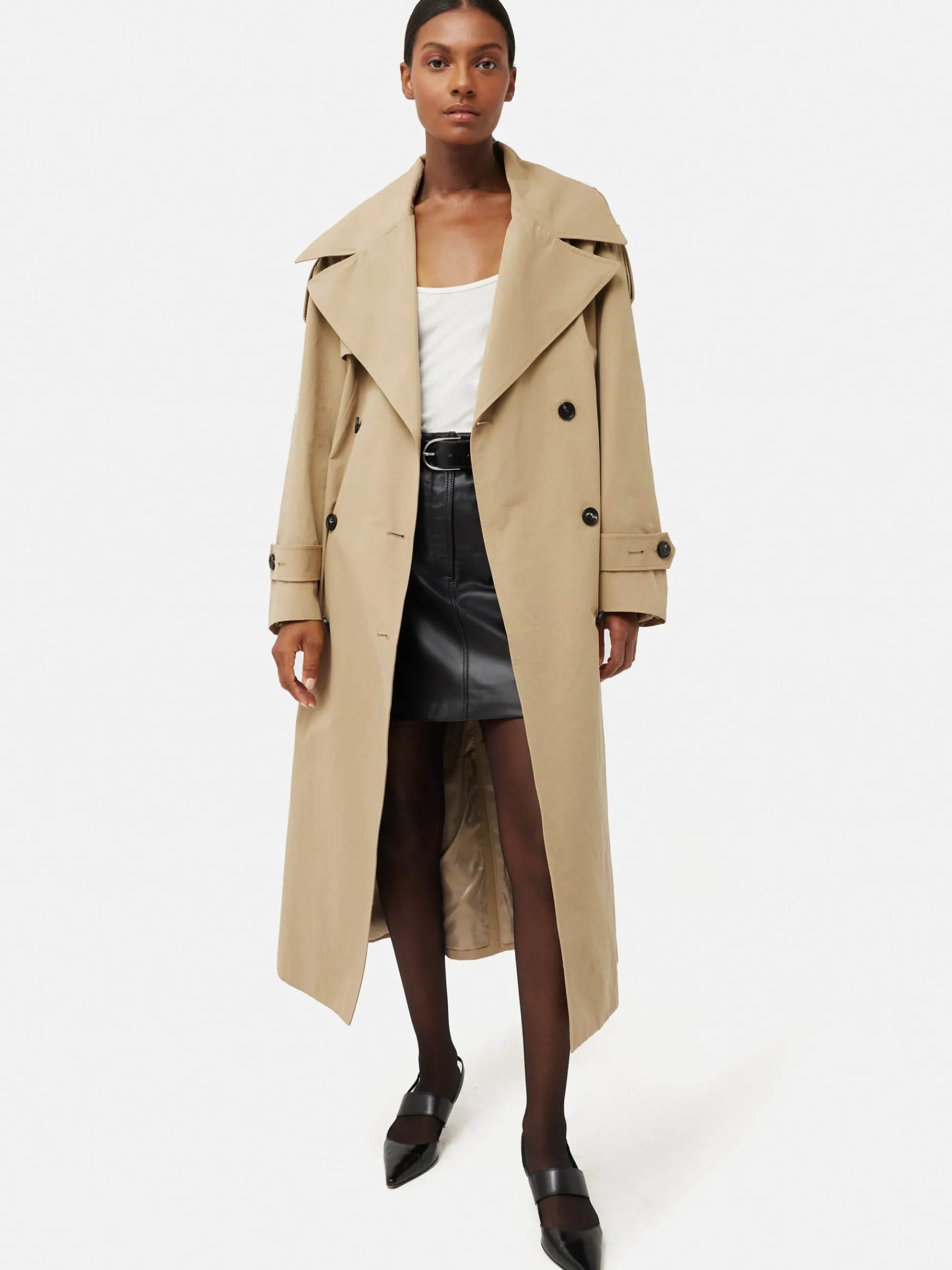 Patterned in house, our new season twist on a classic trench coat is cut in a textured pure cotton with a shower resistant finish. Oversized in shape, so size down one size from your normal for a neater fit. Modern dropped shoulders with adjustable buttoned epaulette detail. Large collar revere with front and back storm flaps, deep side pockets, a double breasted front fastening with contrast horn buttons and buttoned cuff straps. Single back vent and a self fabric belt with metal d-ring buckle allowing you to cinch in at the waist. Fully lined, internal contrast piping detail. Fit and Features