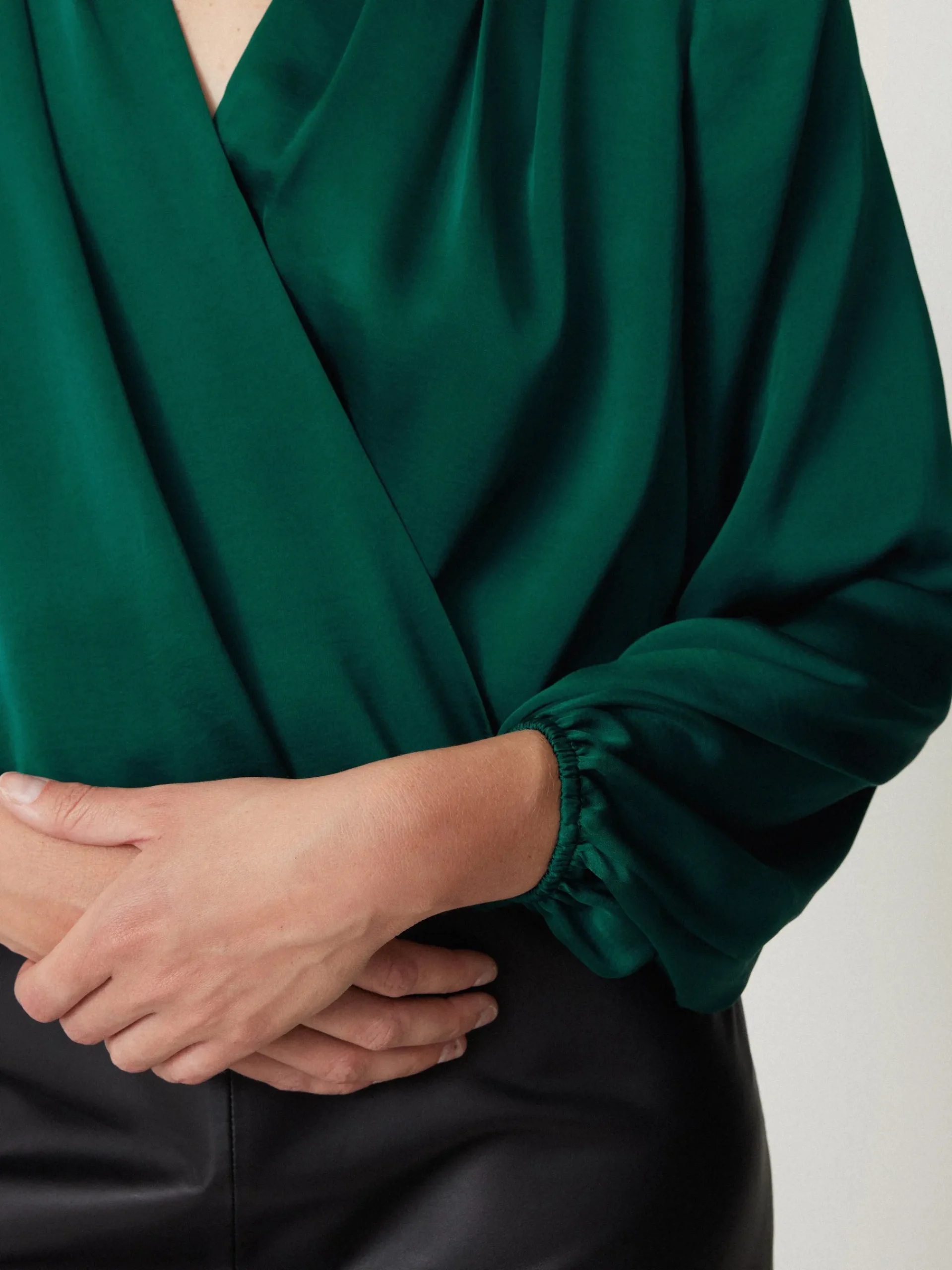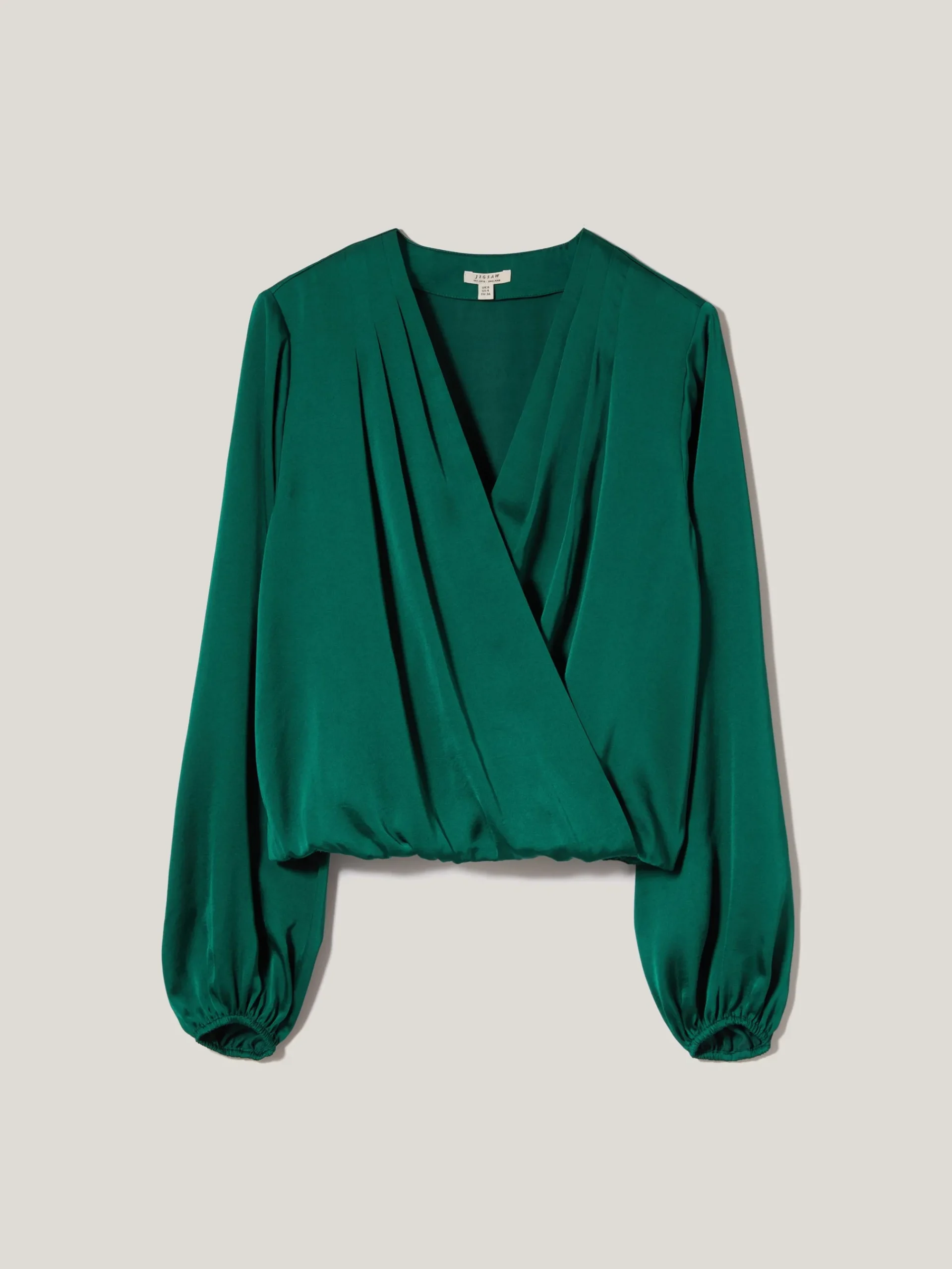 A new shape to bring to our satin drape collection, this wrap top is perfect for dressing up a pair of jeans or as an evening alternative with tailored trousers. Choose from two bespoke Jigsaw shades; Cinema Red and Sherwood Green.