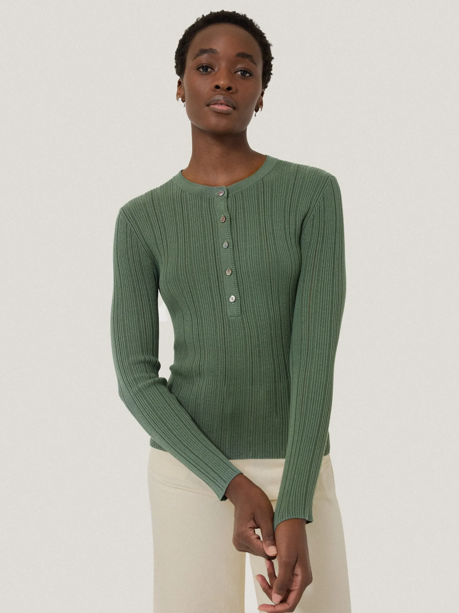 This classic Henley top is a layering piece you will reach for again and again. Updated in a pointelle knit jersey for softness with elegant Mother of Pearl button fastenings, we love its endless versatility both under a knit or worn alone with denim.