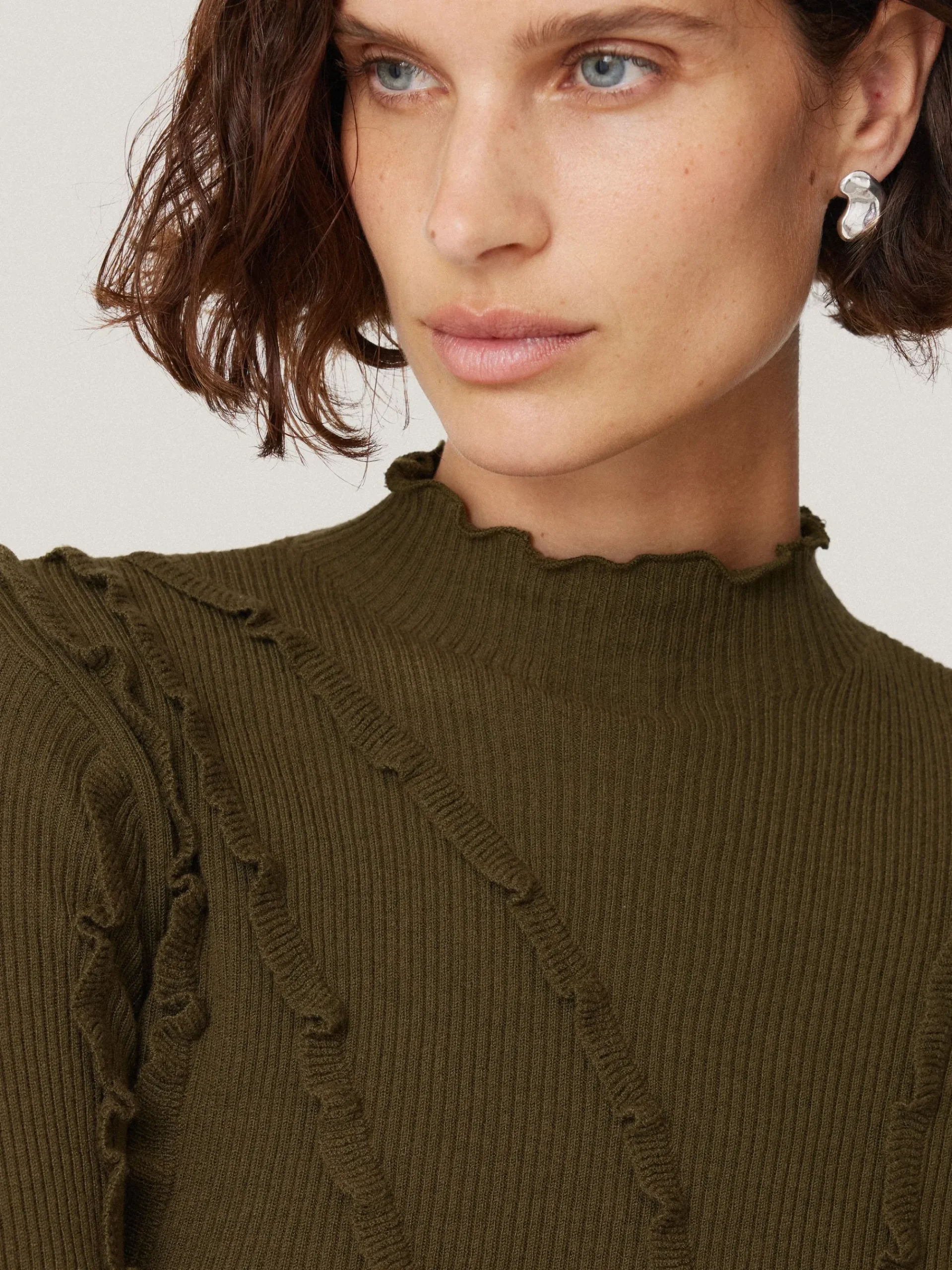 A form-fitting jumper that effortlessly tucks into high-waisted trousers, perfecting that sought-after silhouette. The addition of feminine ruffles introduces a captivating 3D element, meticulously hand-placed for an intricately detailed knitwear piece.