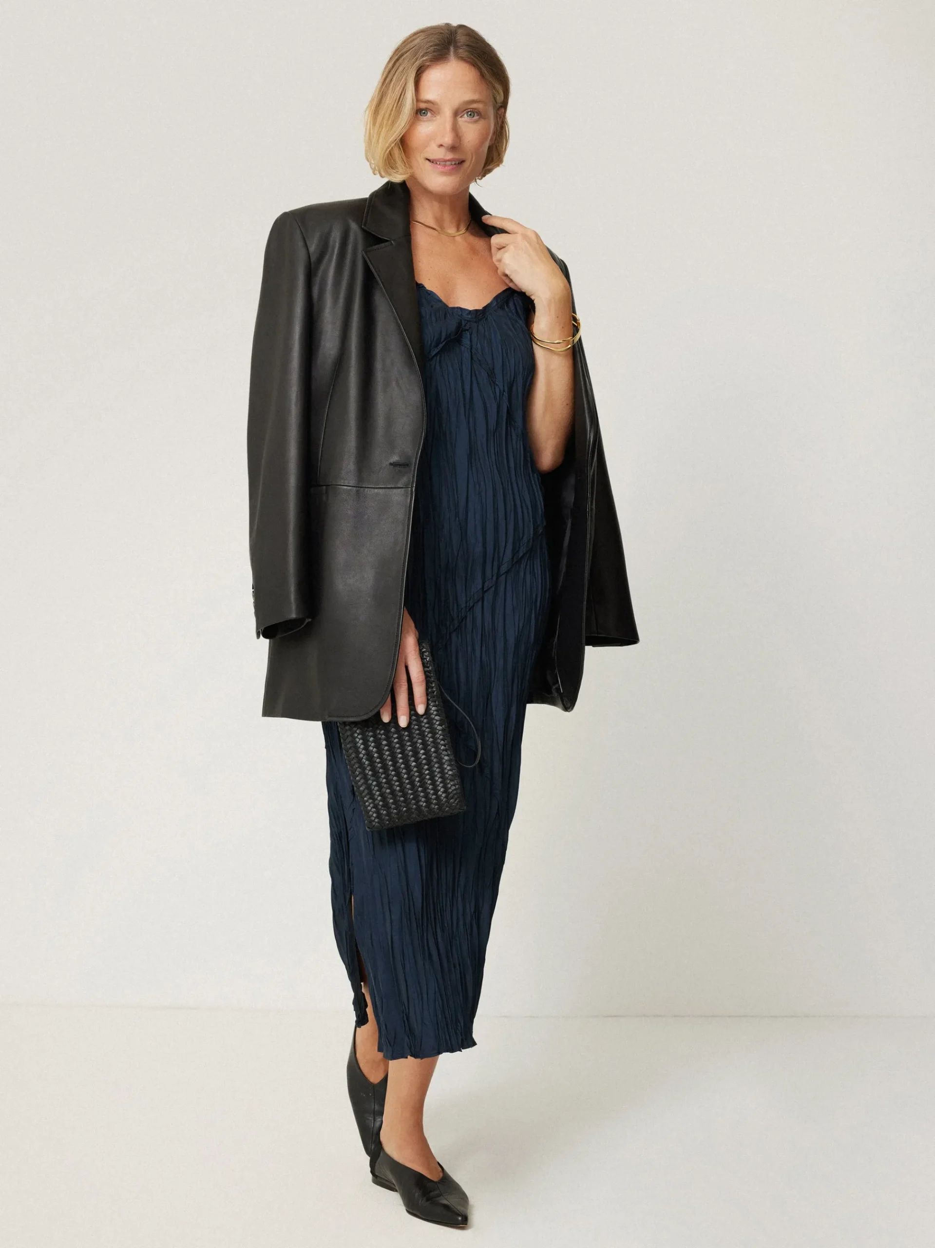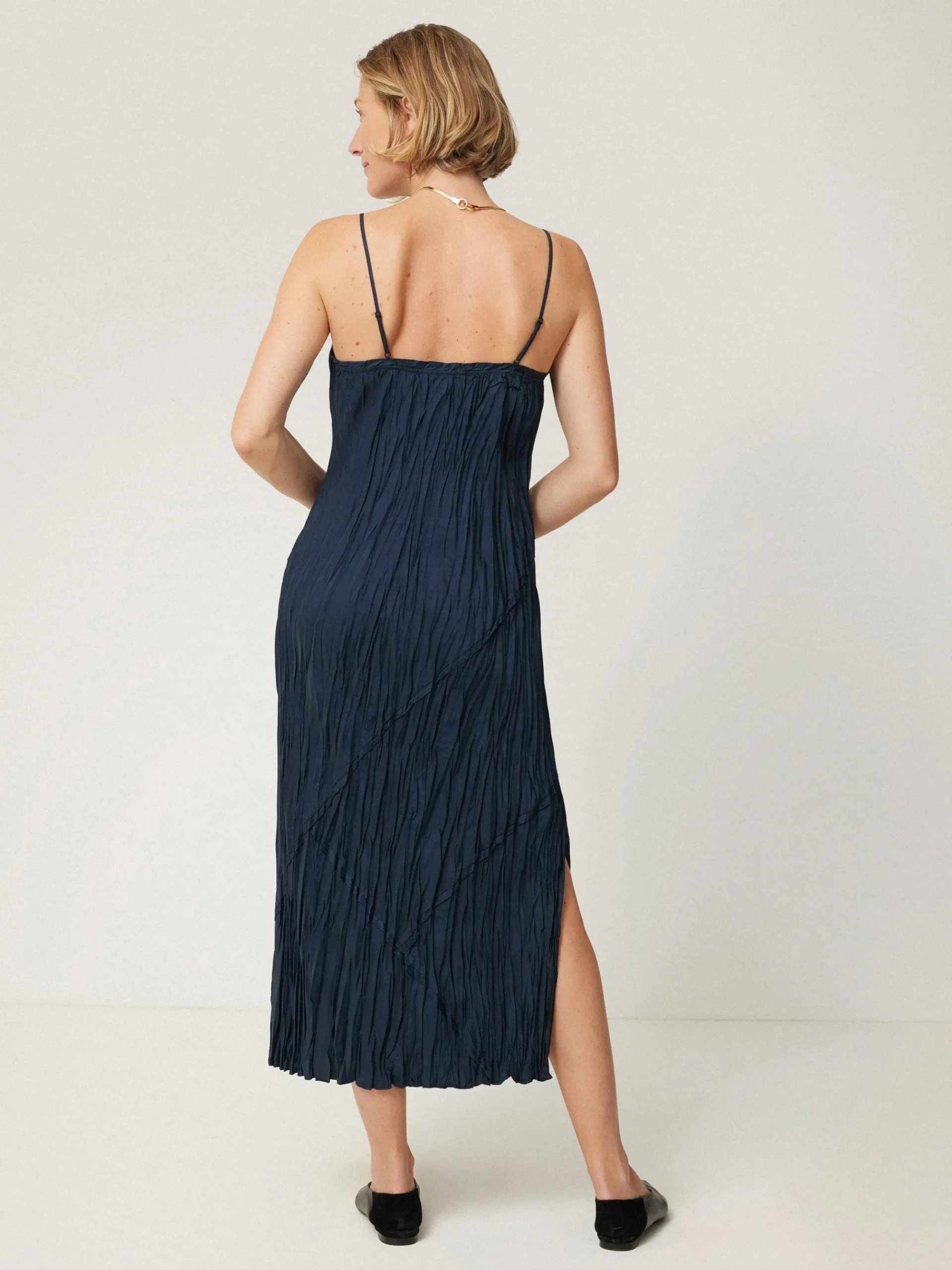 The 90s-style slip dress is reimagined with this lustrous blue design, using a crinkle plisse fabric and pleated seam detail for a tactile spin. The bias cut makes it ideal for wearing alone or underneath a blouse or knit when the weather cools.