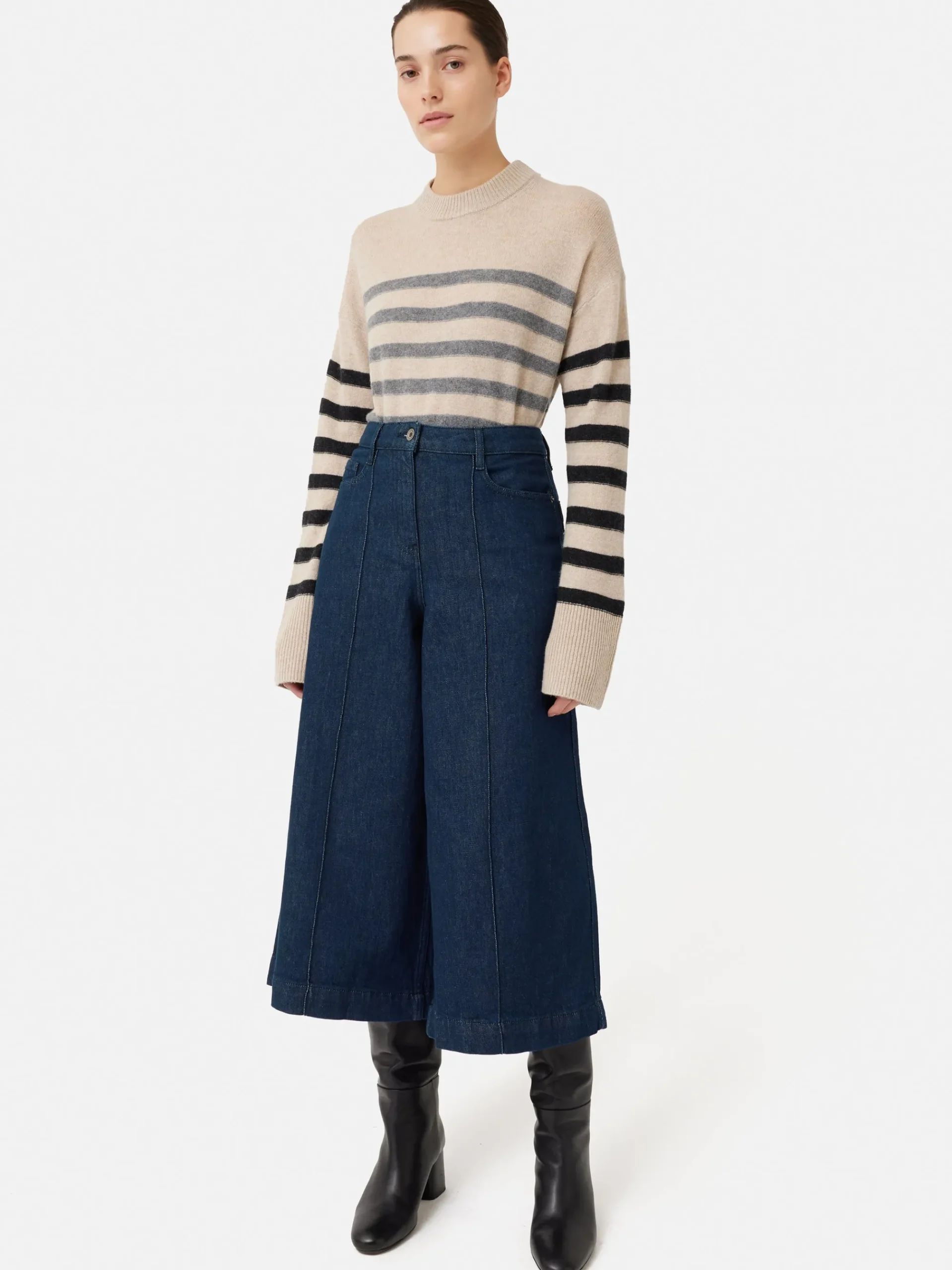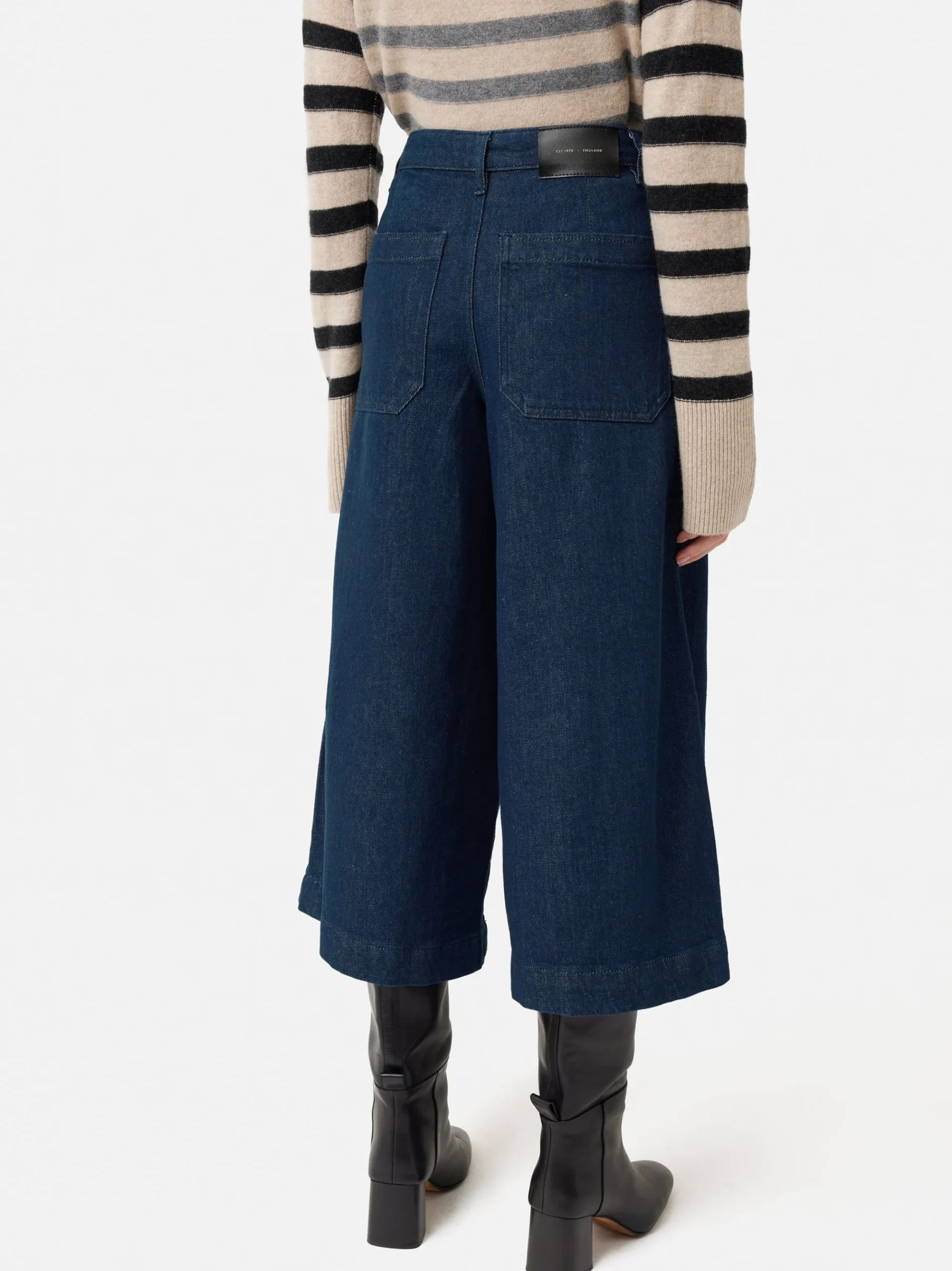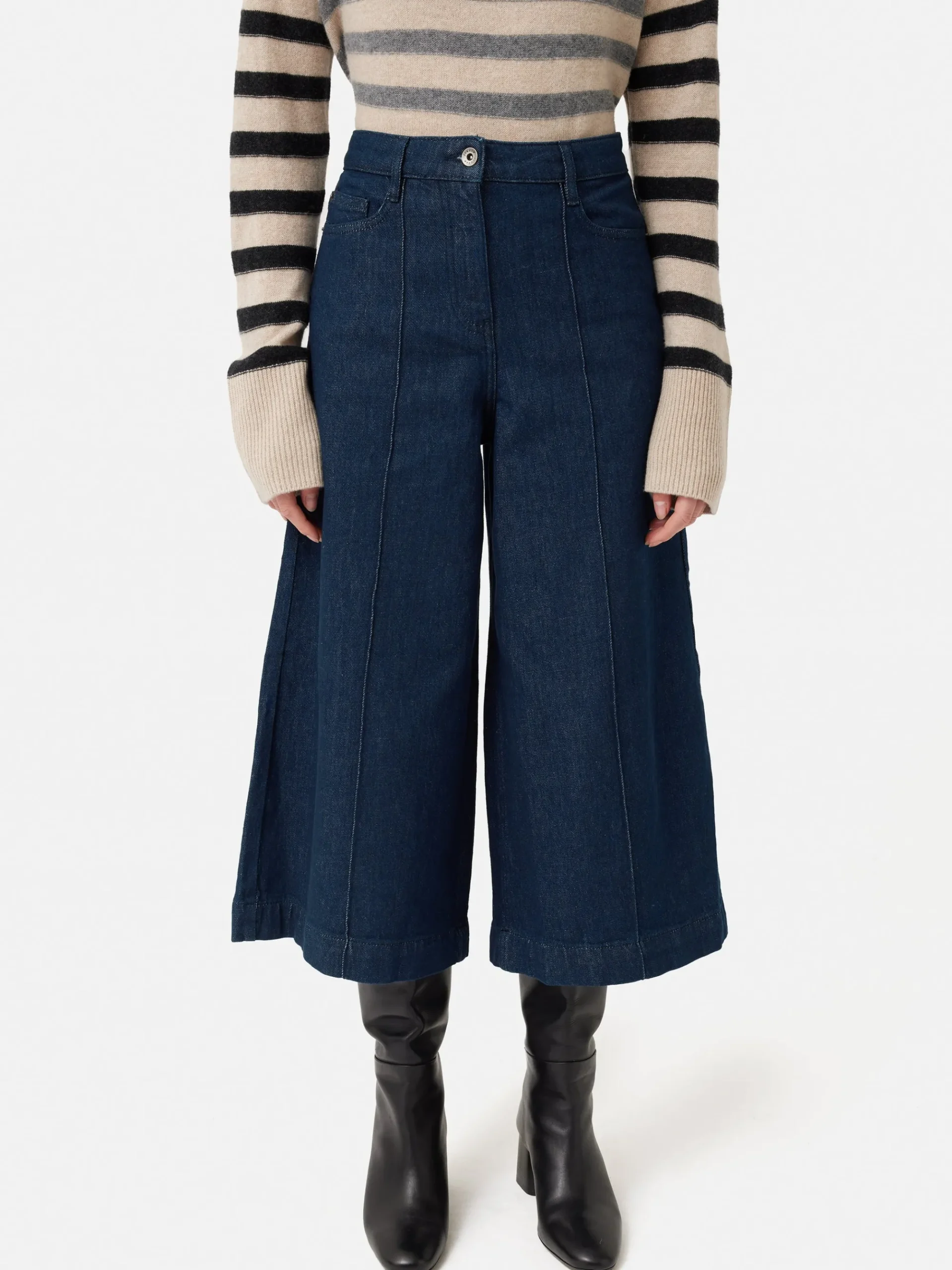 The wide cropped culotte is the newest addition to our denim collection. High waisted and cut in indigo cotton denim, with a hint of stretch. Features a fixed seam down the front, complemented by contrast topstitching, to add modernity to the silhouette. Style with a pair of long boots to accentuate the contemporary cropped leg. Fit and Features