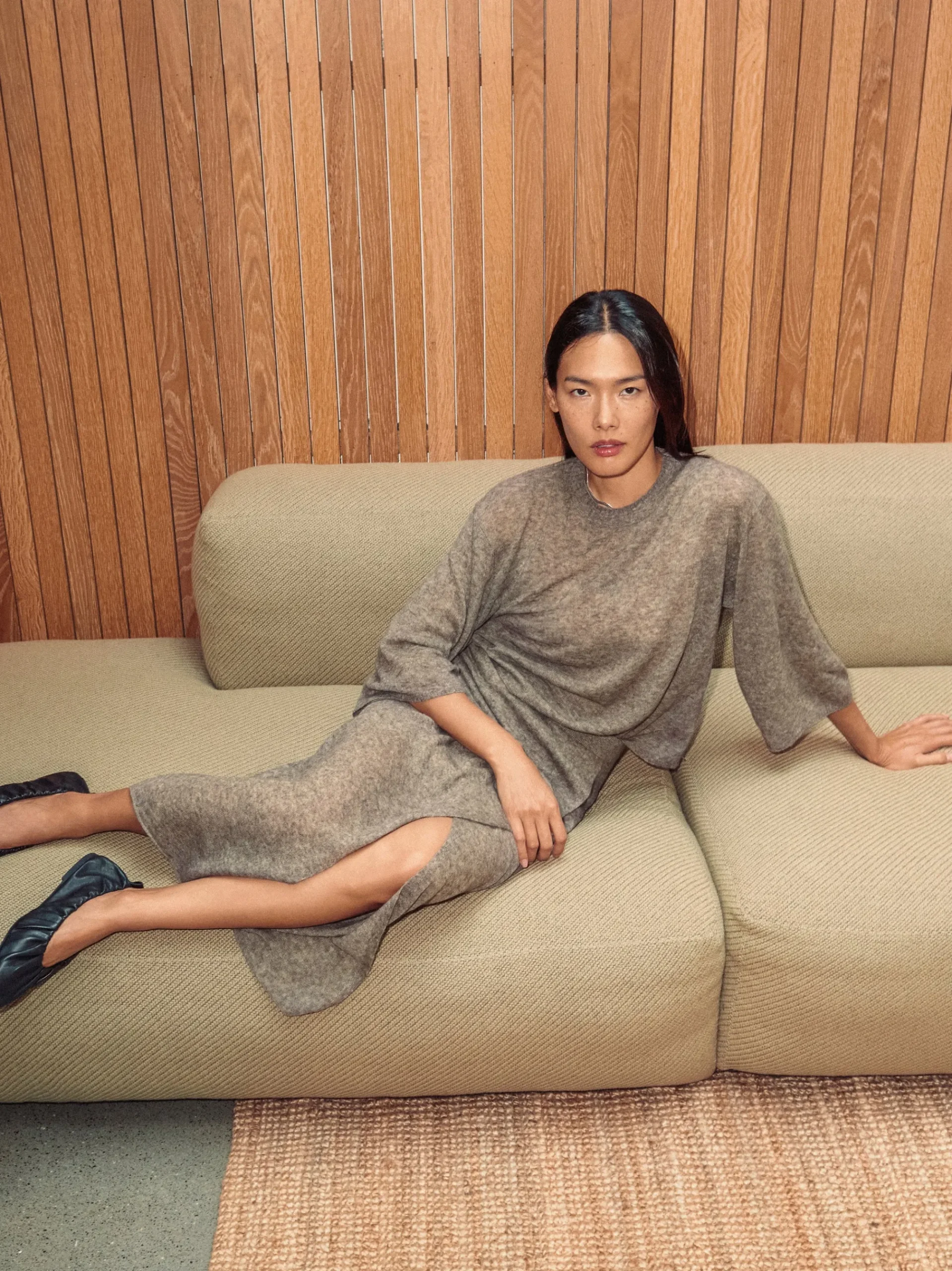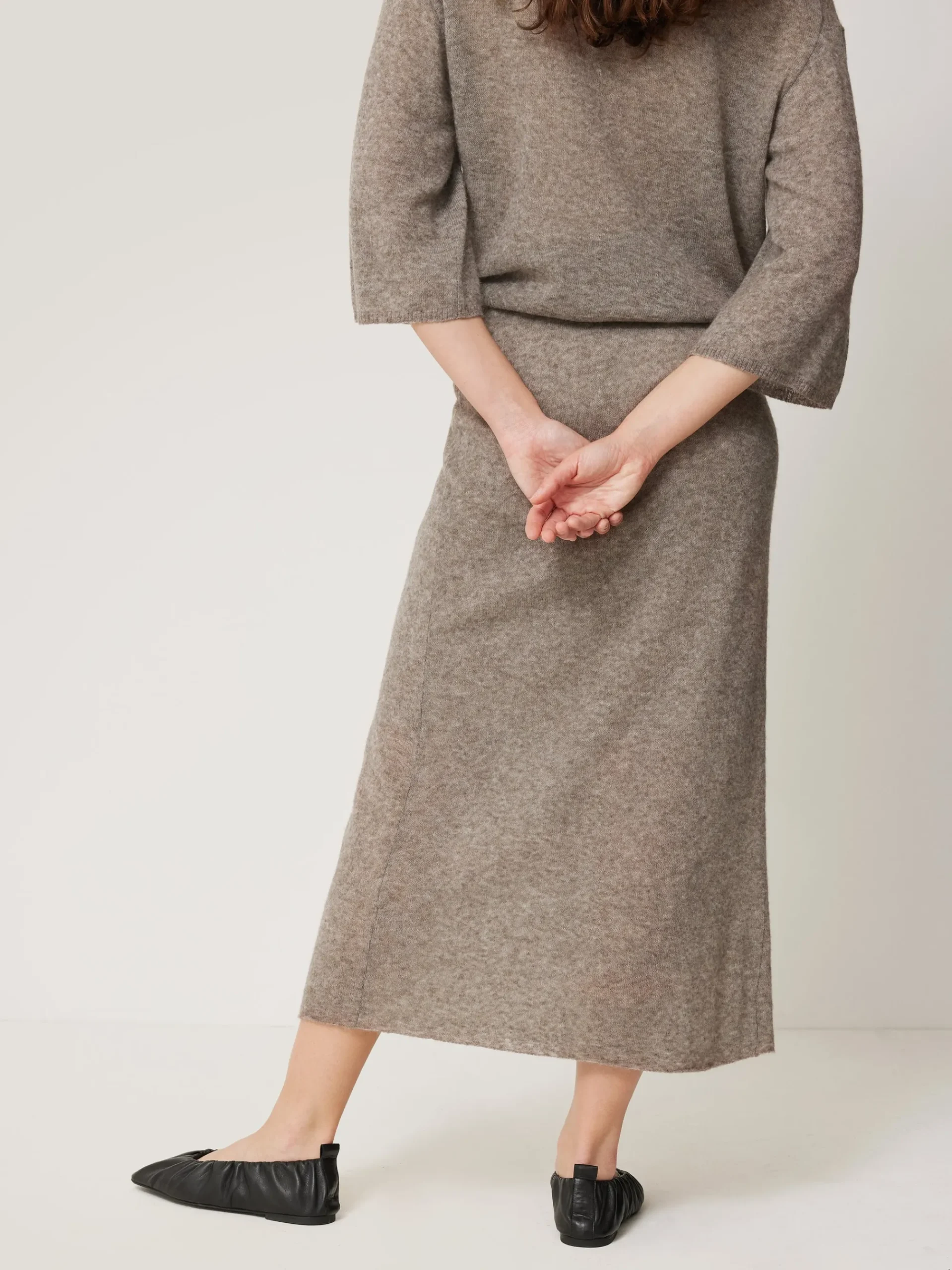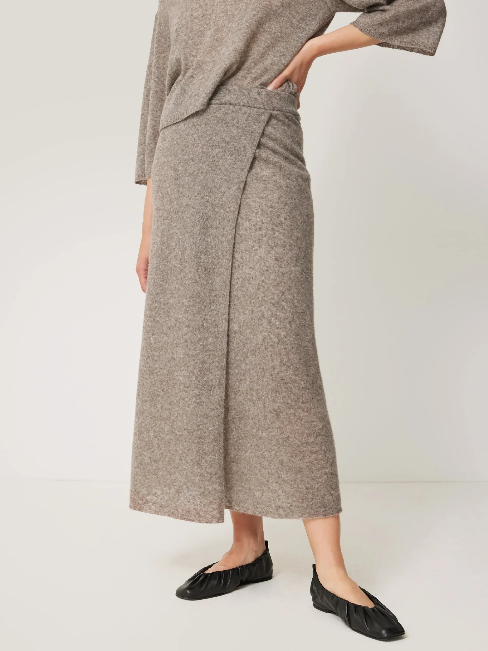 This midi skirt elevates downtime at home and beyond in a sheer gauze knit, which has been infused with ultra-soft alpaca yarns. The slim fit and fixed wrap front creates a flattering look. Forming part of a skirt and scarf in the same fabrication, wear all three pieces for a cosy head-to-toe look.