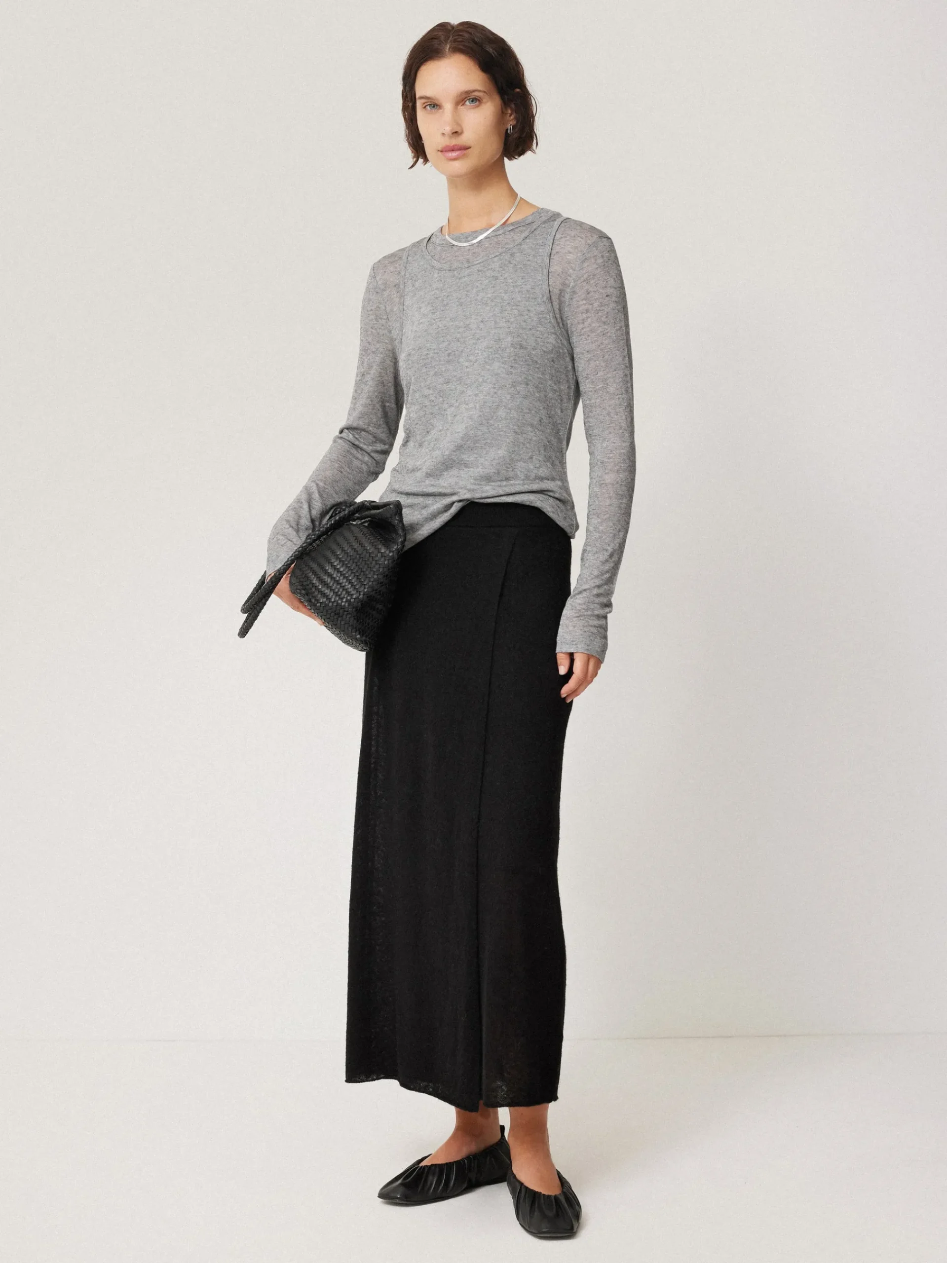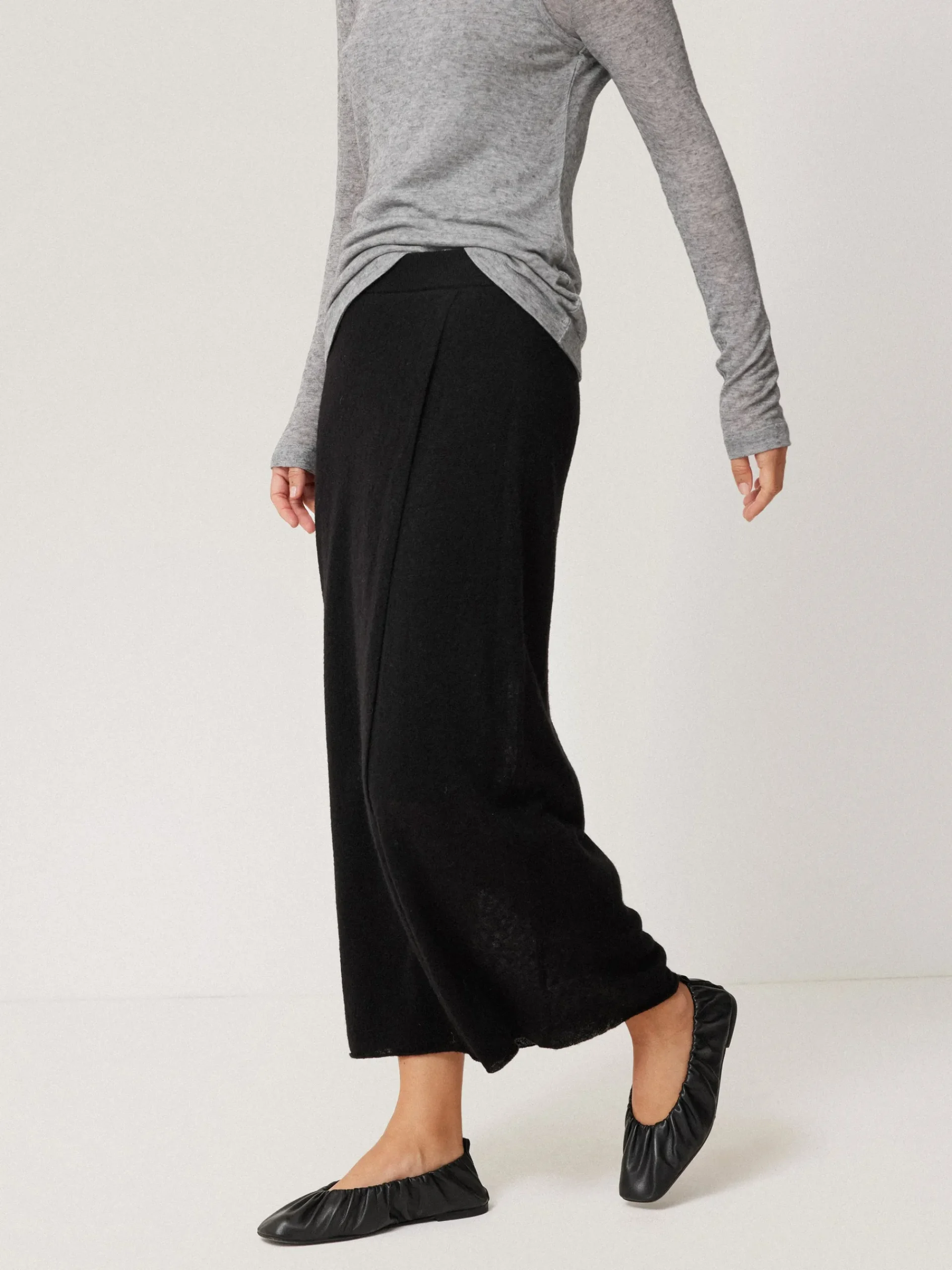 This midi skirt elevates downtime at home and beyond in a sheer gauze knit, which has been infused with ultra-soft alpaca yarns. The slim fit and fixed wrap front creates a flattering look. Forming part of a skirt and scarf in the same fabrication, wear all three pieces for a cosy head-to-toe look.