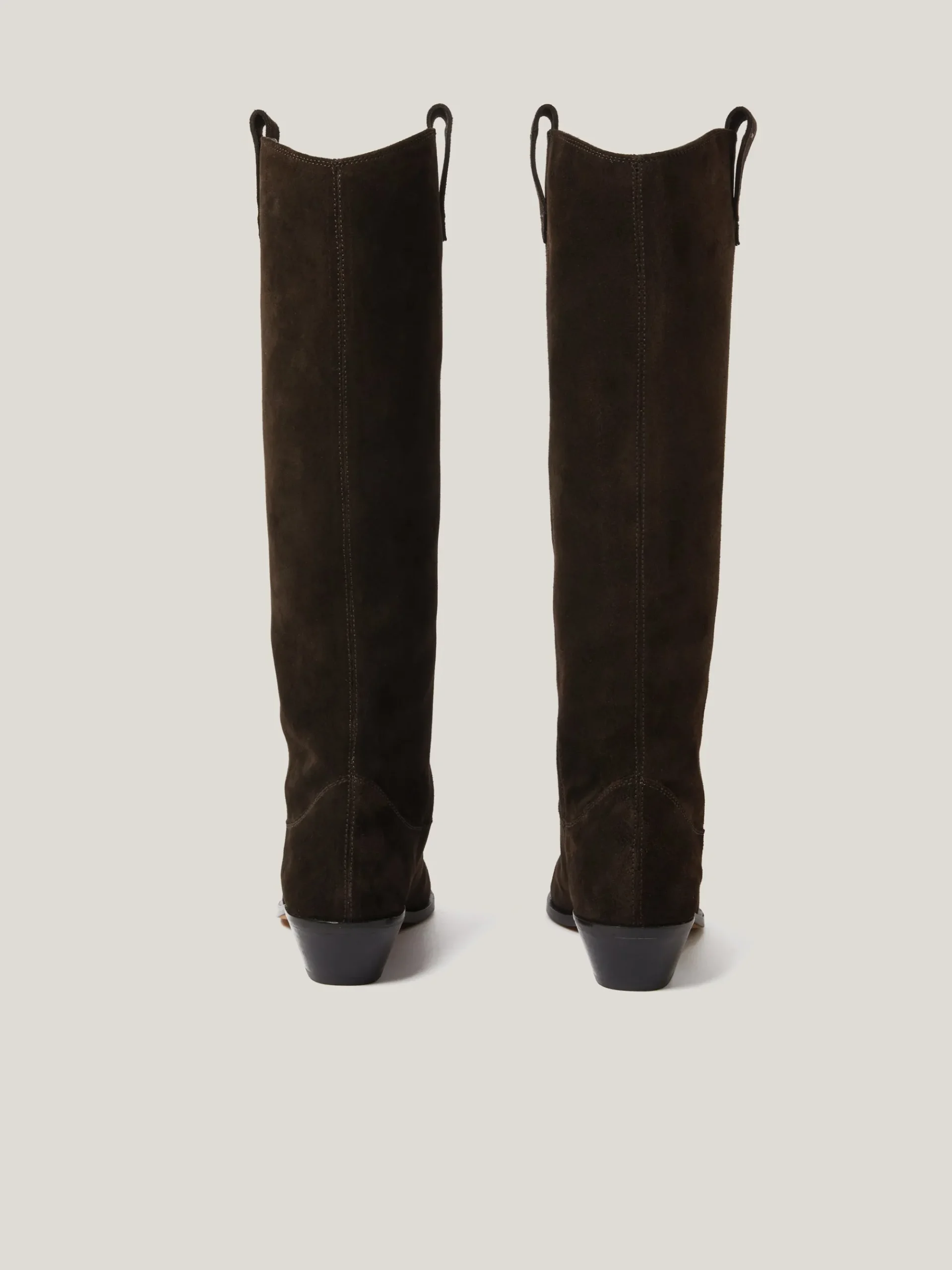 Sumptuous suede meets a classic Western aesthetic with these suede knee high boots. Designed for a pointed toe and side pull tabs for ease slipping on and off, this pair are ready for walking tall with all your midi dresses and jeans.