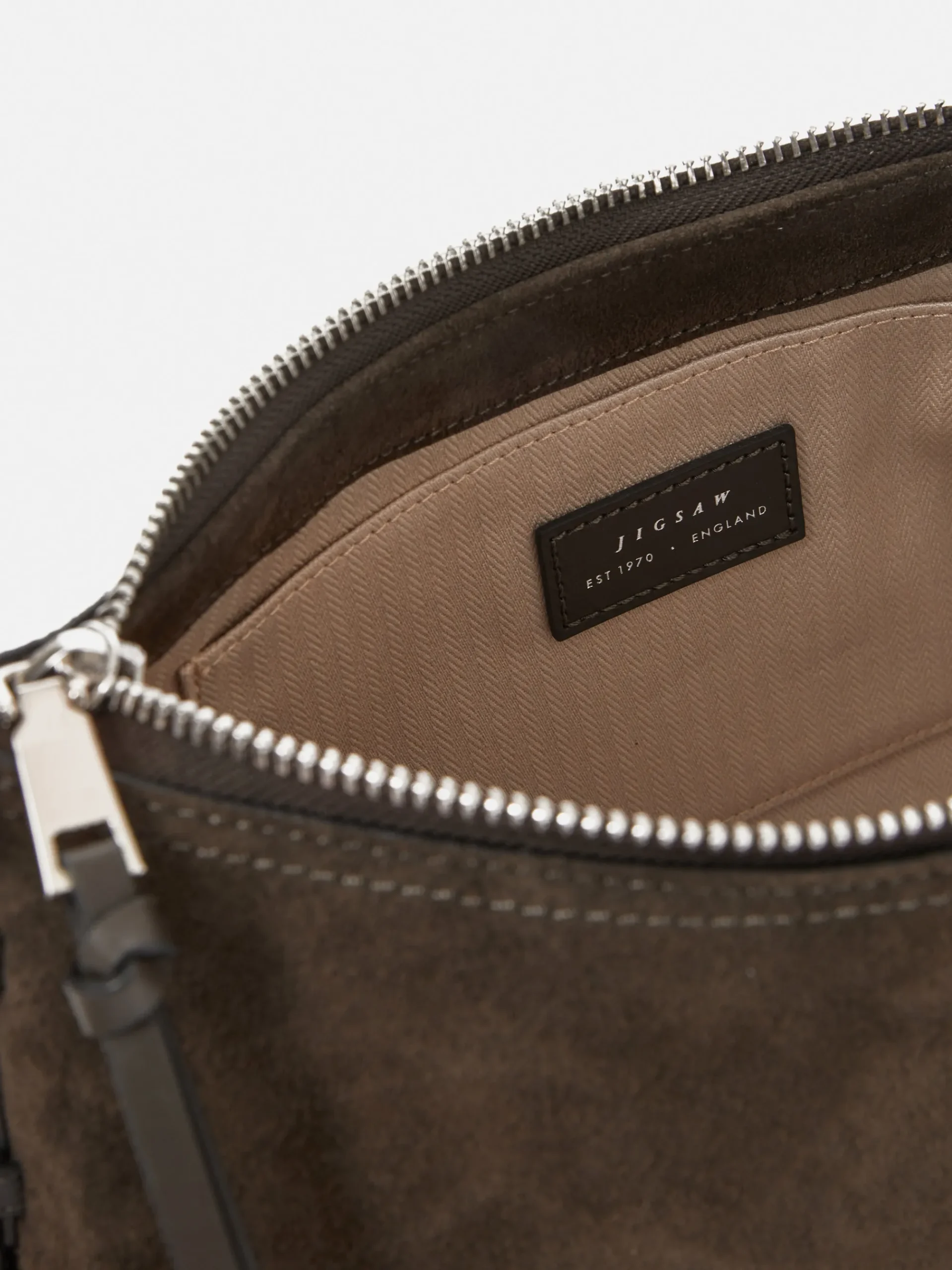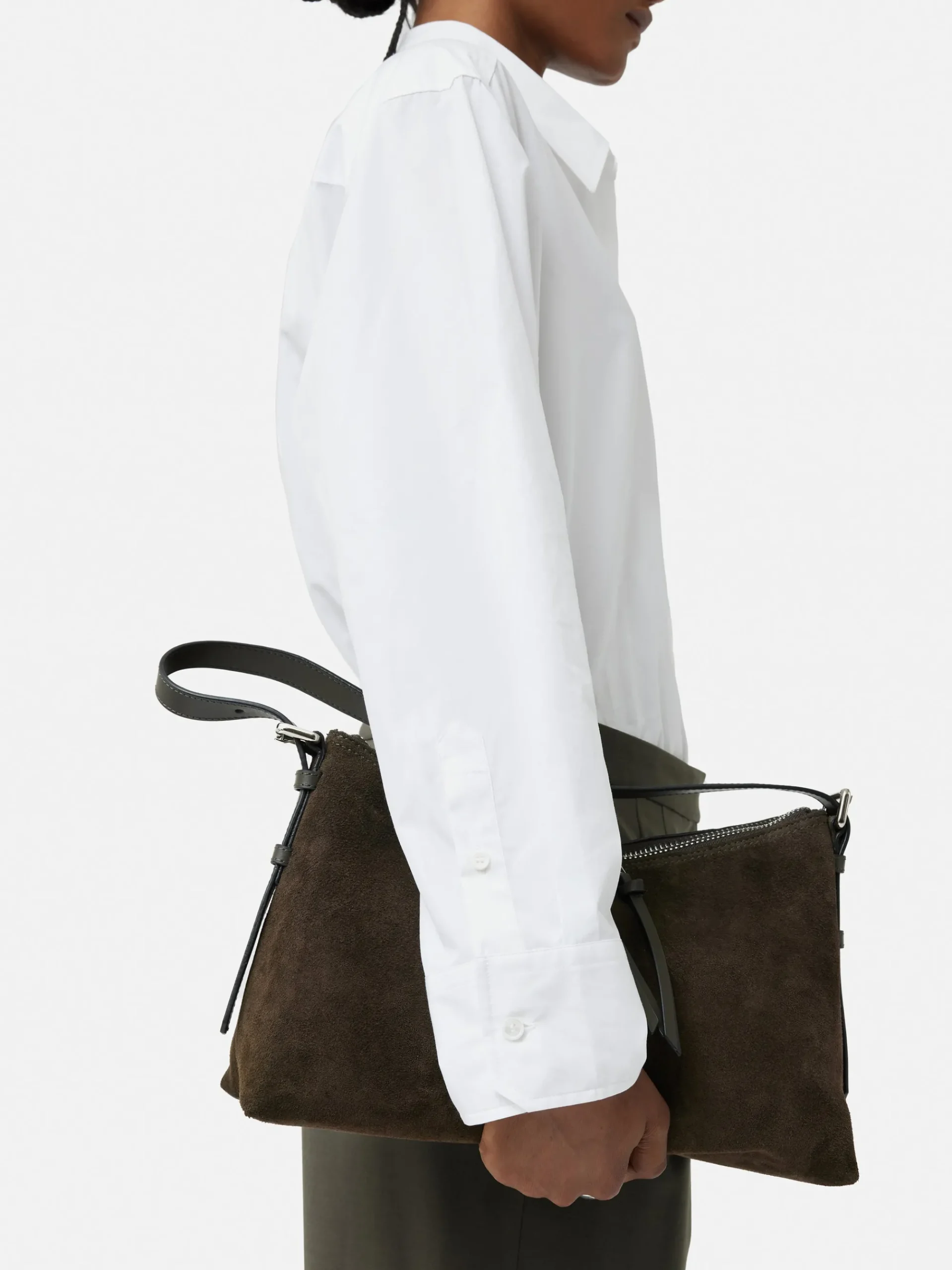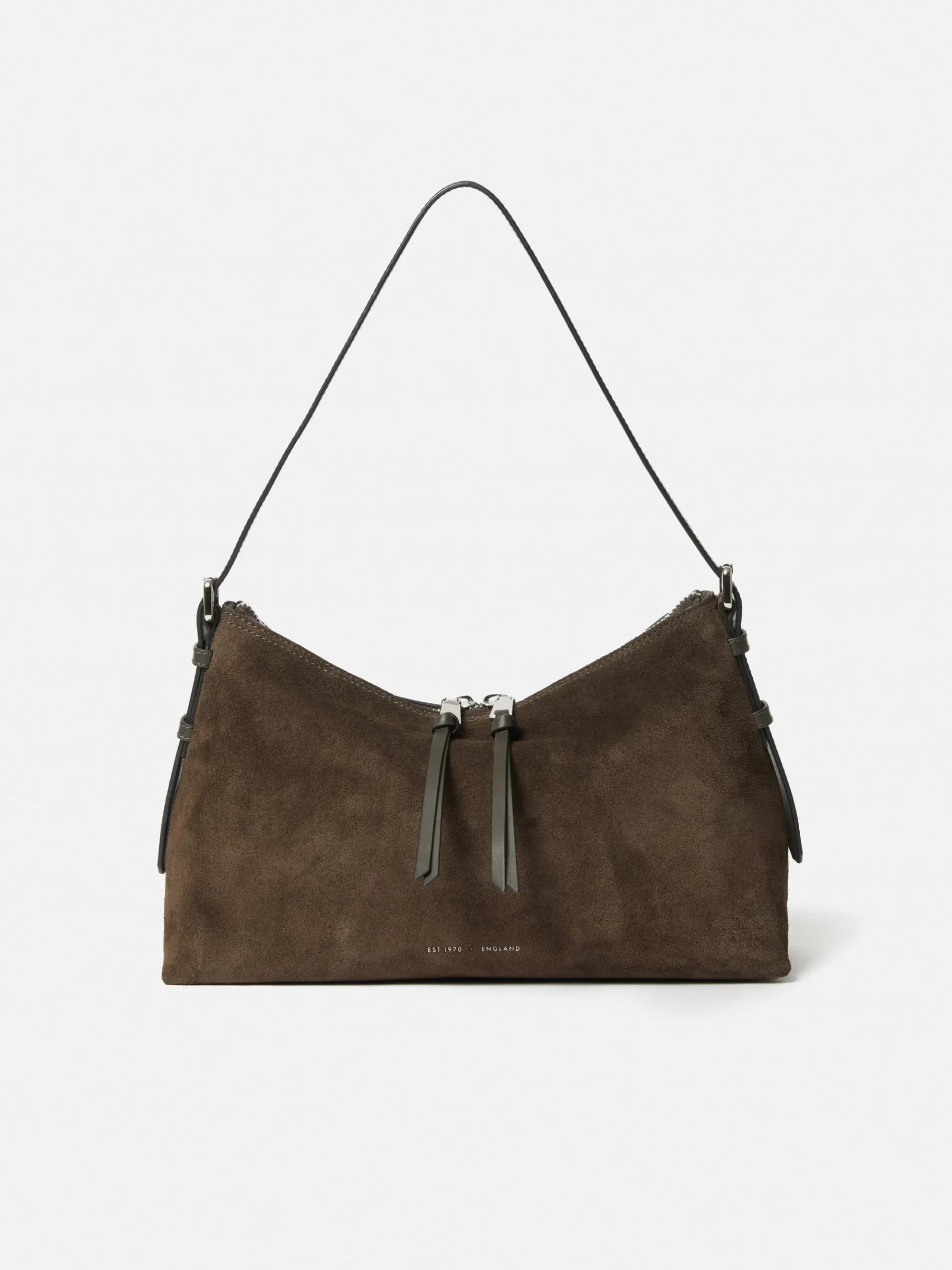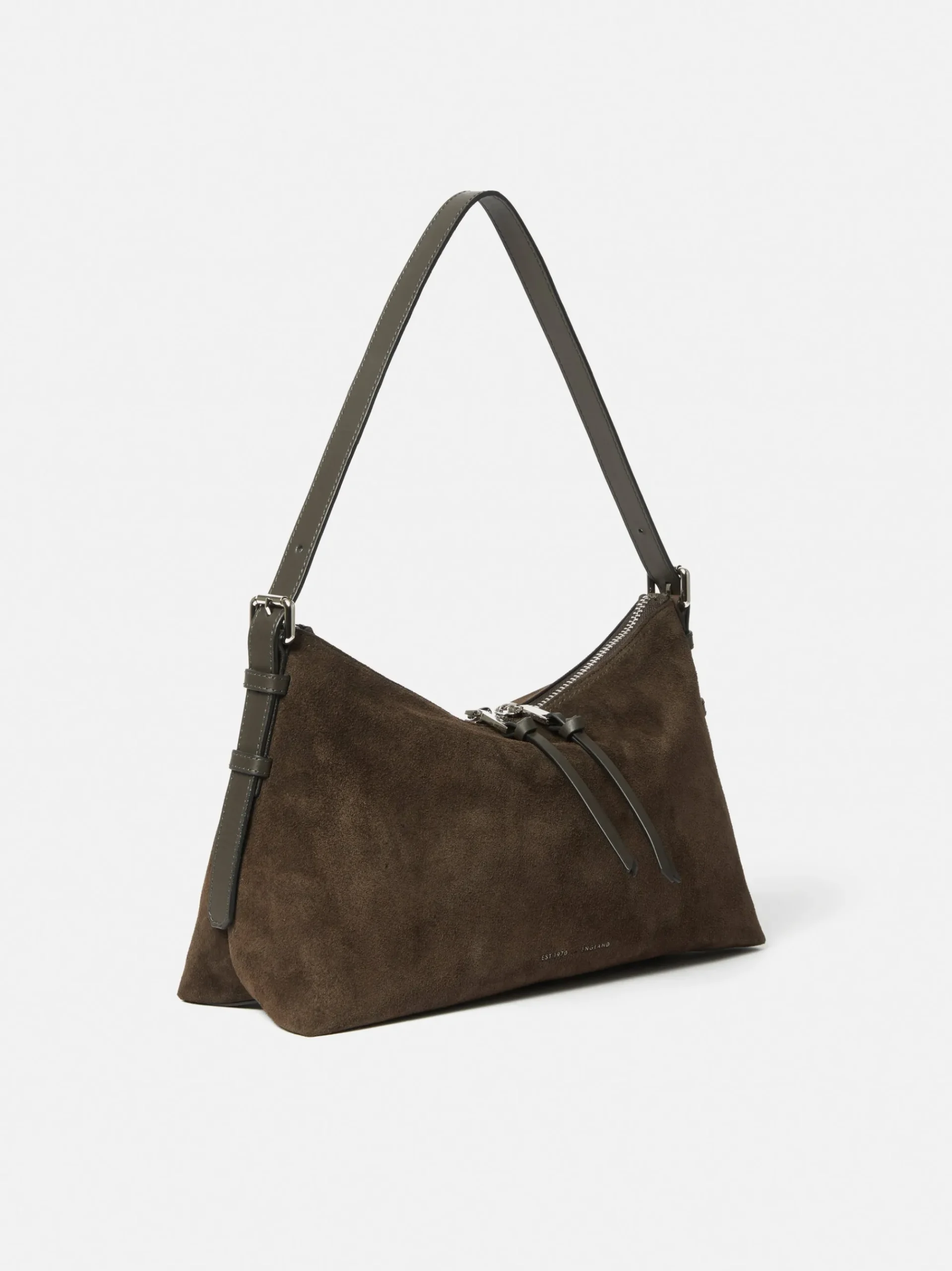 The sister to the larger Trafalgar bag, this smaller size has a nod to the 90s and remains incredibly functional with an adjustable shoulder strap, zip closure and internal slip pocket. Crafted in a rich khaki suede and trimmed with smooth semi veg leather for added texture and finished with silver hardware. Fit and Features