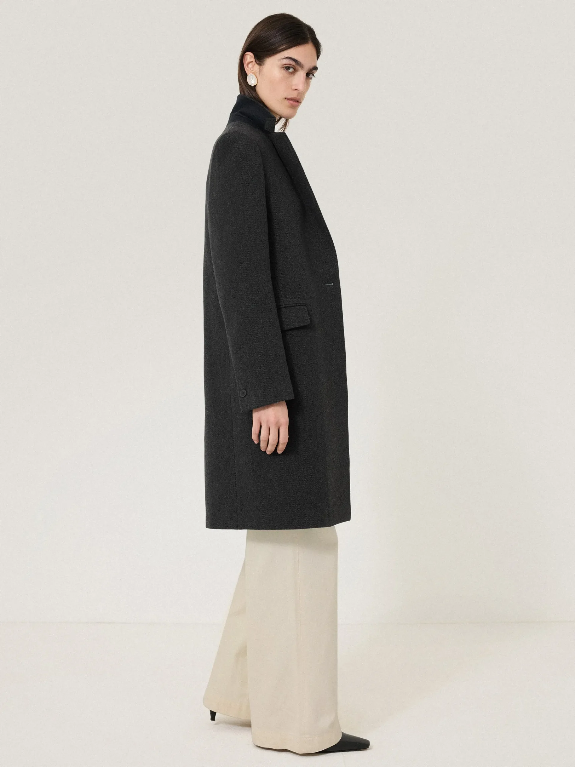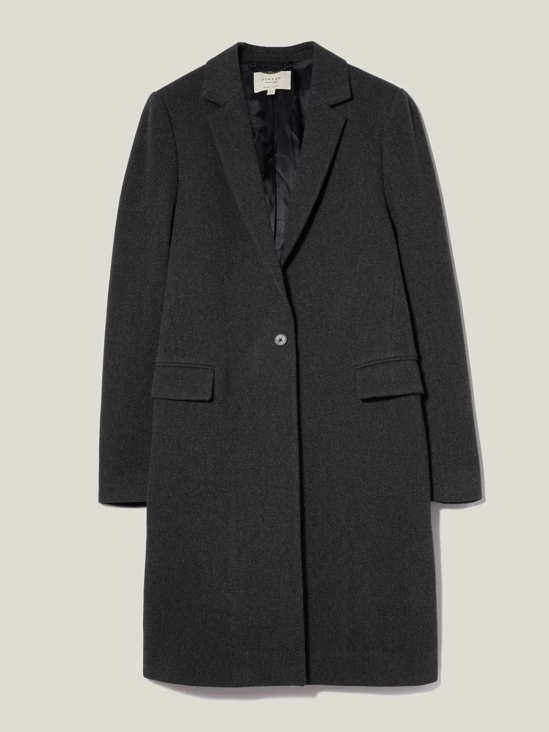 Patterned in-house and crafted from a lustrous, pure brushed wool, the city coat is designed with a softer shoulder for a more relaxed fit. The single-breasted front is accented with a button closure, a melton under collar and jet flap pockets. A winter staple that styles perfectly over denim or tailoring.