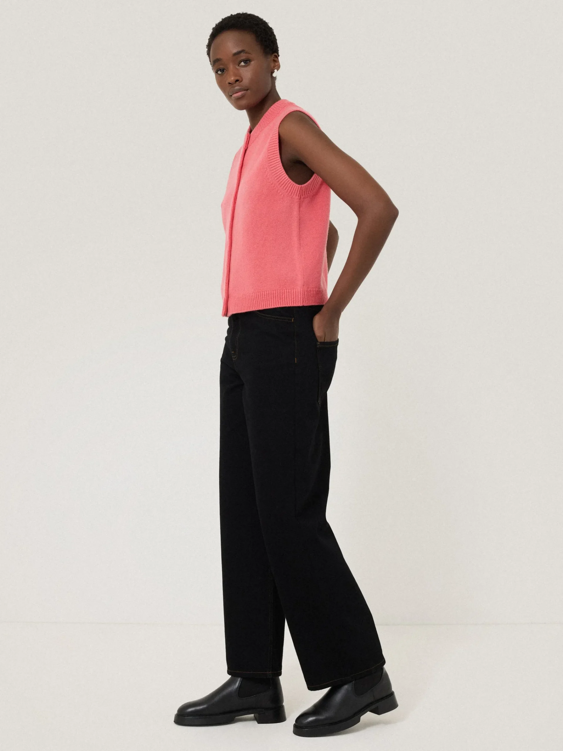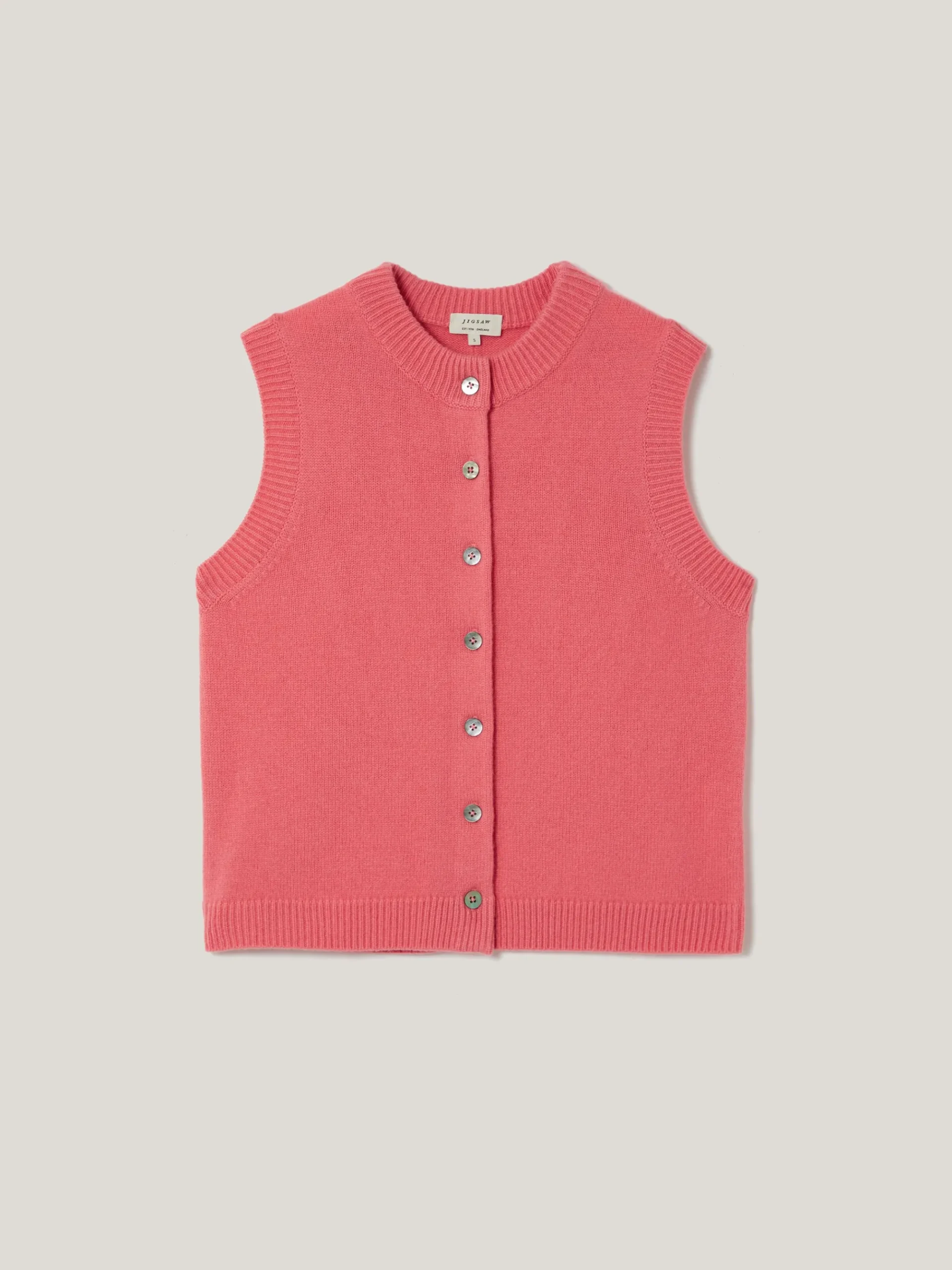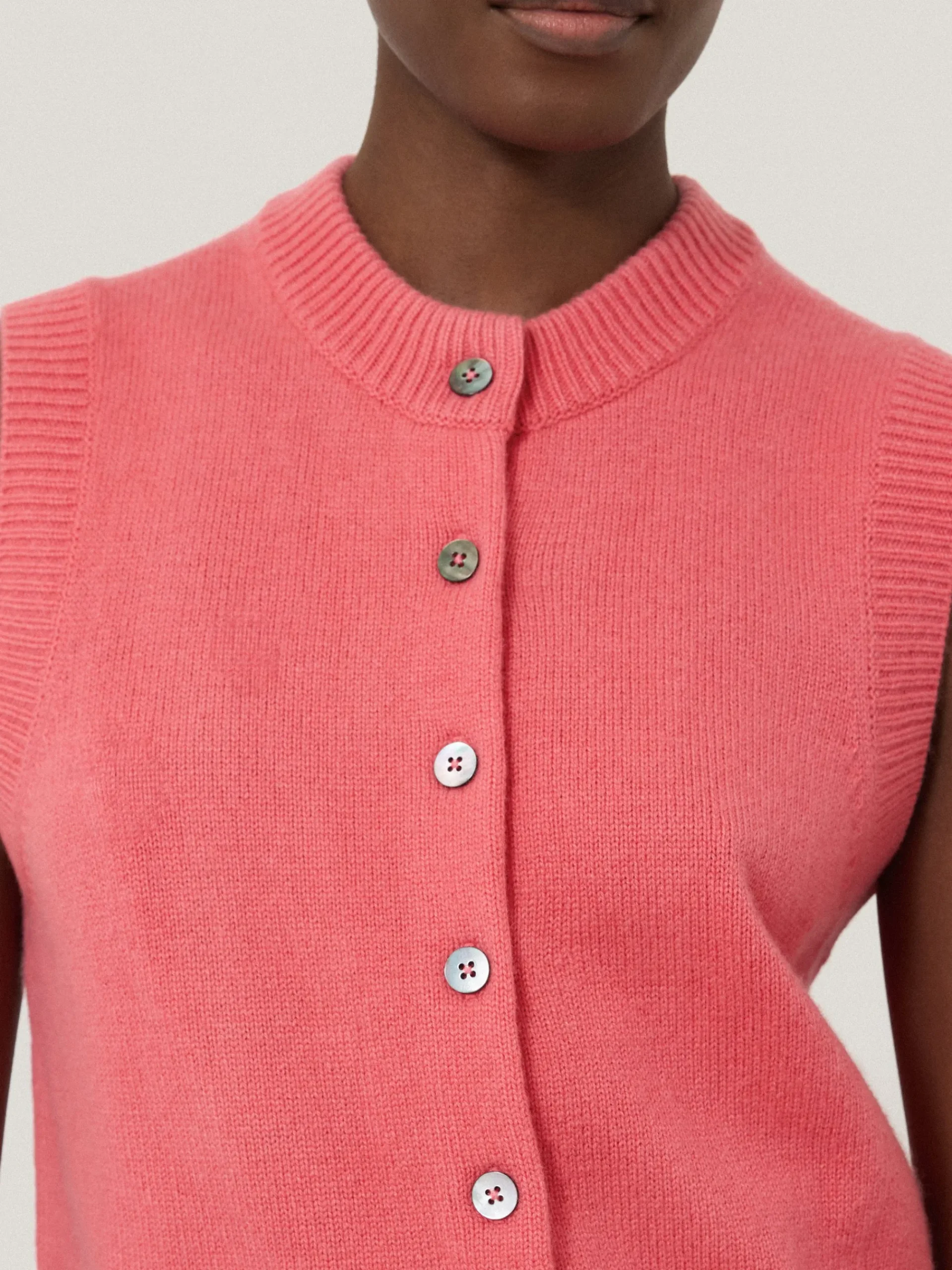 A versatile layering piece with endless outfit possibilities; this delightful waistcoat marries a classic crew neck tank shape with a chic button down front. Finished with natural Mother of Pearl buttons adds subtle iridescence to its cheerful hue.