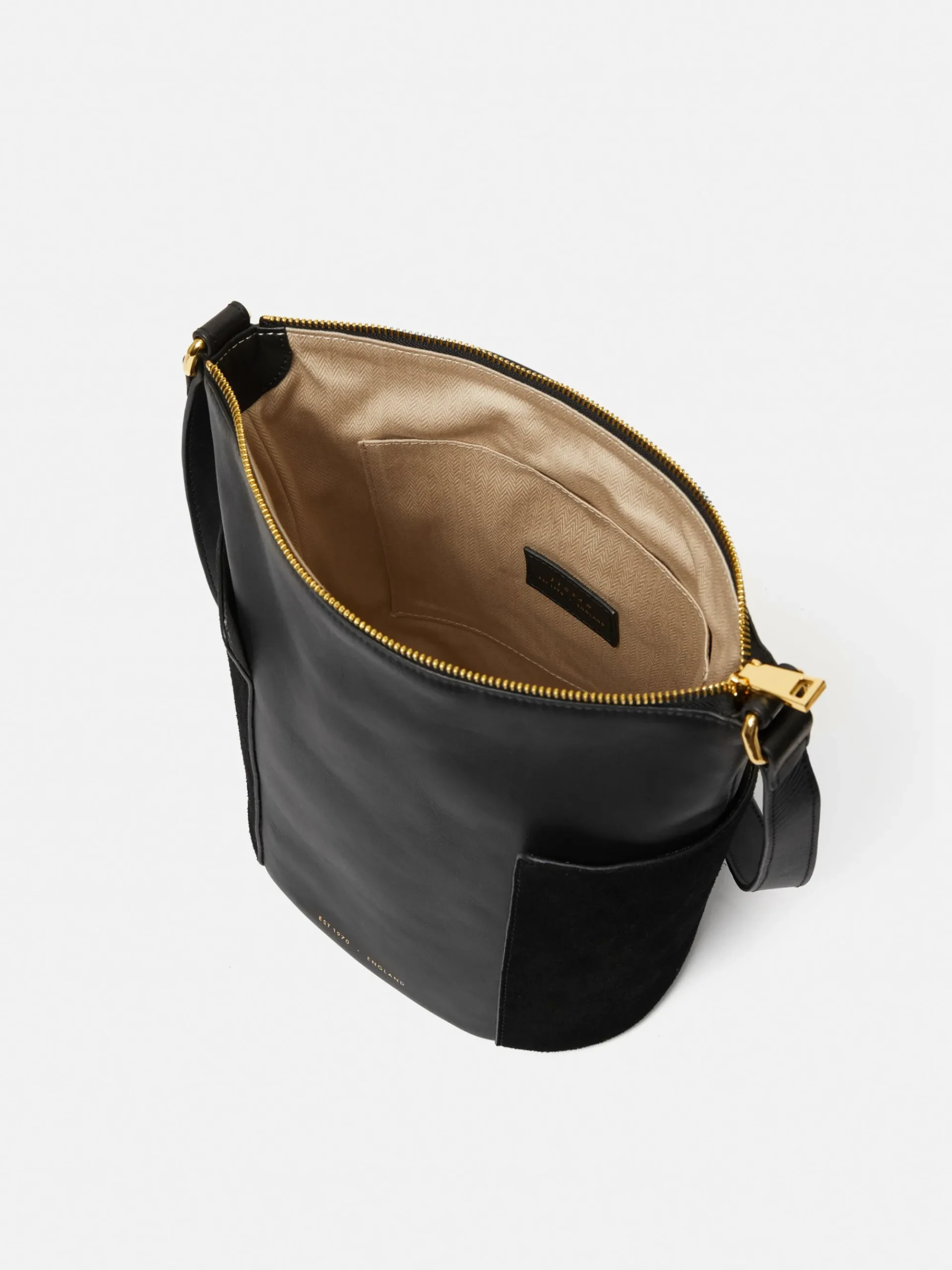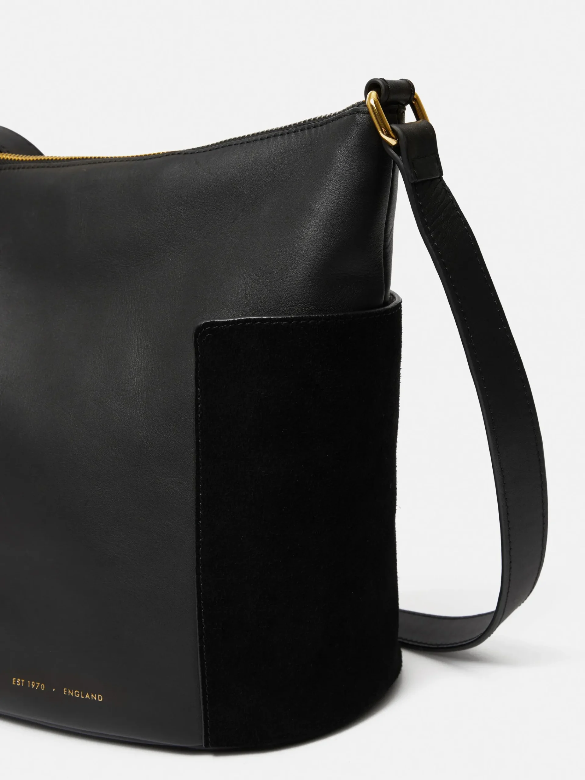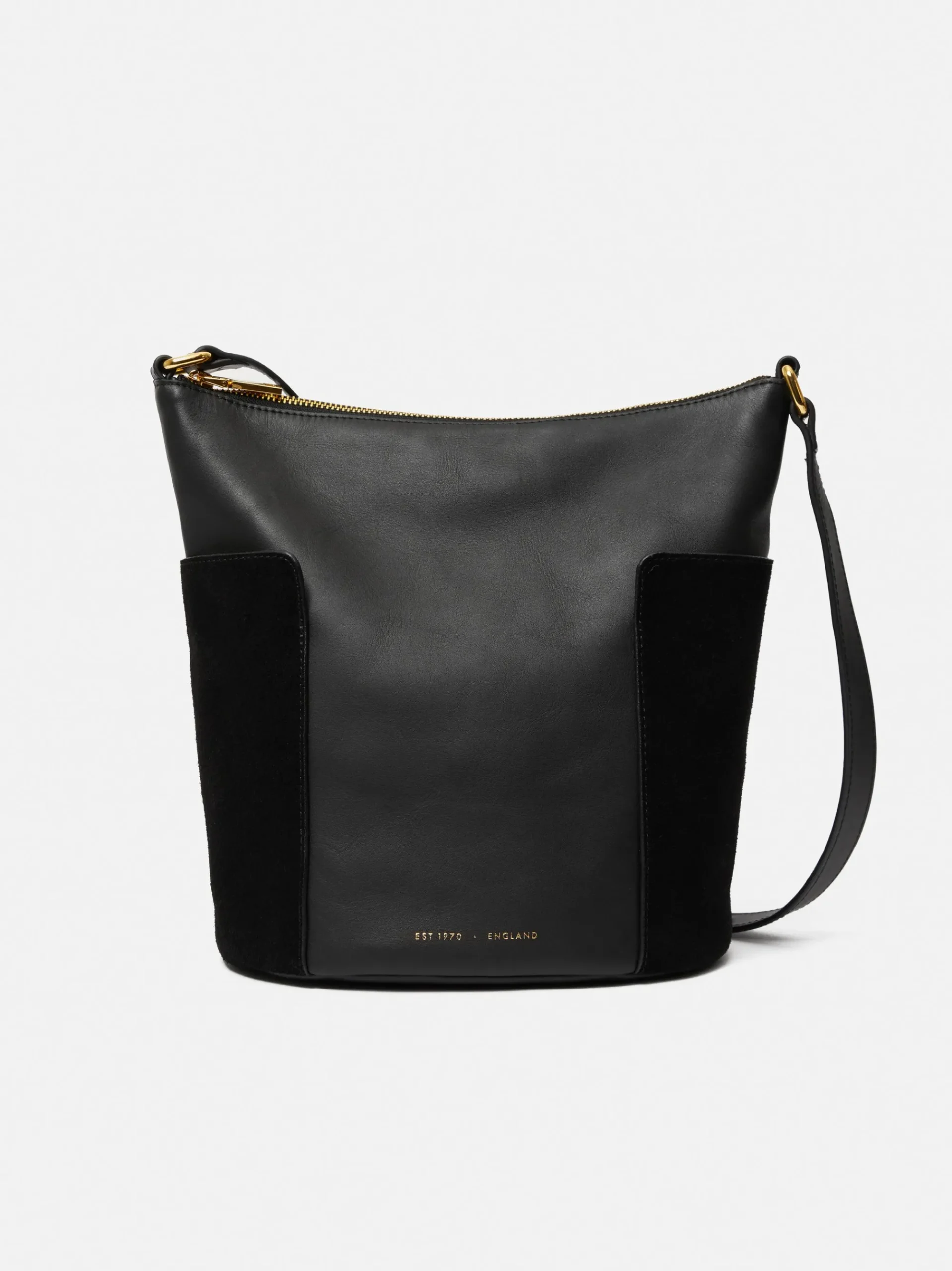 Our York black bucket bag combines function and ease for day-to-day wear. Crafted from a smooth and supple leather that ages beautifully over time, exterior suede panels can double up as two slip pockets, while the adjustable strap means you can wear as a shoulder or crossbody style.