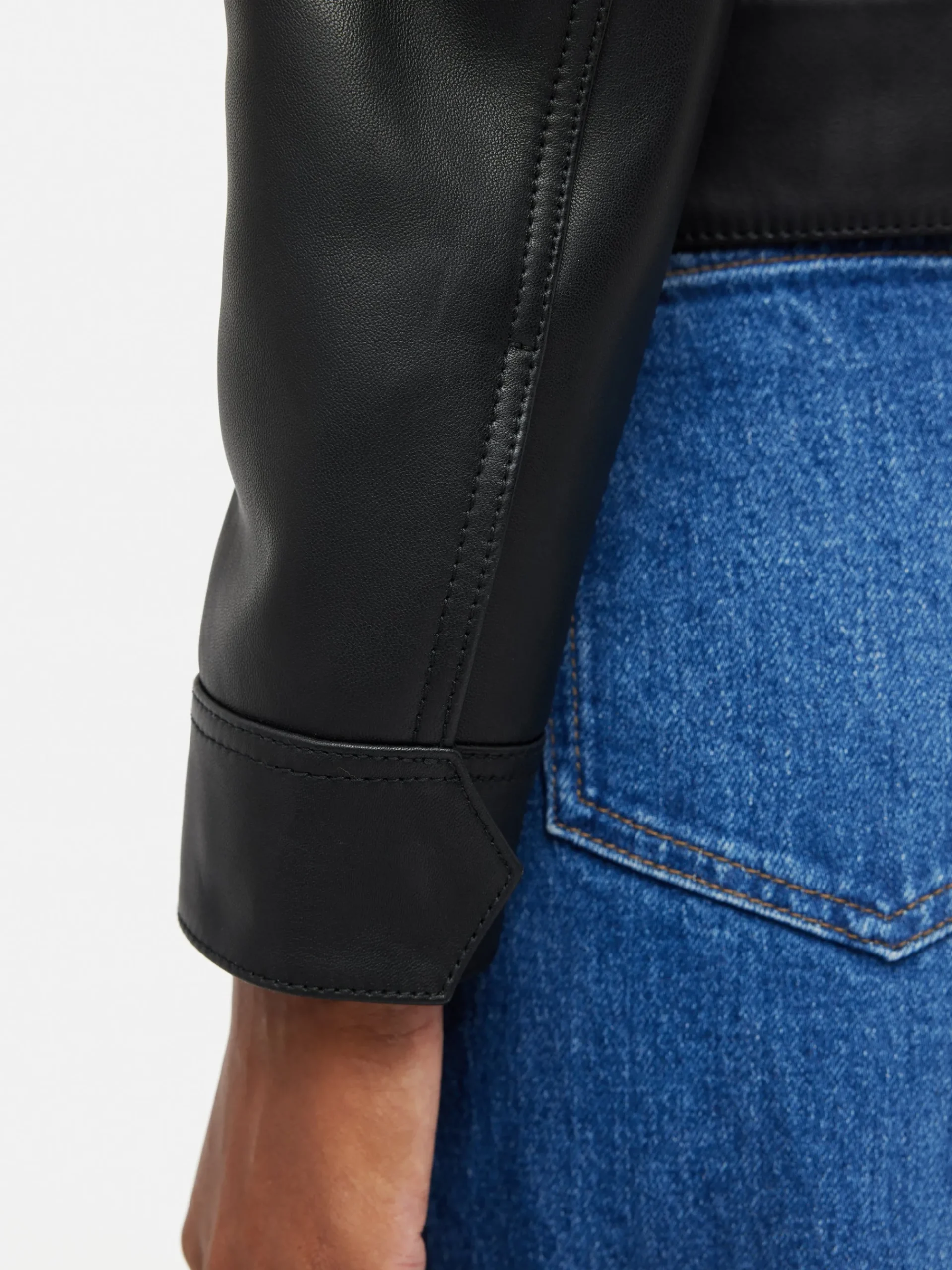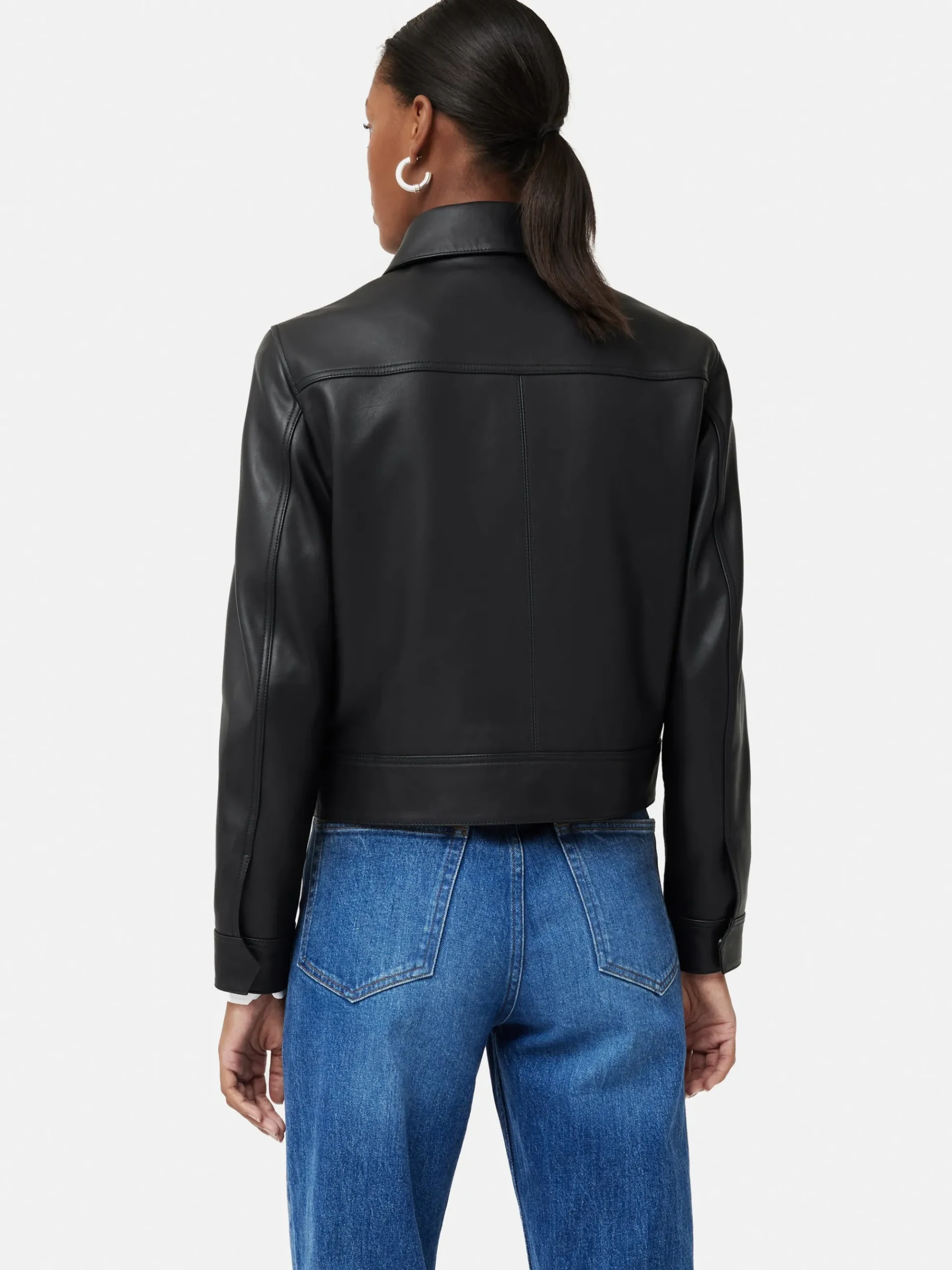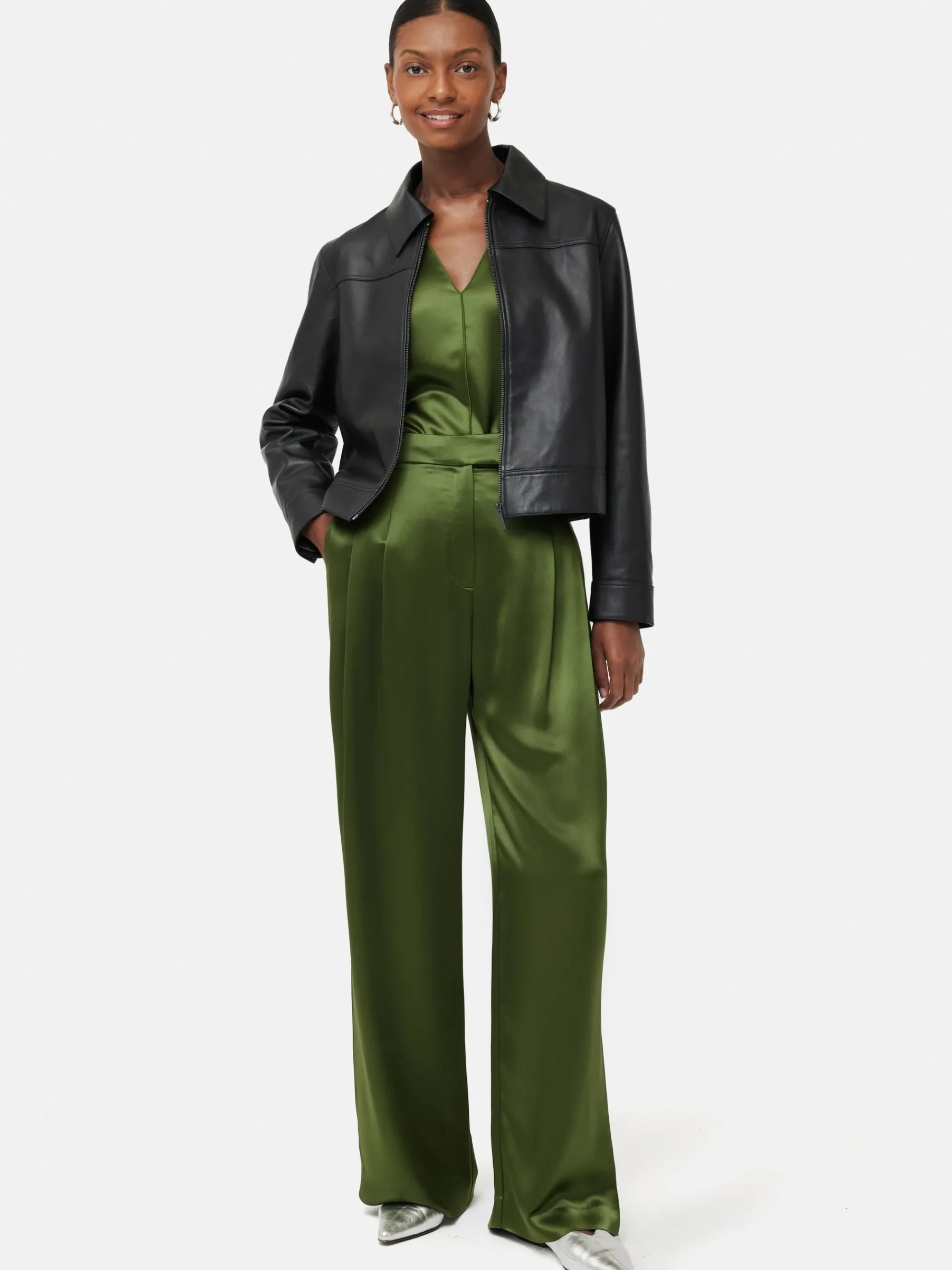 A classic biker jacket crafted from pure black Nappa leather. Fully lined short silhouette with a zip through front. Bracelet length sleeves fastened by magnetic closures. Style with Leather Wide Leg Trouser for the ultimate leather look, or over your everyday dress to add a bit of luxe. This style also arrives in statement silver leather.
